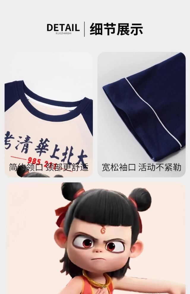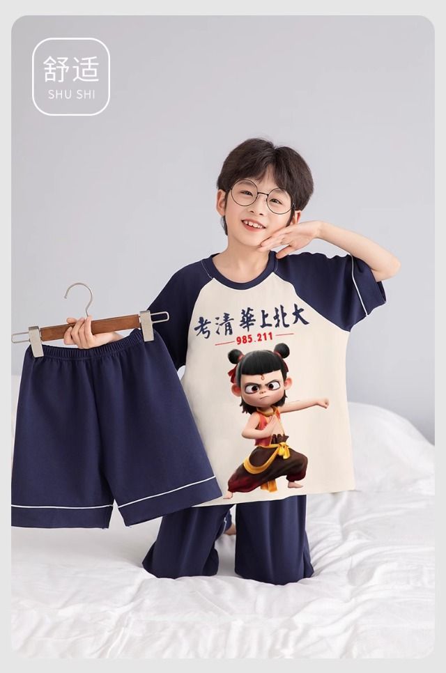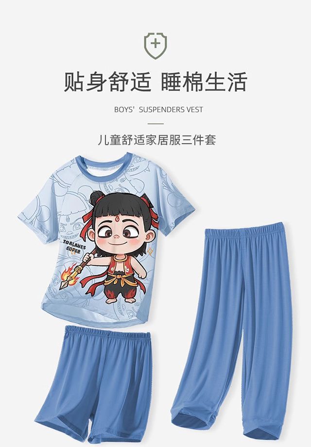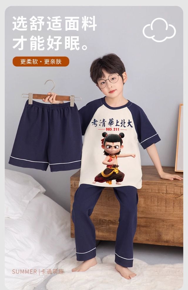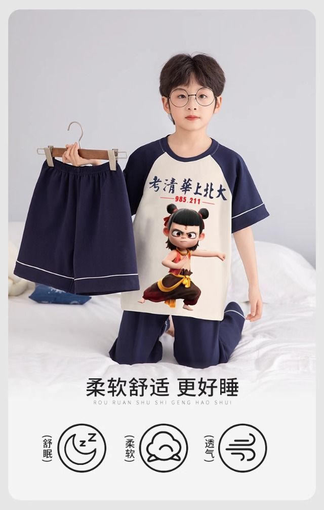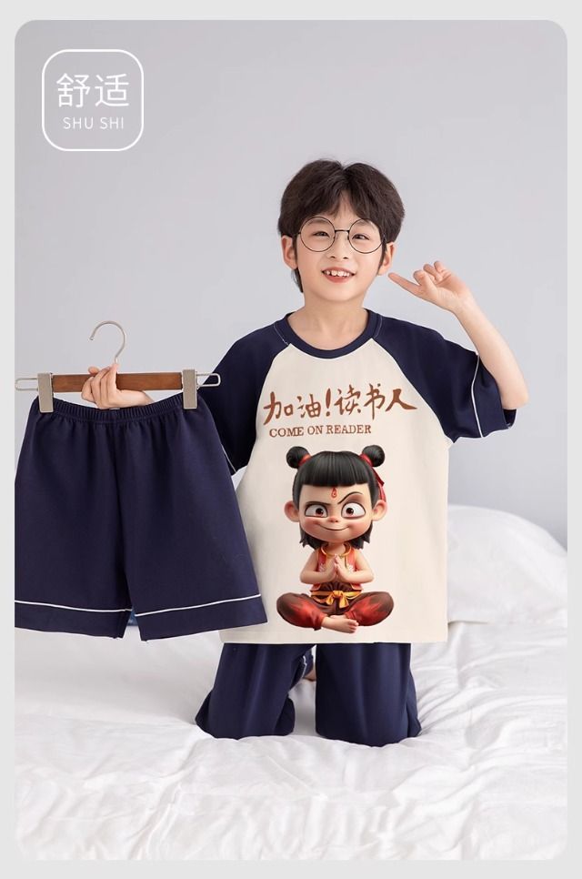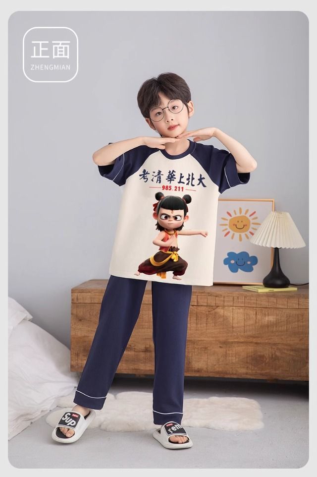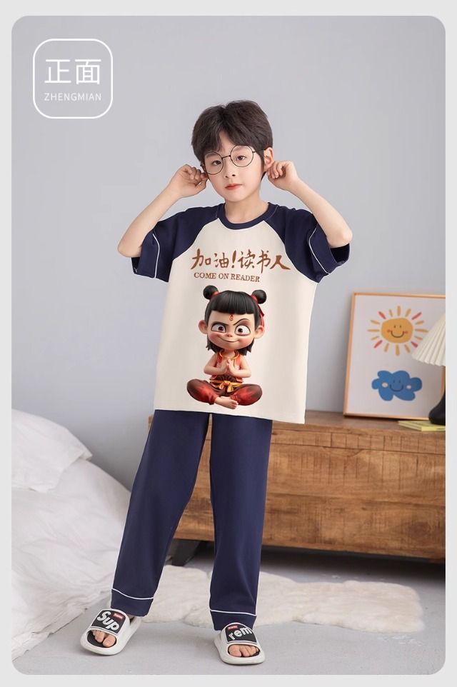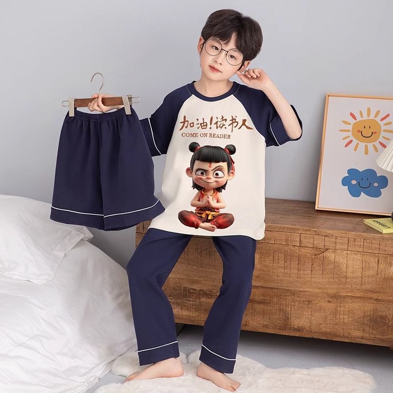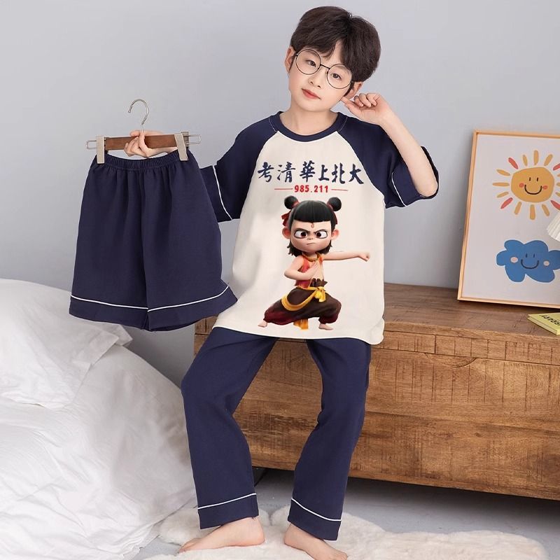 아동용 잠옷, 가정복 세트, 둥근 칼라 소년 잠옷, Nezha 잠옷, 풀오버 에어컨 의류, 만화 반팔 바지