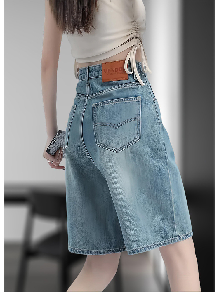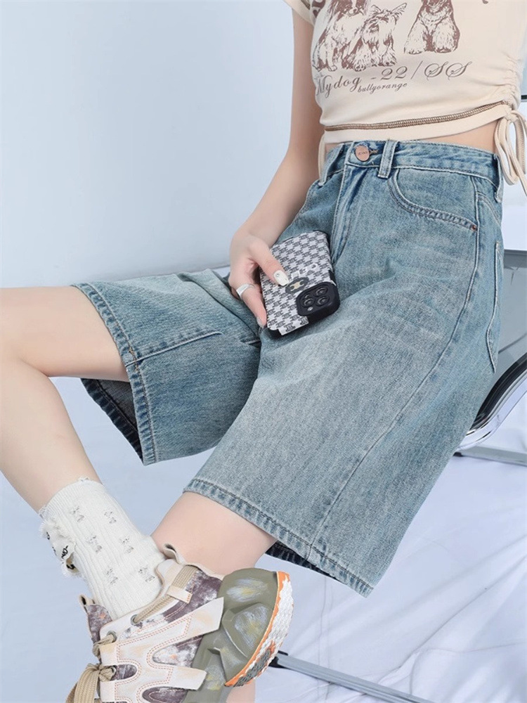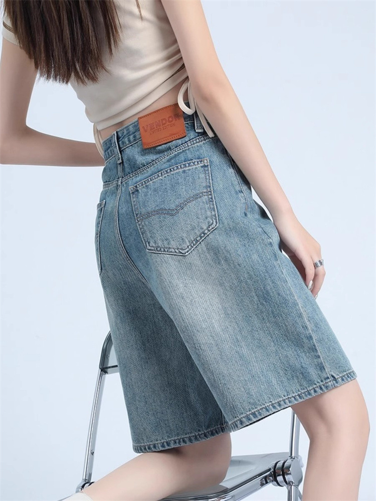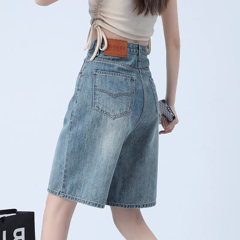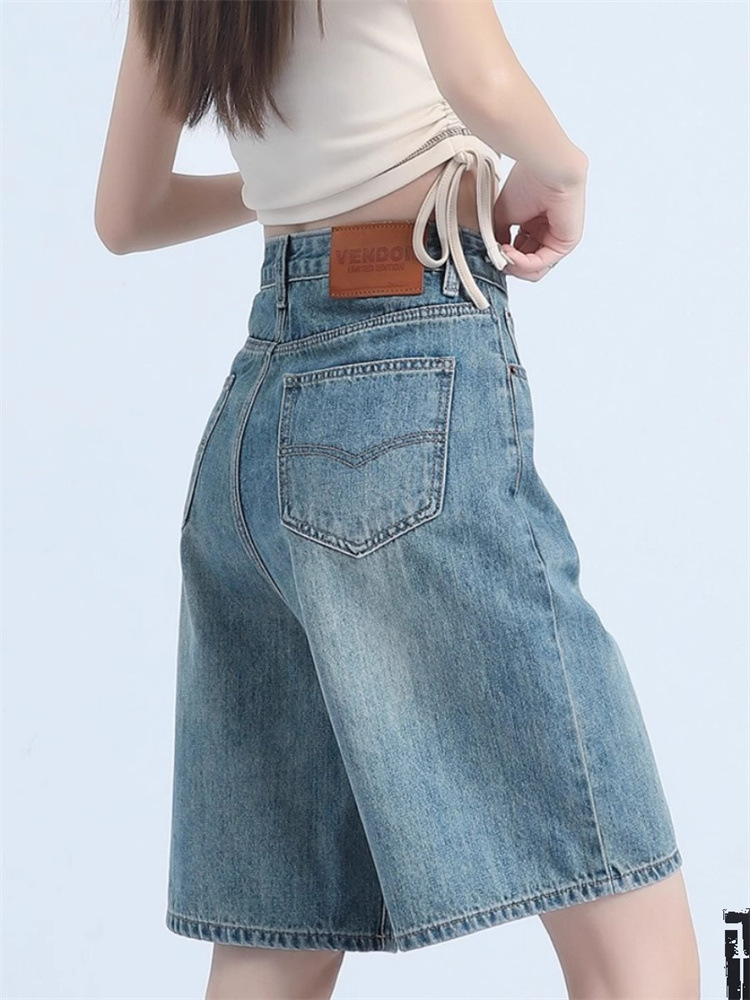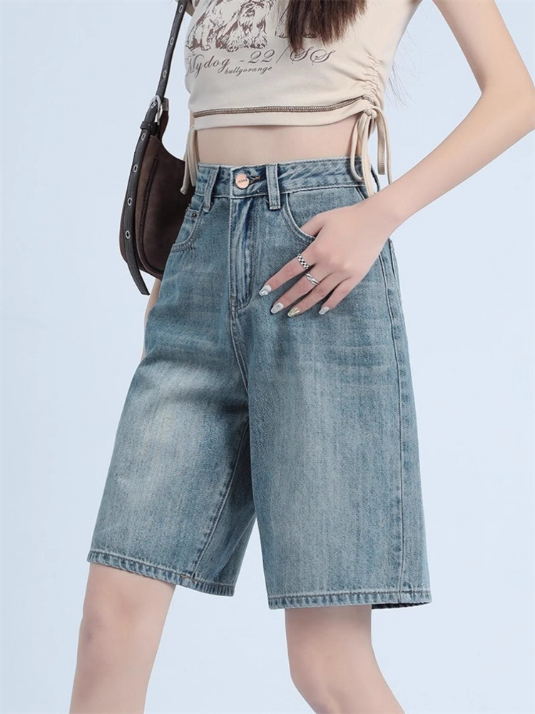 얇은 높은 허리 데님 반바지 여자 여름 복고풍 슬리밍 중간 길이 바지 느슨한 넓은 다리 스포츠 미국식 바지
