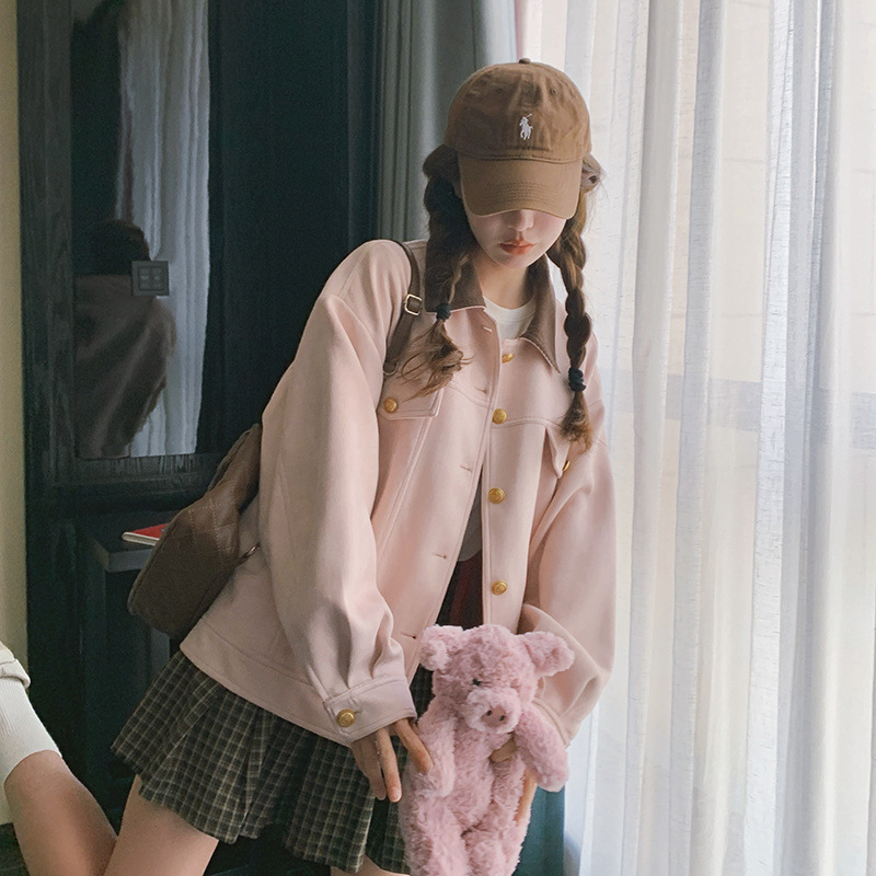 여성을위한 핑크 한국 스타일 재킷 봄, 가을 2024 새로운 스웨이드 디자인 세련되고 세련된 연령 감소 재킷 탑스토어 가기