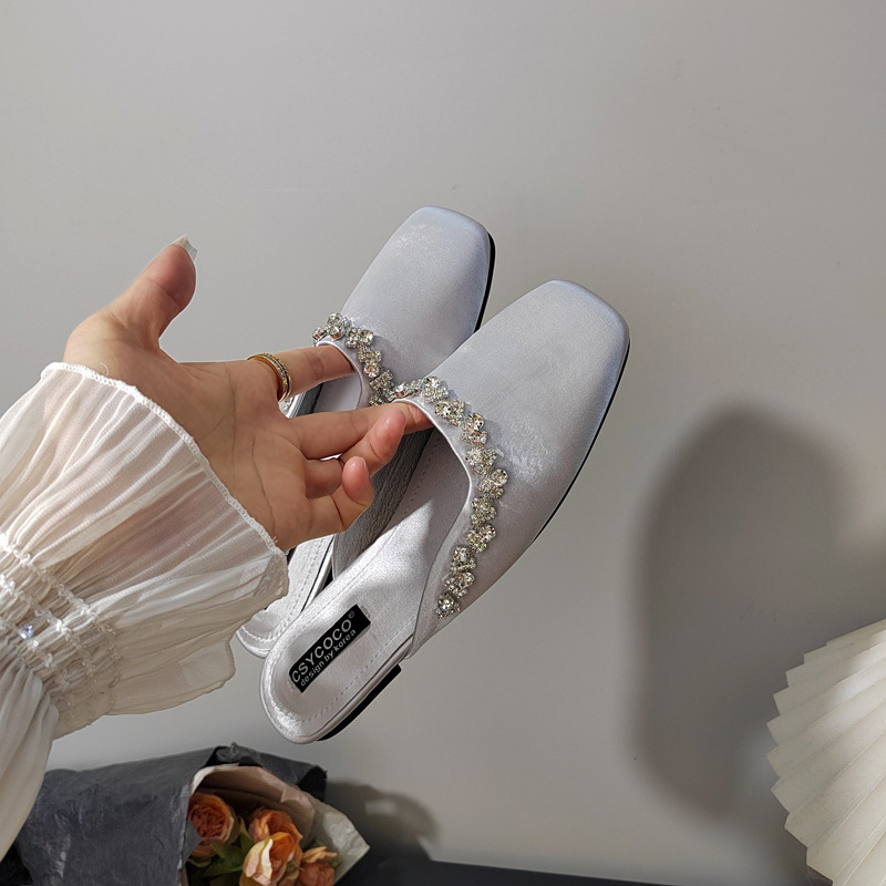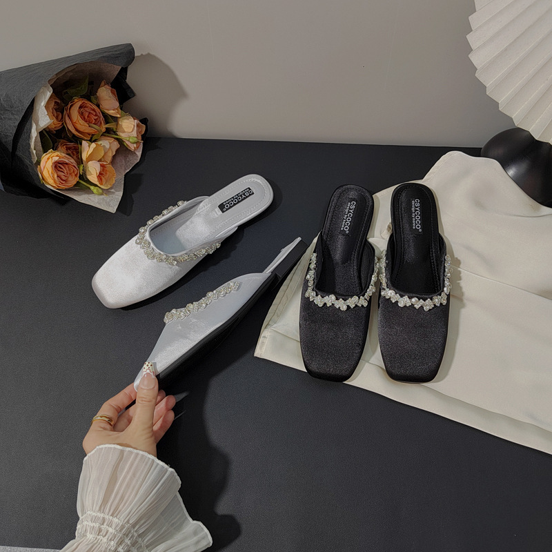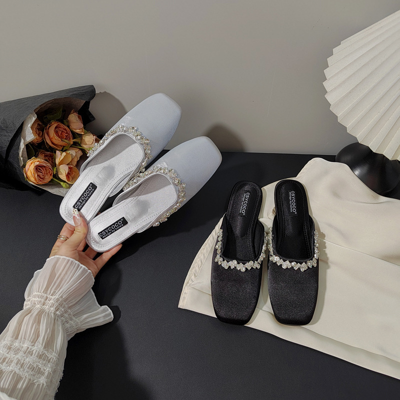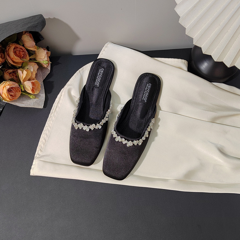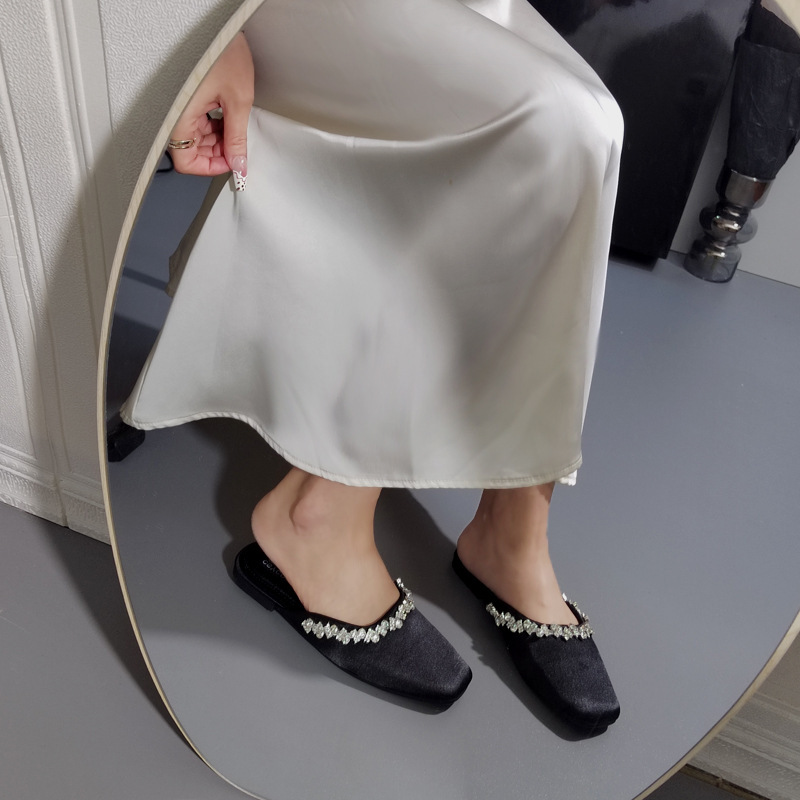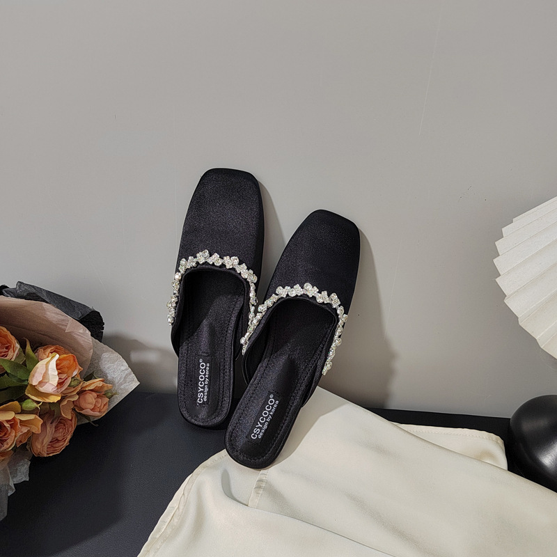 프렌치 라이트 럭셔리 블랙 새틴 반짝이는 라인스톤 스트립 스퀘어 토 플랫 뮬 슈즈 로얄 자매 스타일 바오터우 슬리퍼스토어 가기