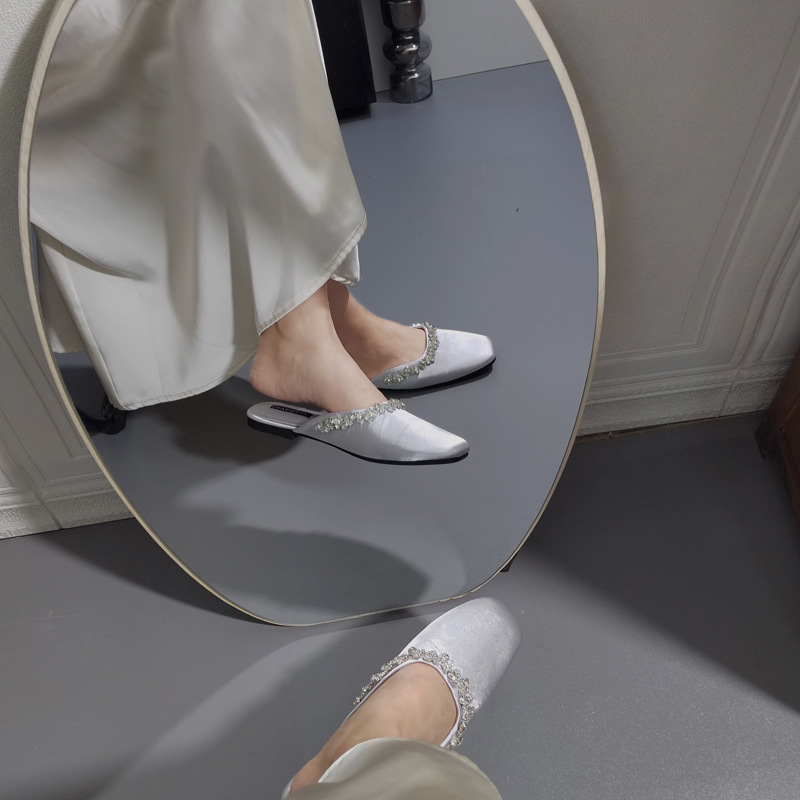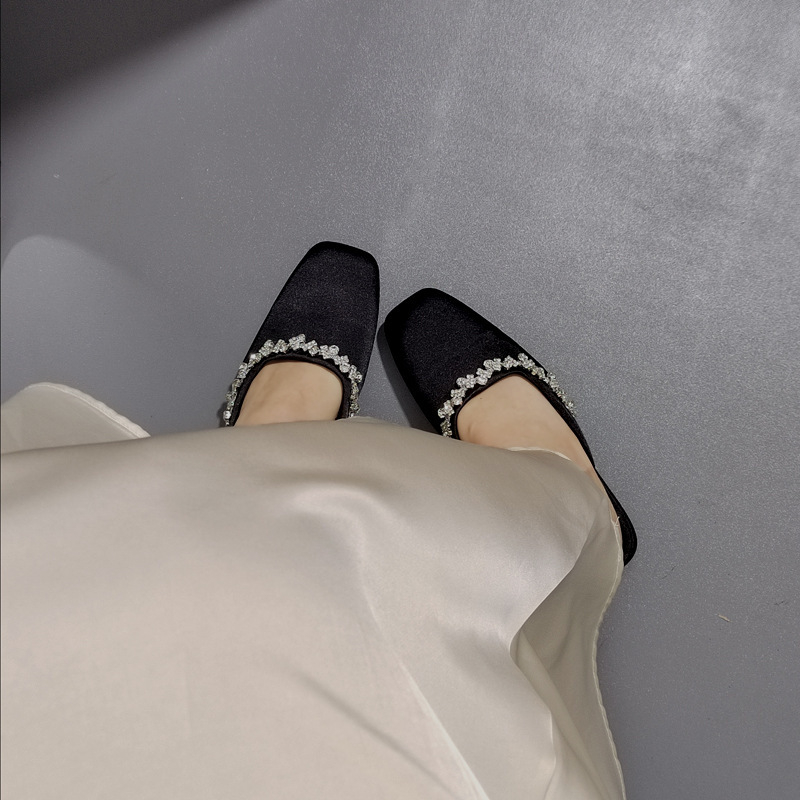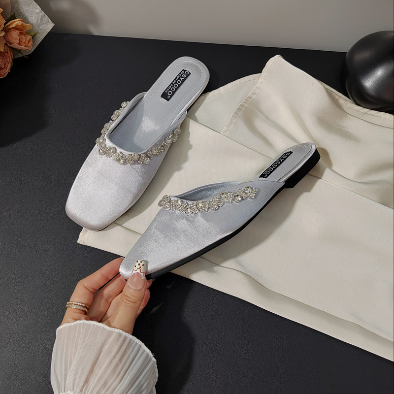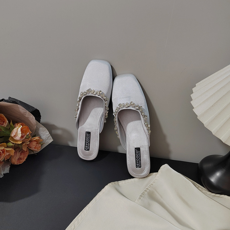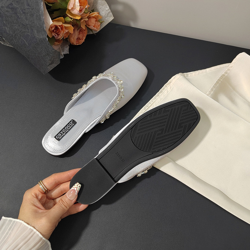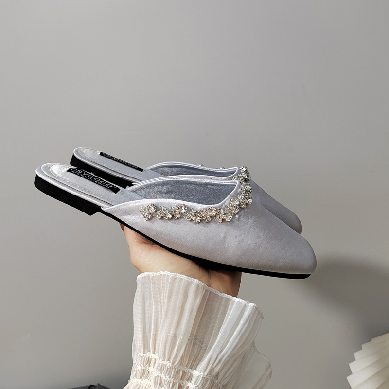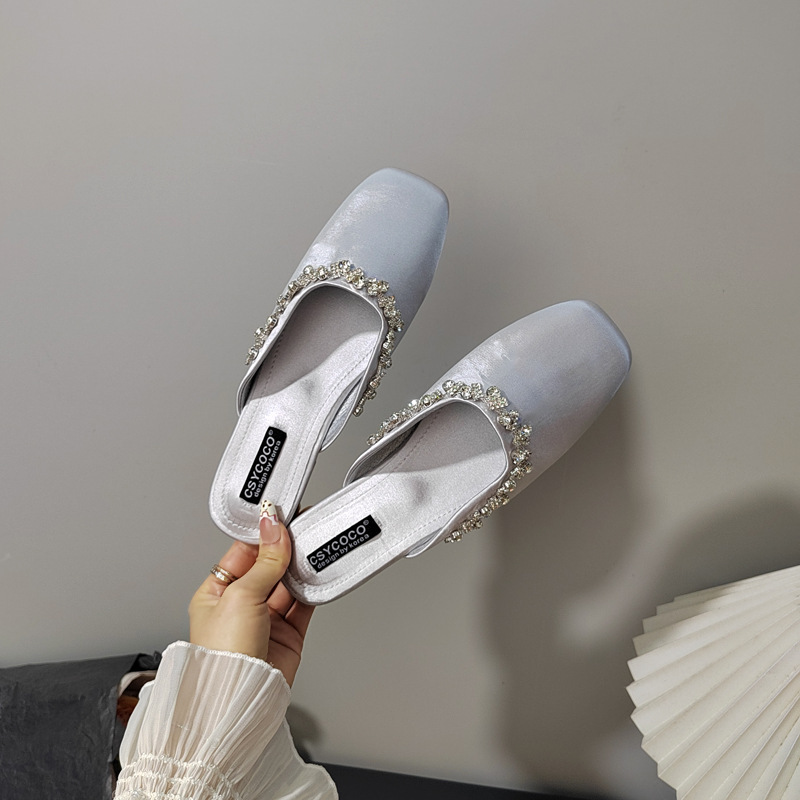 프렌치 라이트 럭셔리 블랙 새틴 반짝이는 라인스톤 스트립 스퀘어 토 플랫 뮬 슈즈 로얄 자매 스타일 바오터우 슬리퍼스토어 가기