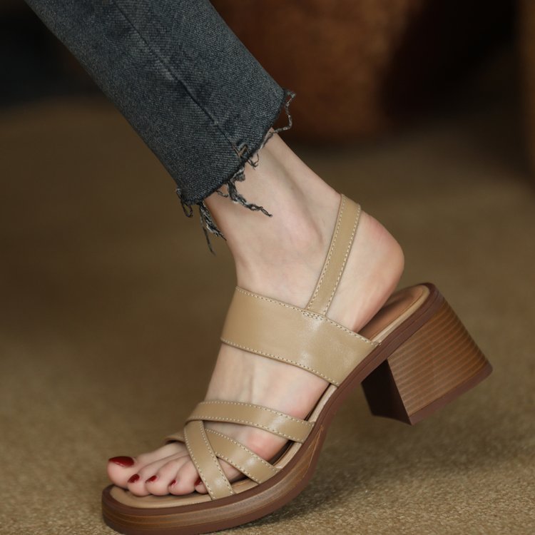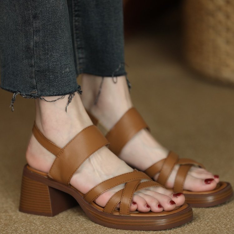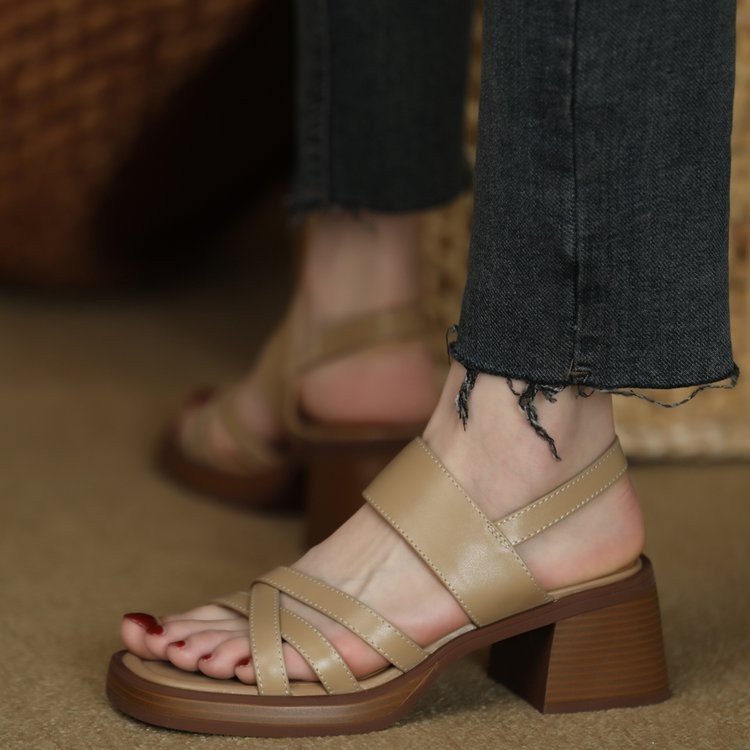 빈티지 크로스 오픈 발가락 두꺼운 힐 샌들 여자 2025 년 여름 새로운 미드 힐 여성 신발스토어 가기