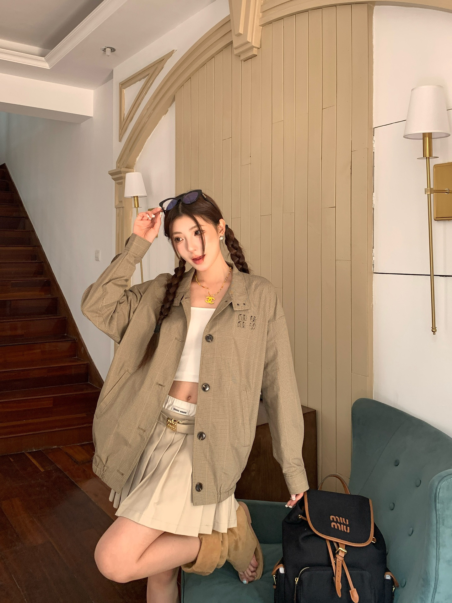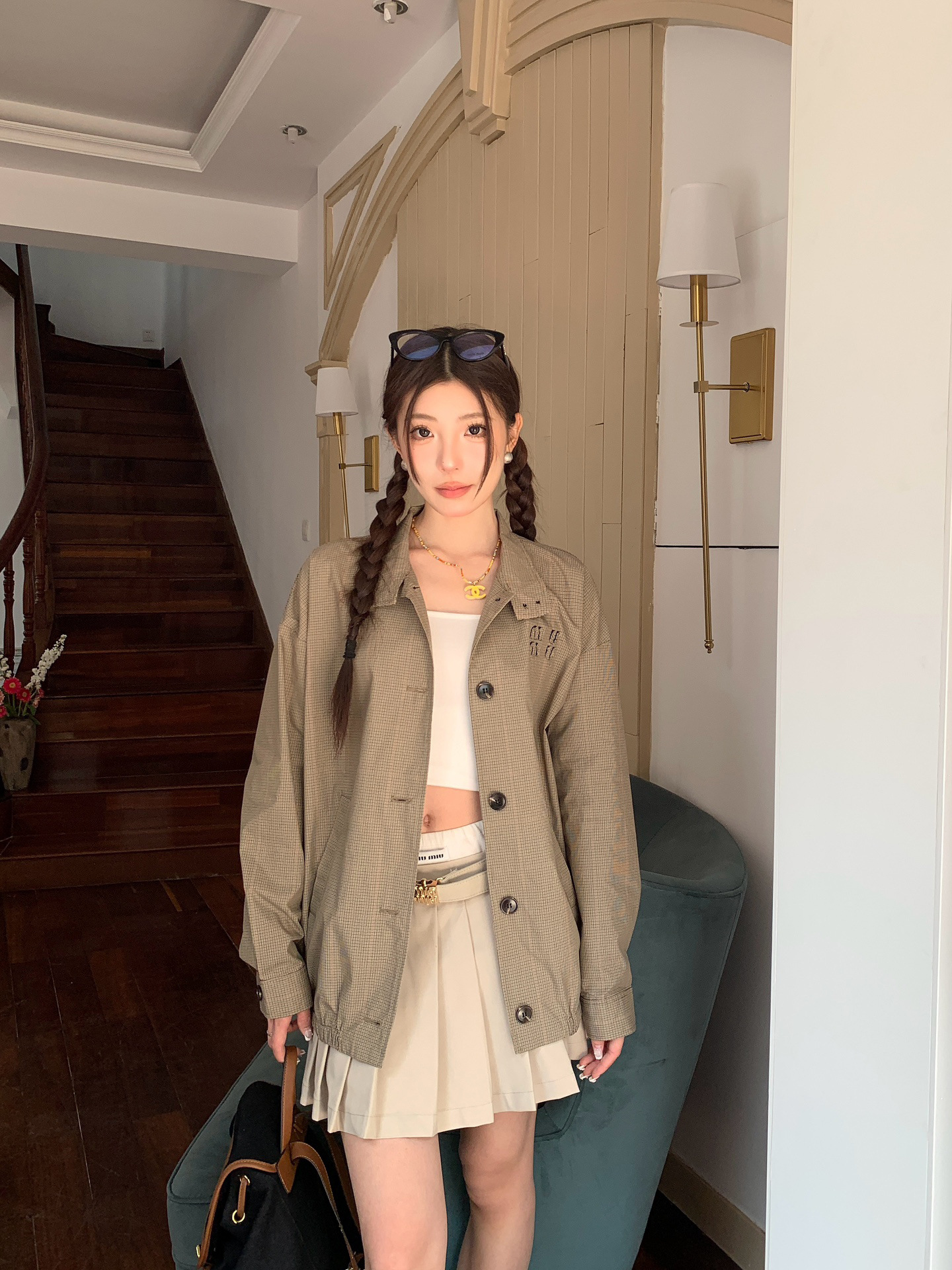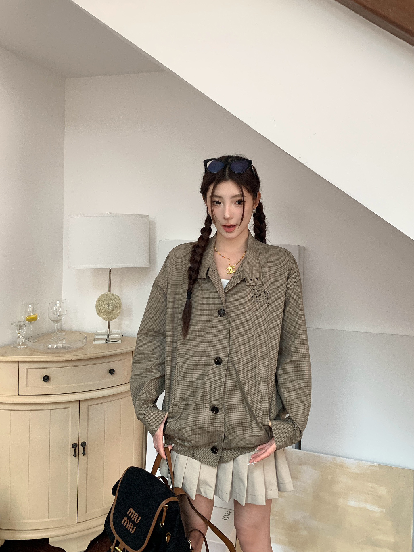 특가 상품은 반품, 교환이 불가합니다. 25 초가을 미우 체크무늬 로고 스타일 루즈핏 스탠드 칼라 재킷 여성용스토어 가기