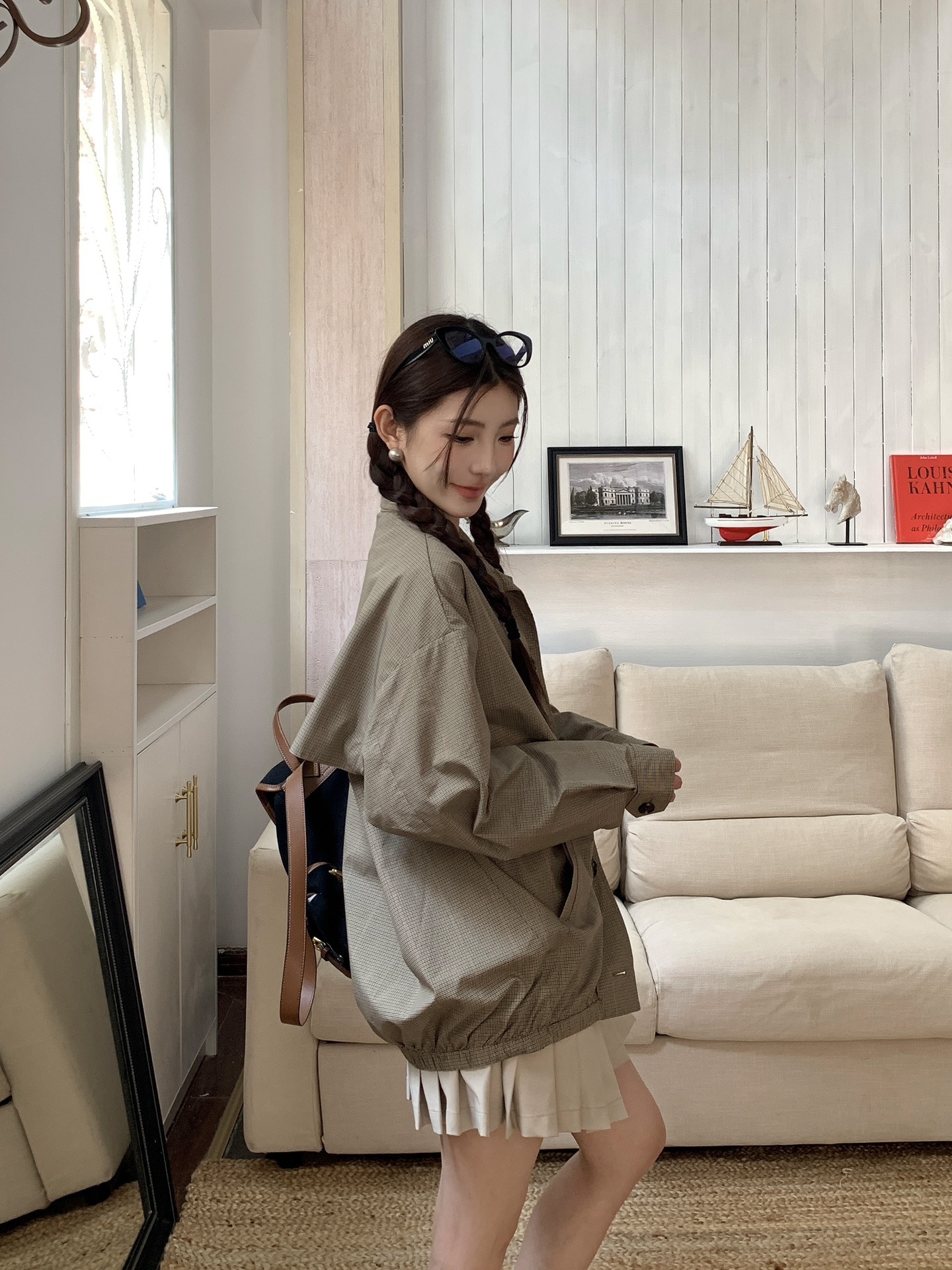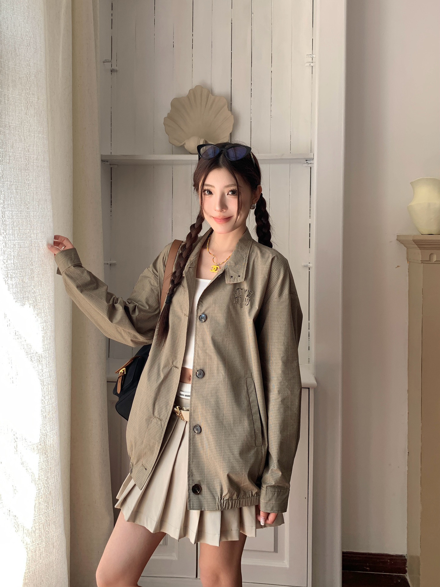 특가 상품은 반품, 교환이 불가합니다. 25 초가을 미우 체크무늬 로고 스타일 루즈핏 스탠드 칼라 재킷 여성용