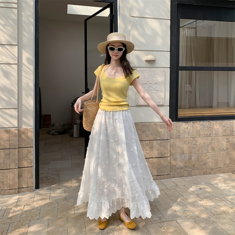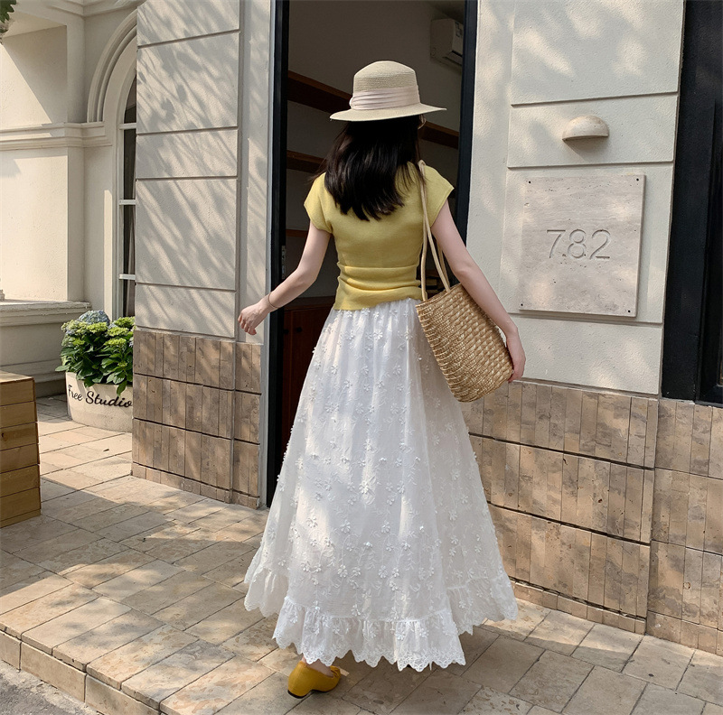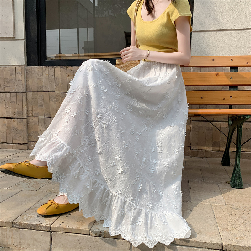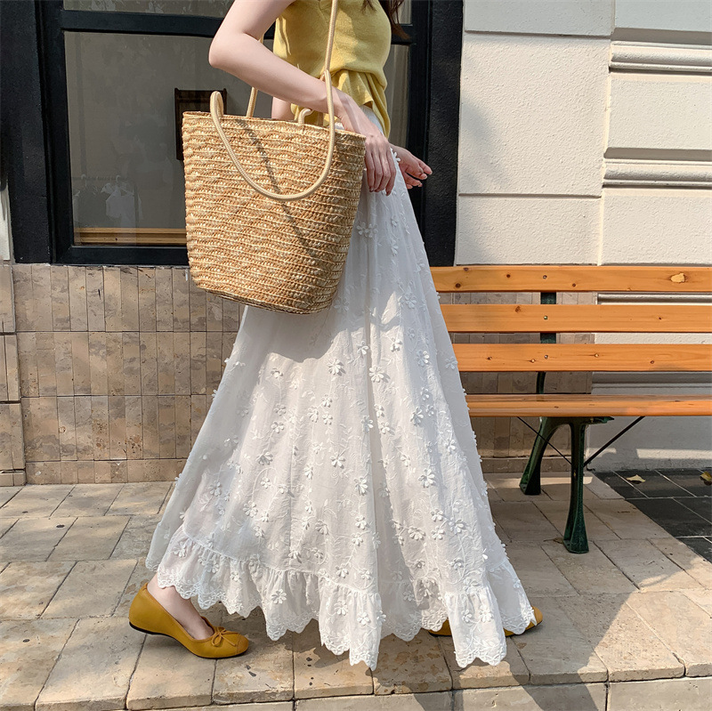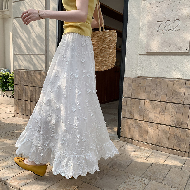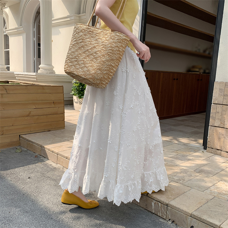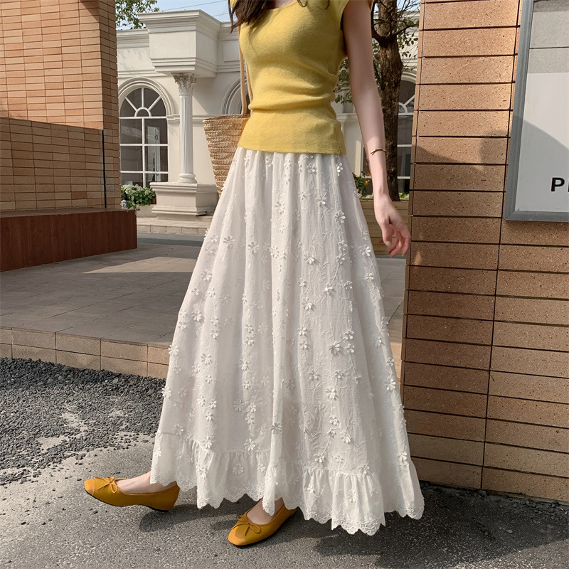 리얼 샷 중공업 3 차원 꽃 화이트 스커트 여성의 봄과 가을 한국 스커트 높은 허리 슬리밍 긴 스커트