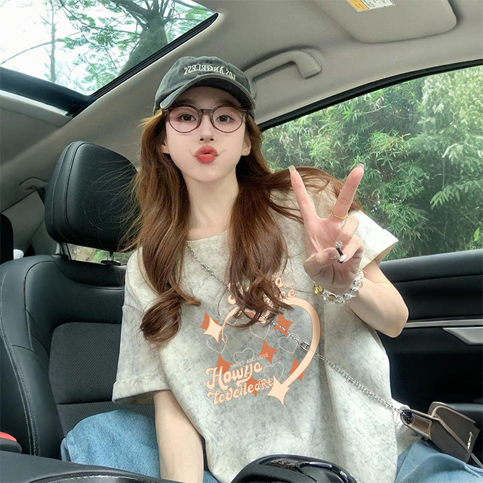 Ins 한국식 편지 인쇄 느슨한 반팔 티셔츠 여성용 여름 도파민 넥타이 염색 슬림 룩 에이지 감소 올 매치 탑 트렌디