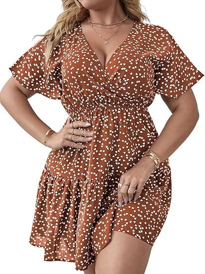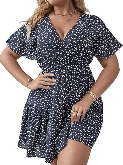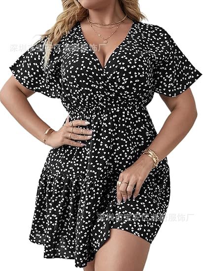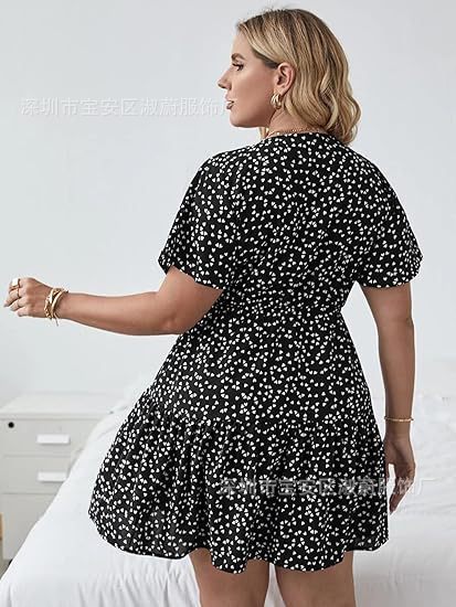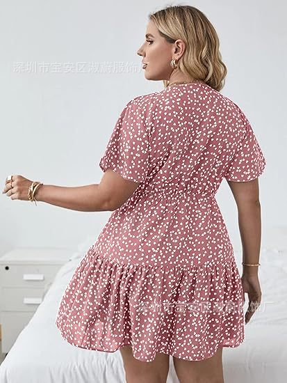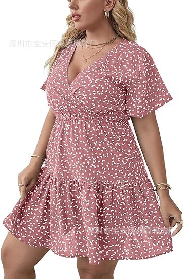 2025 아마존 이베이 유럽과 미국 국경 여성 플러스 사이즈 V-넥 러플 짧은 소매 랩 인쇄 원피스스토어 가기