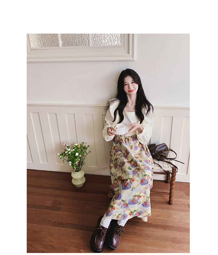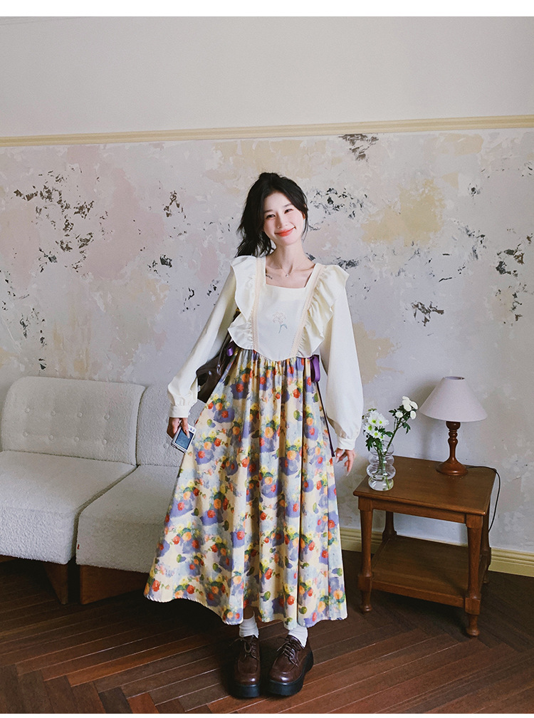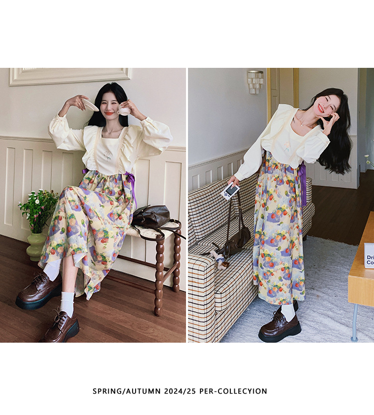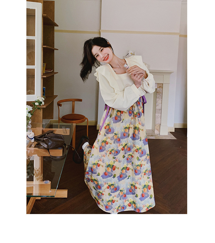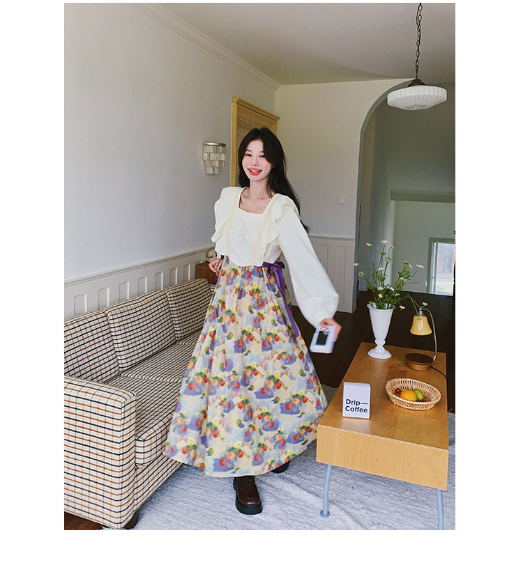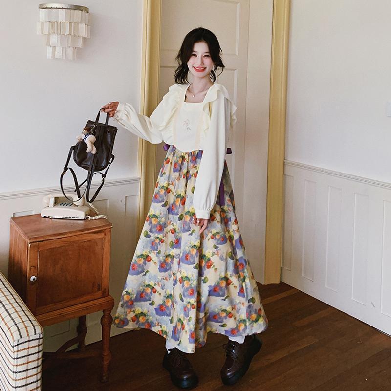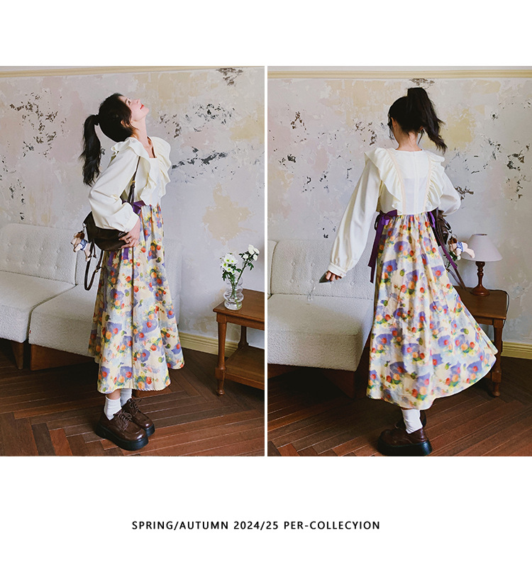 달콤한 시대를 줄이는 2025 프랑스 원피스 봄 및 가을 새로운 부드러운 Platycodon grandiflorum 차 휴식 긴 원피스 인쇄 디자인 센스 유화스토어 가기
