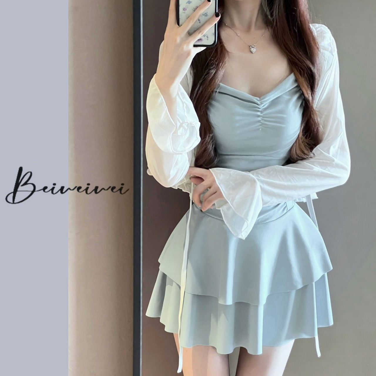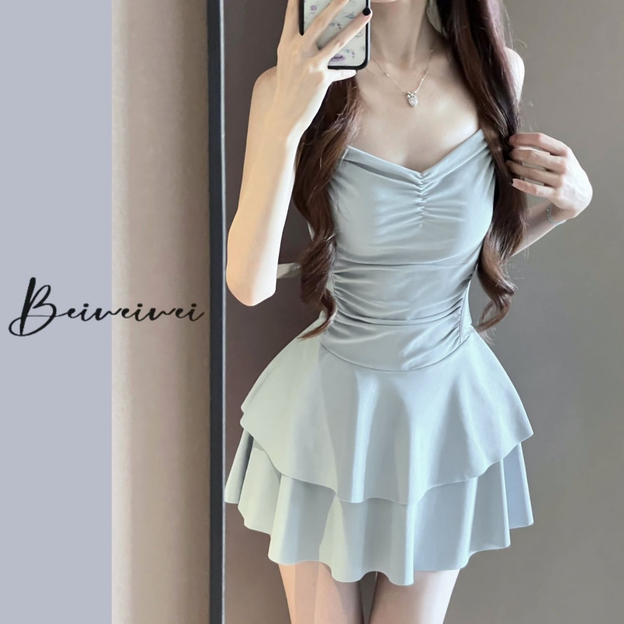 소스 팩토리 밀키 마카롱 블루 소녀 수영복 여성 원피스 스커트 스타일 퓨어 러스틱 스타일 백리스 가슴 패드
