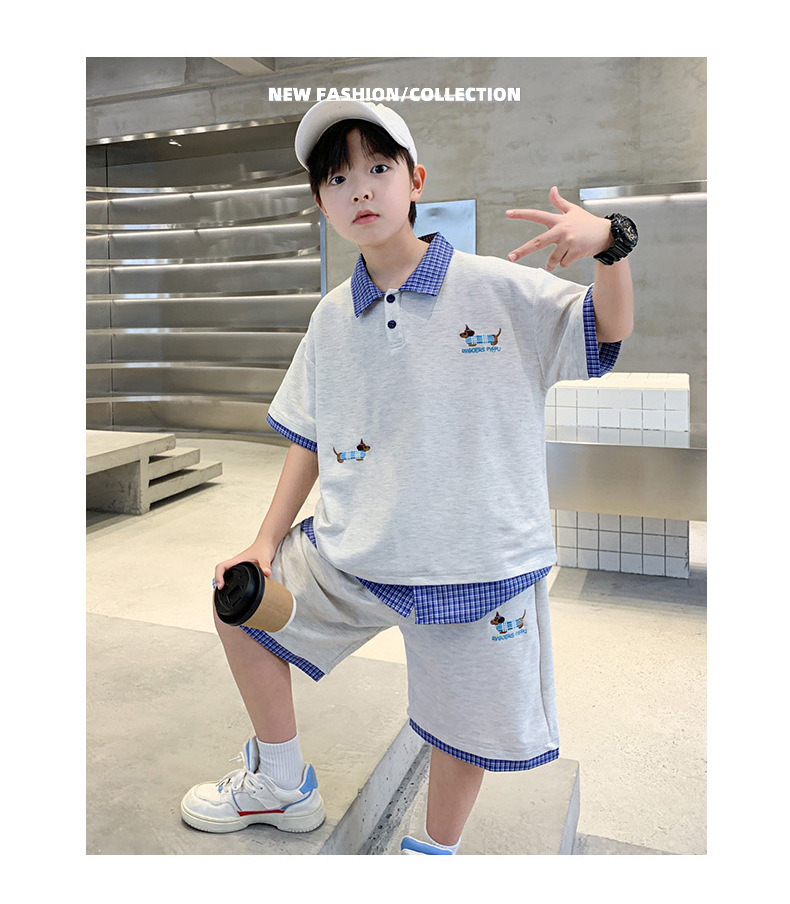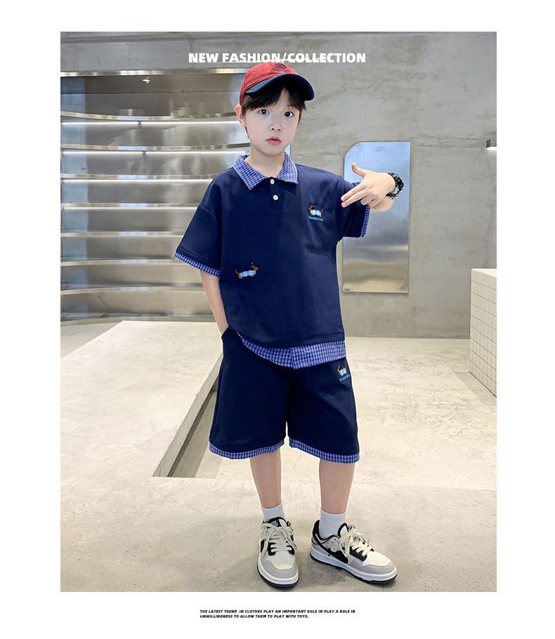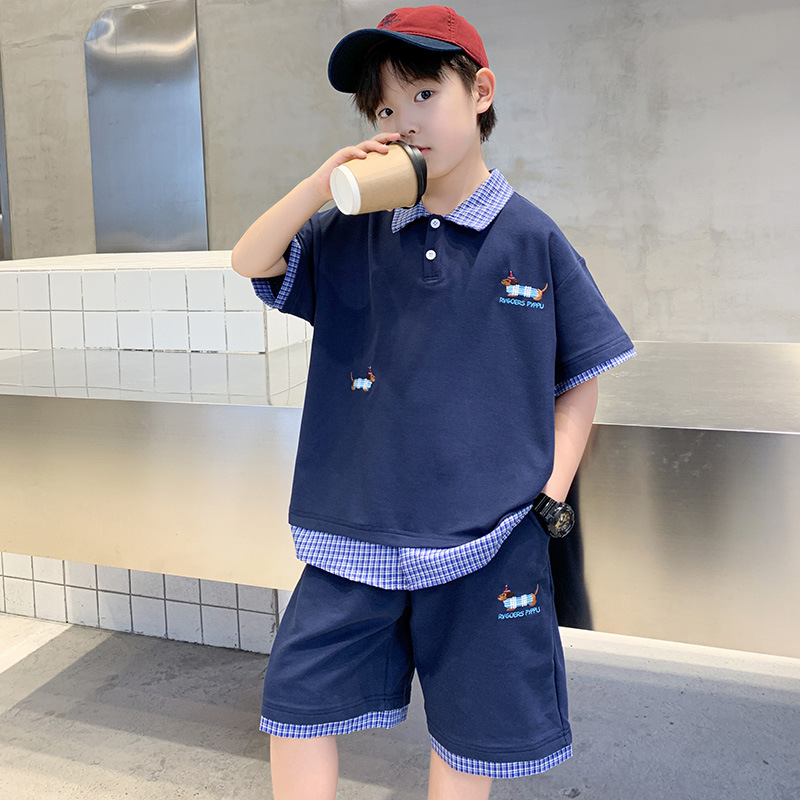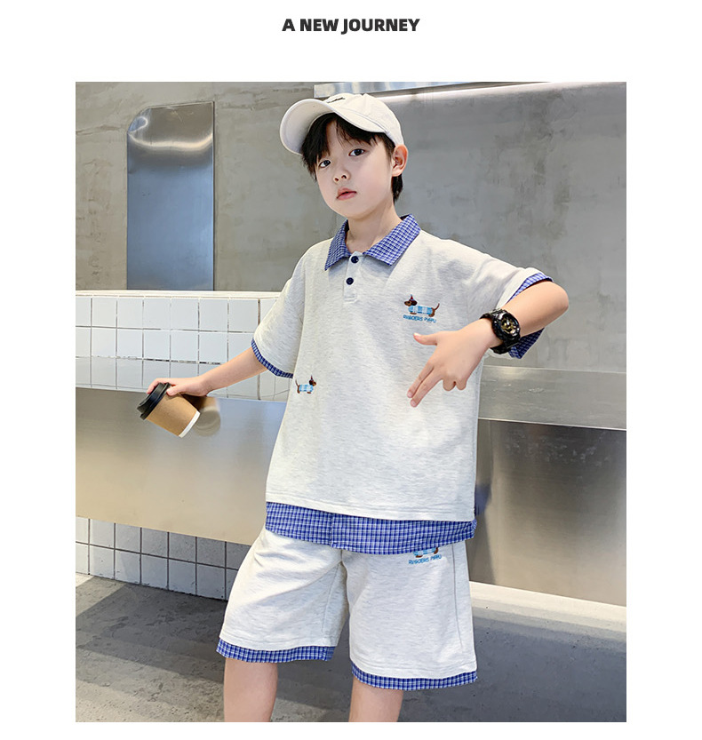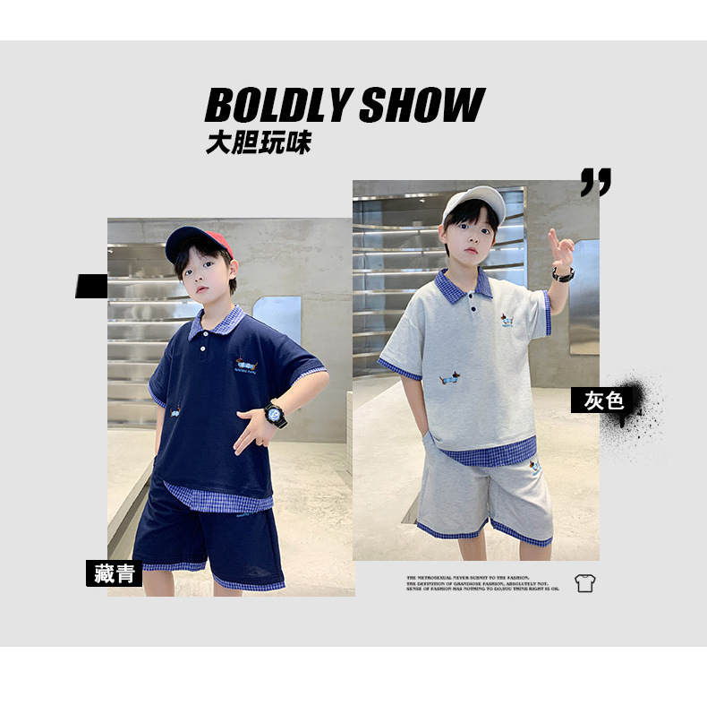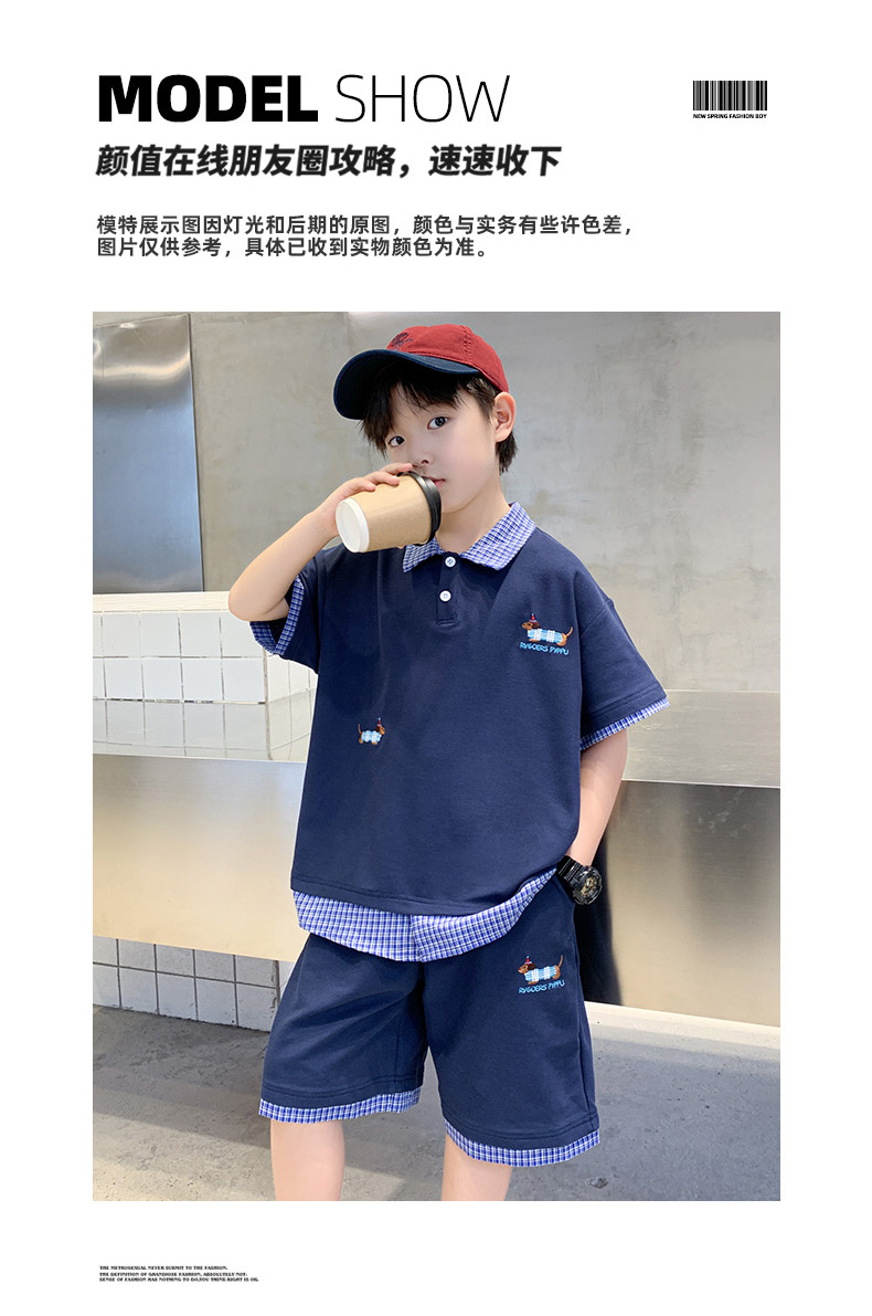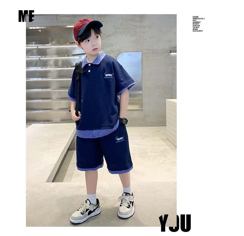 남학생 가짜 투피스 콘트라스트 폴로 셔츠 반팔 세트 2025 년 새 학문 여름 루즈 캐주얼 투피스 세트