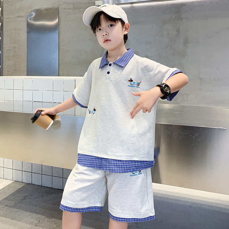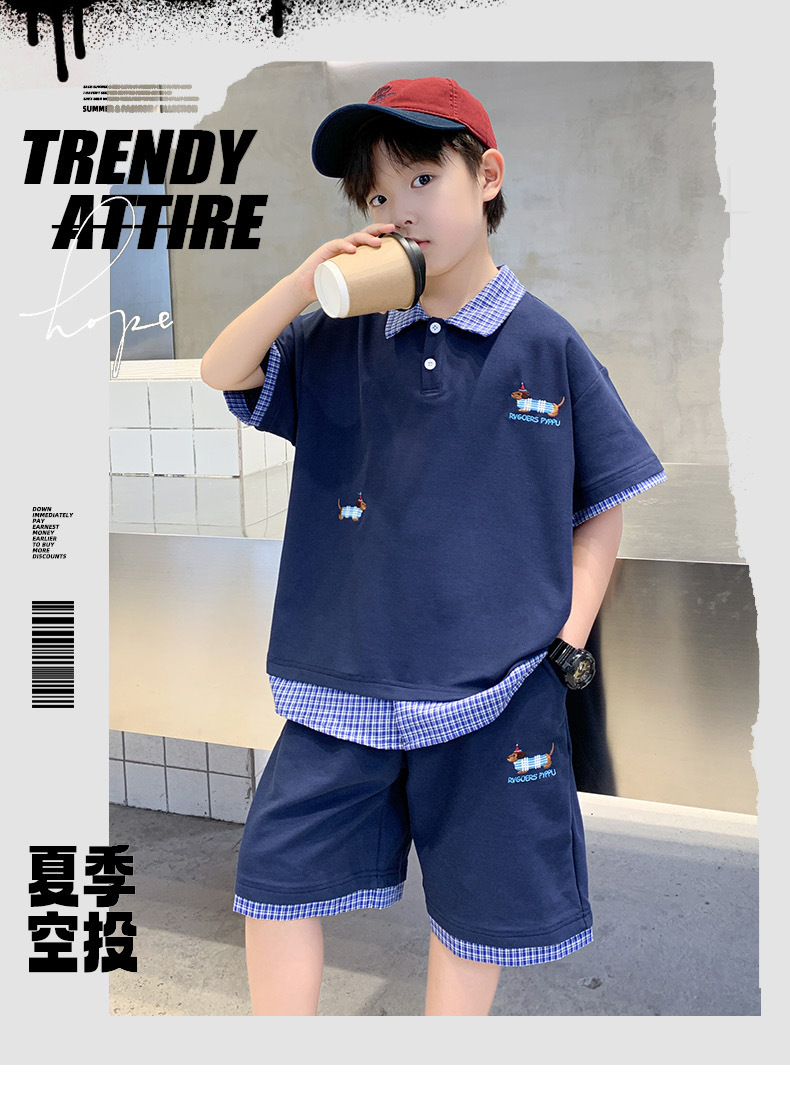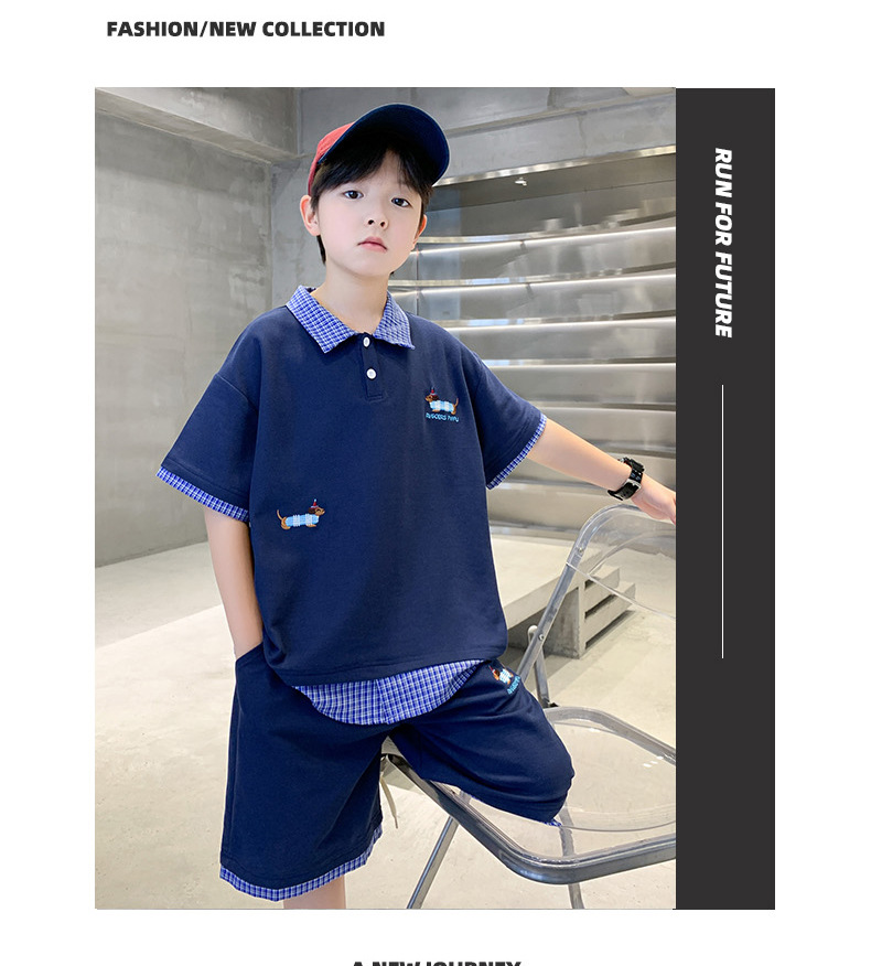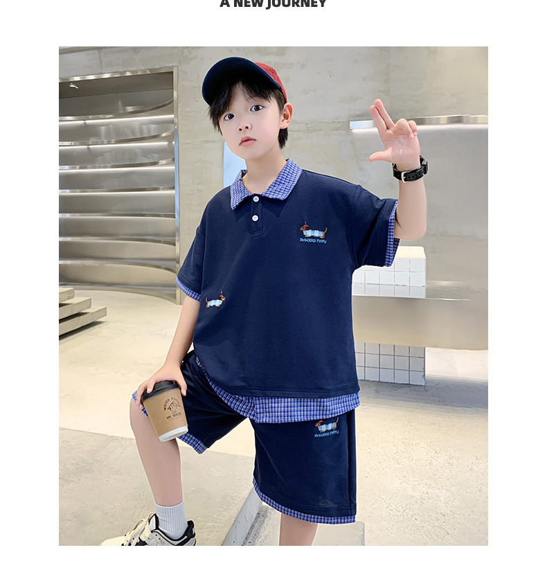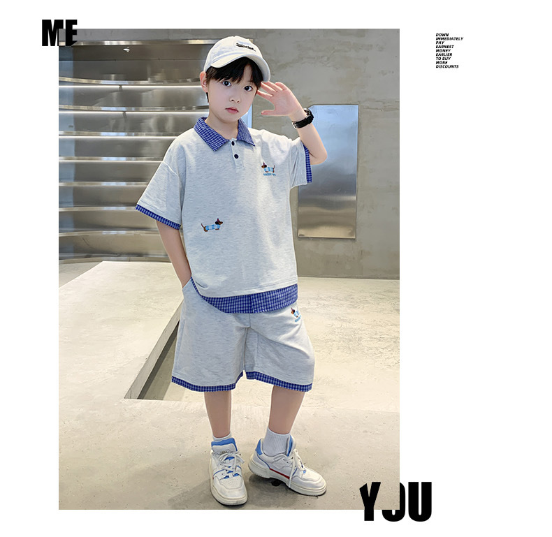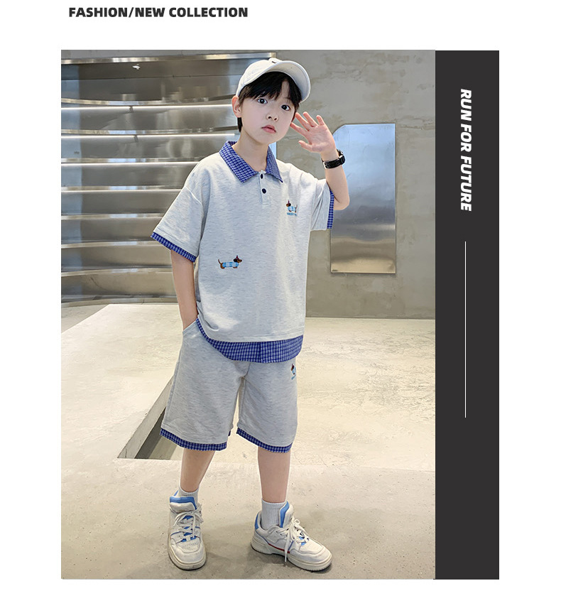 남학생 가짜 투피스 콘트라스트 폴로 셔츠 반팔 세트 2025 년 새 학문 여름 루즈 캐주얼 투피스 세트