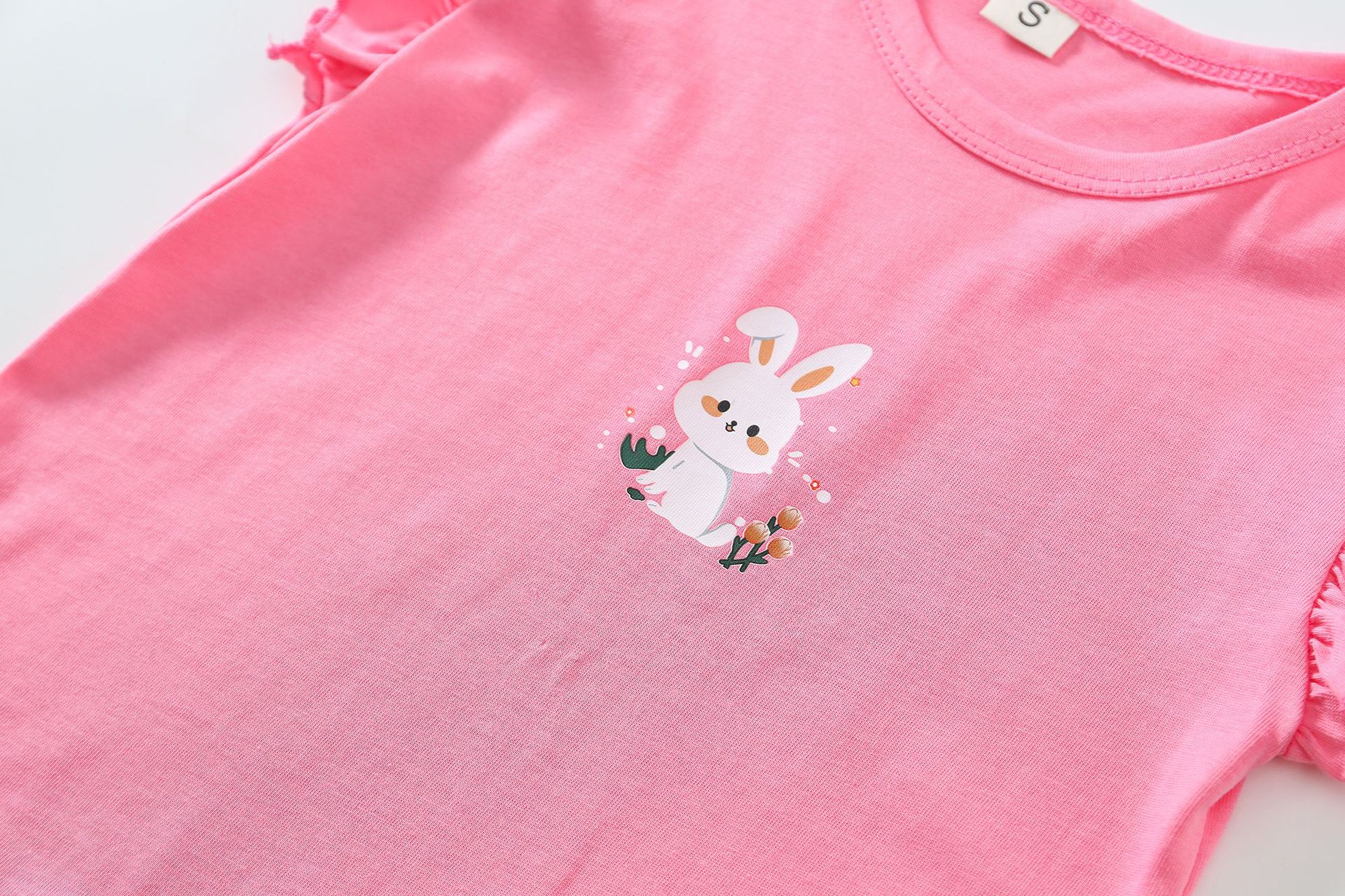 국경 간 아기 소녀 여름 옷, 귀여운 만화 프린트 작은 날개 소매 옷, 세련된 꽃 반바지, 소녀 투피스 도매스토어 가기