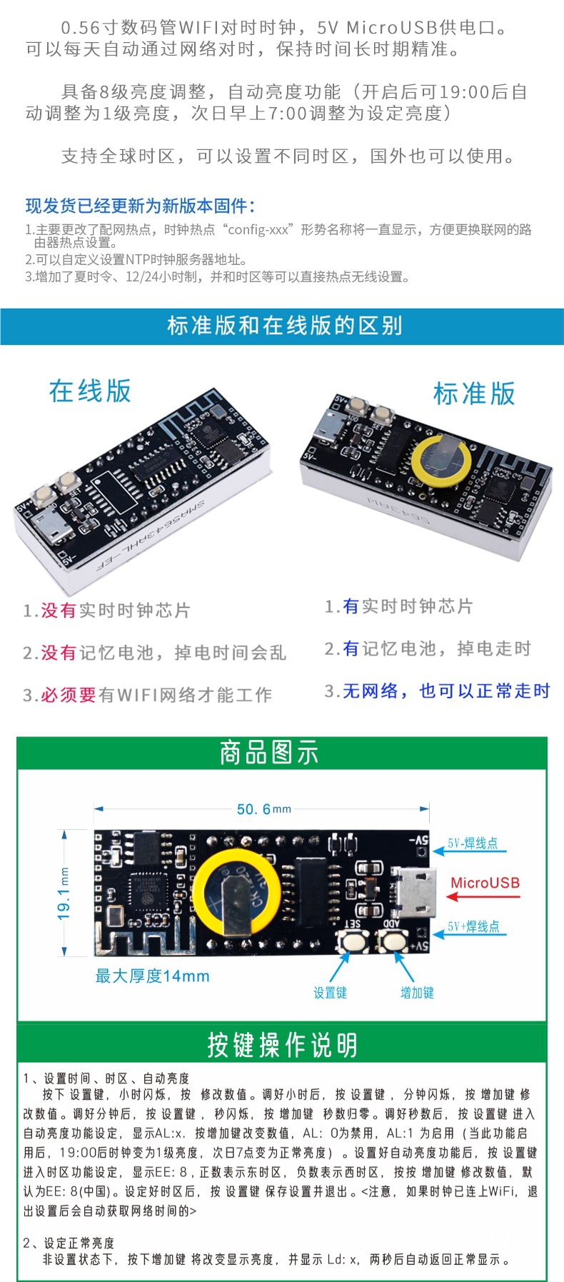 무선 WIFI 네트워크 타이밍 자동 타이밍 시계 모듈 고정밀 USB 전자 시계 LED 발광 DIY