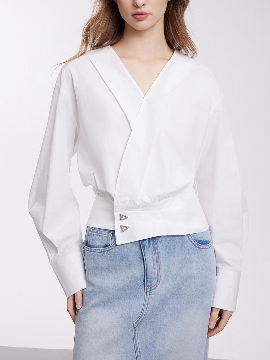 ST [라이트 스프링 화이트 티] 순수 1 면 디자인 V 넥 허리 셔츠 여성 2025 봄 새로운 패션 셔츠스토어 가기