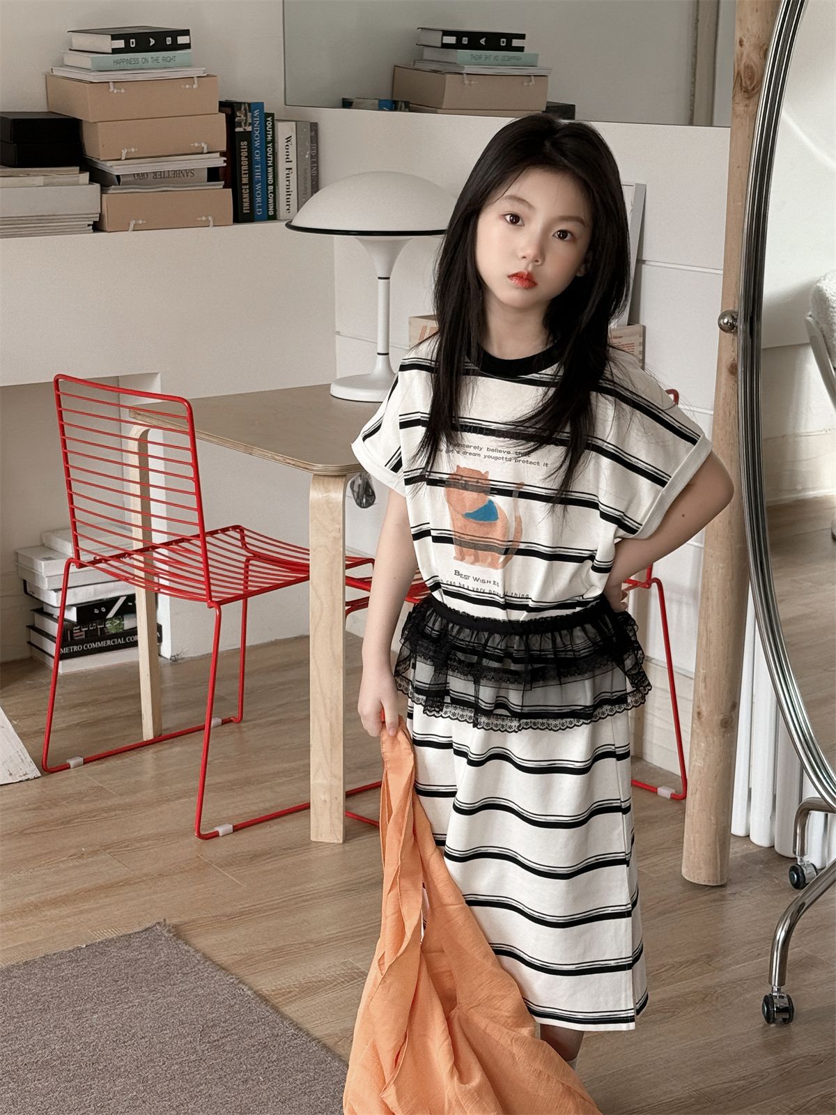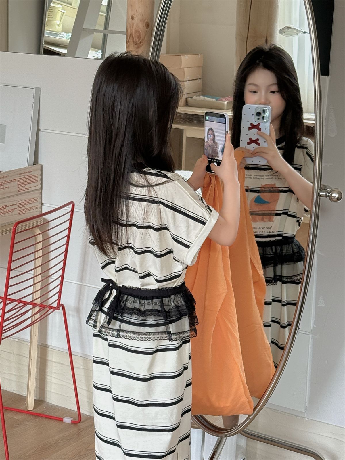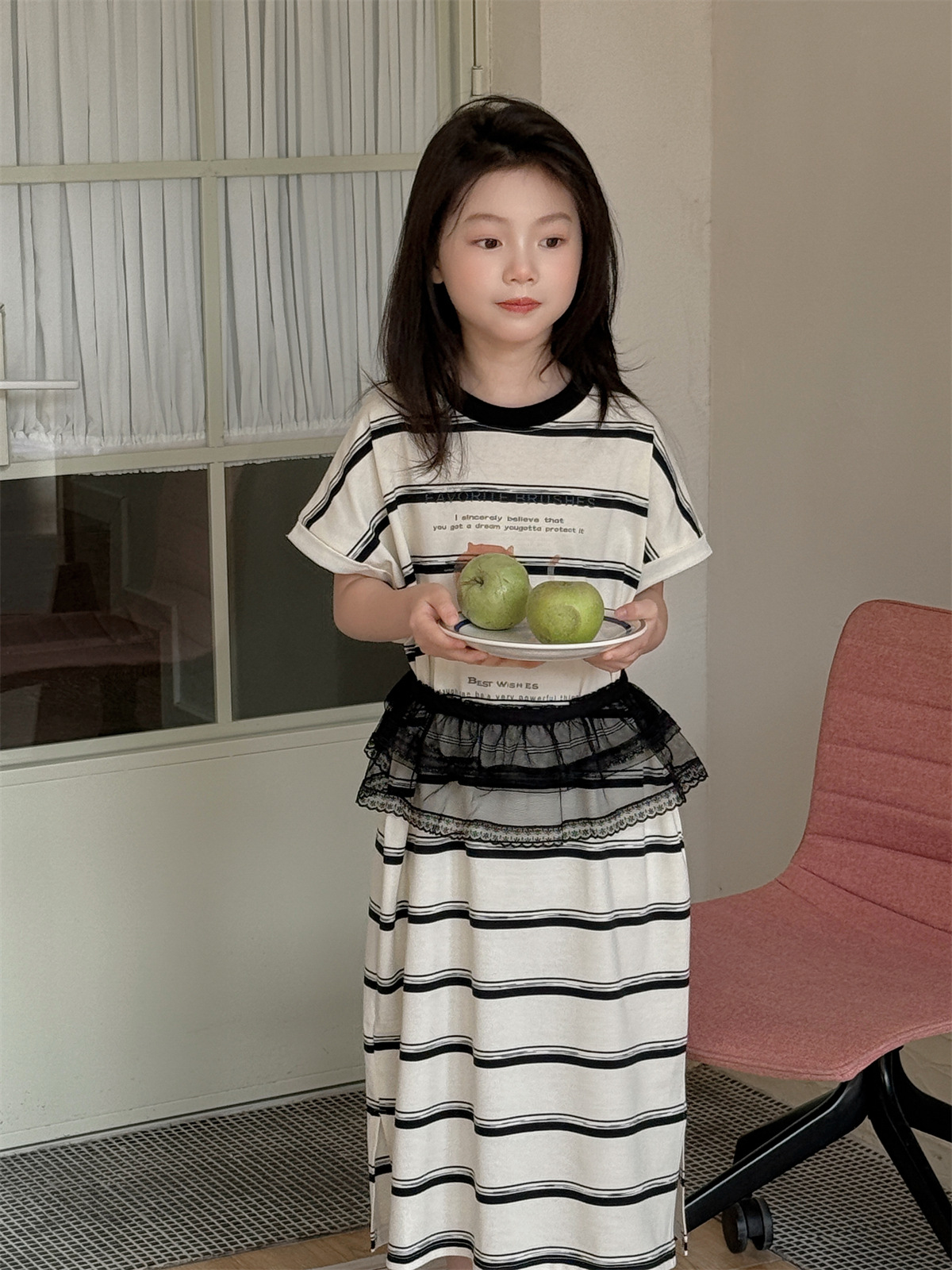 꽃과 찾는 어린이 착용 소녀 티셔츠 스커트 2025 여름 새로운 어린이 서양식 줄무늬 짧은 소매 긴 T 올 매치 유행 어린이