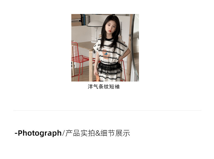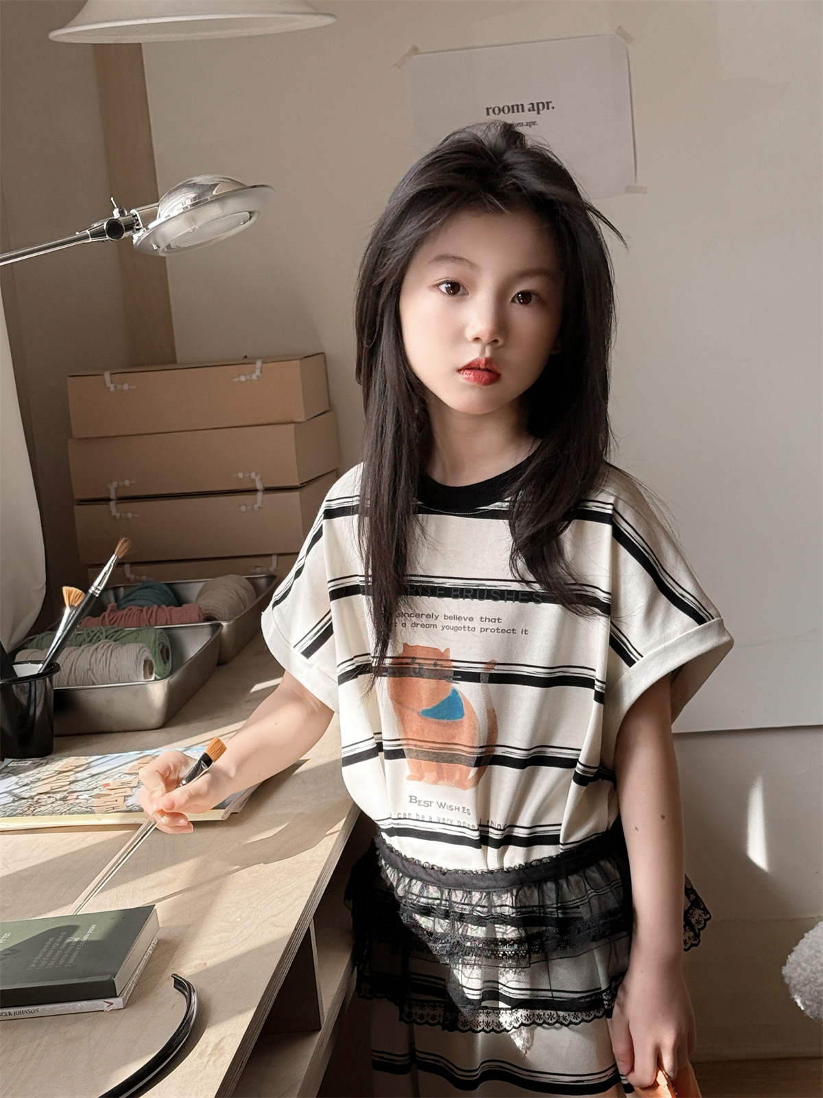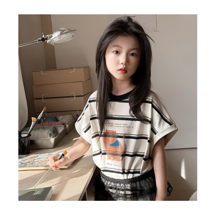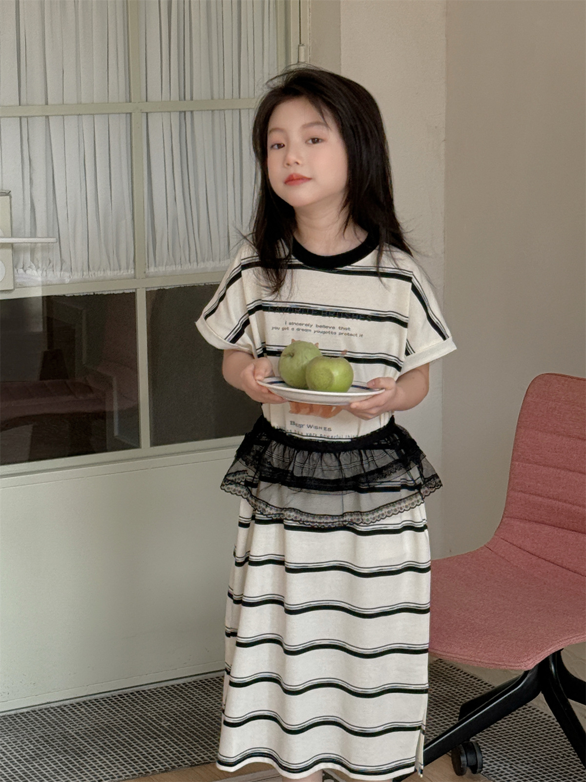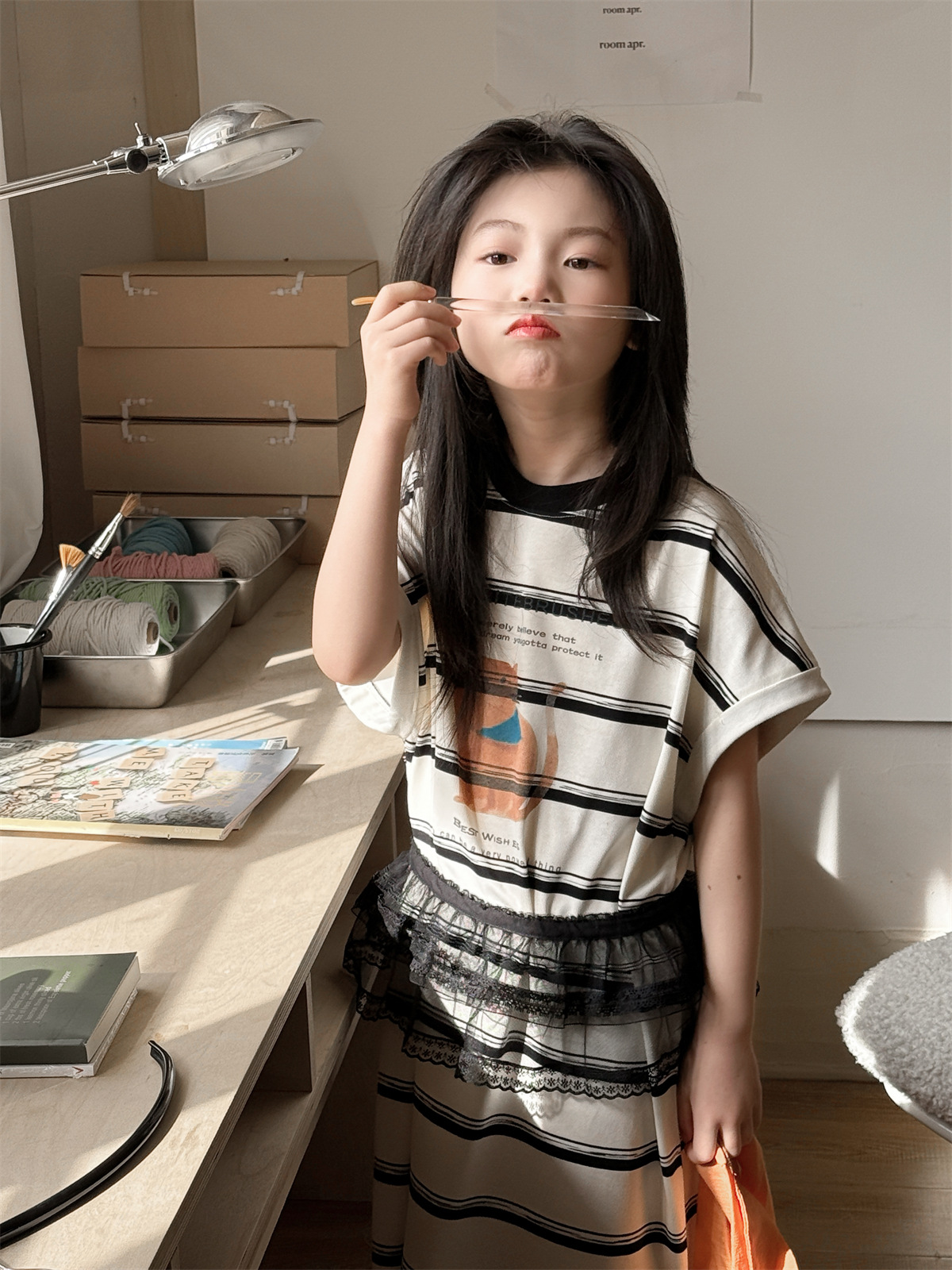 꽃과 찾는 어린이 착용 소녀 티셔츠 스커트 2025 여름 새로운 어린이 서양식 줄무늬 짧은 소매 긴 T 올 매치 유행 어린이