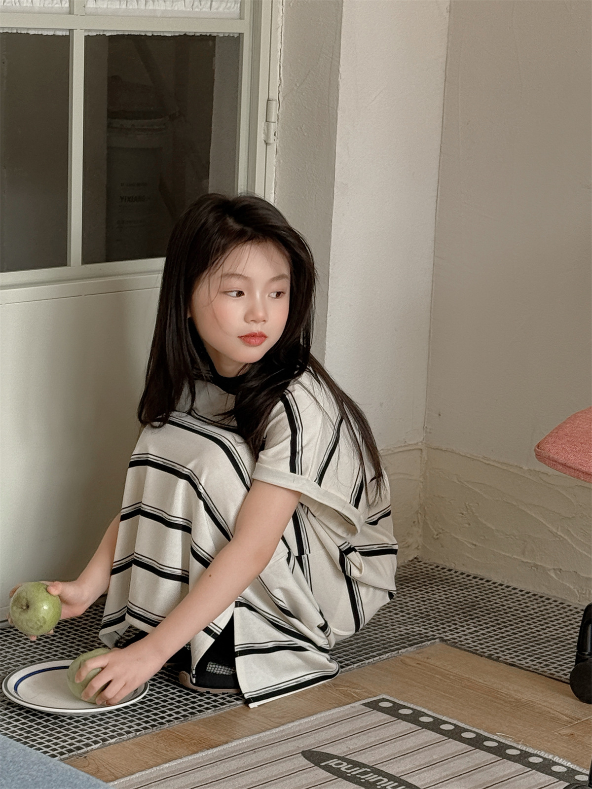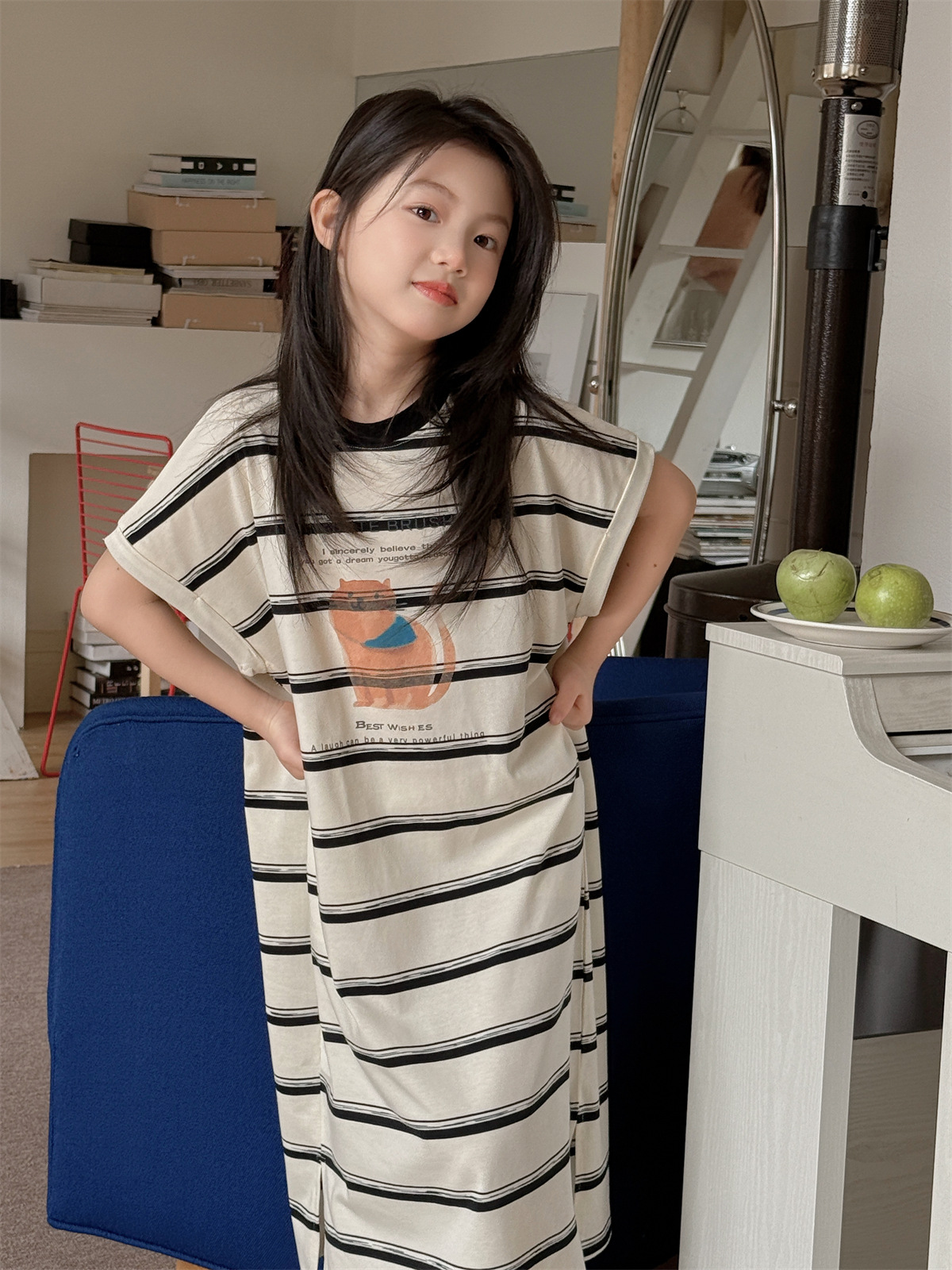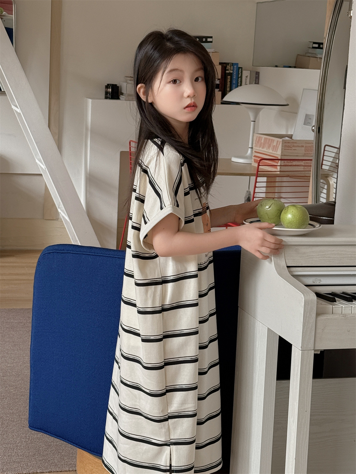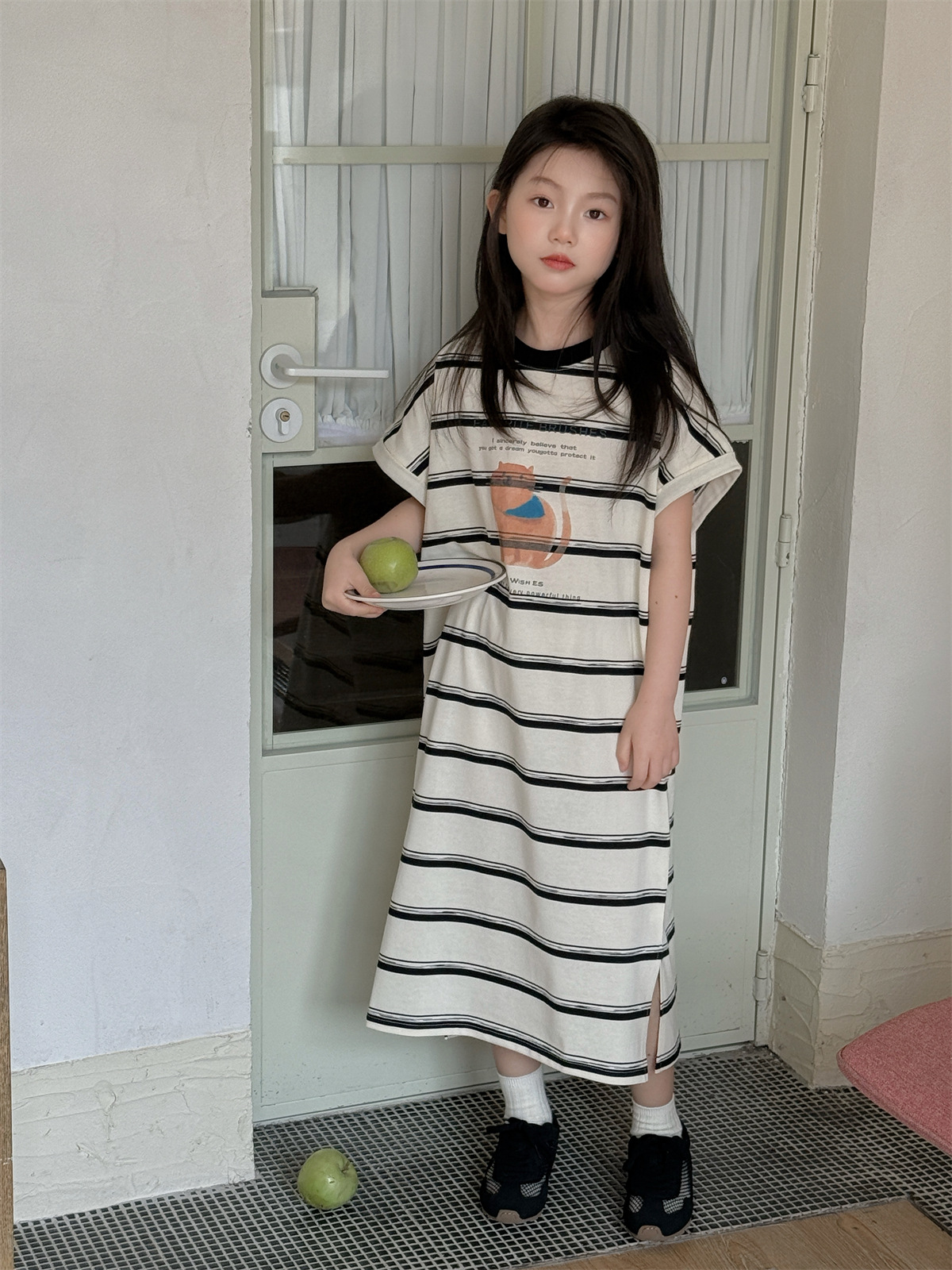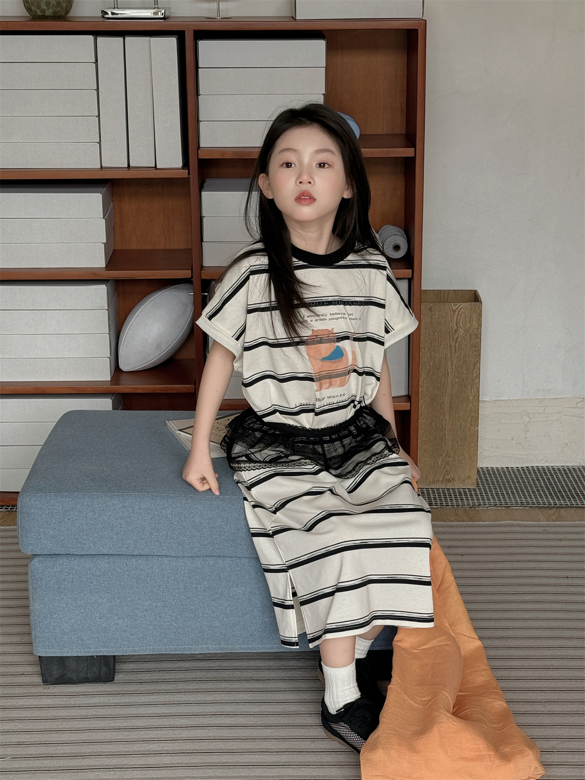 꽃과 찾는 어린이 착용 소녀 티셔츠 스커트 2025 여름 새로운 어린이 서양식 줄무늬 짧은 소매 긴 T 올 매치 유행 어린이스토어 가기