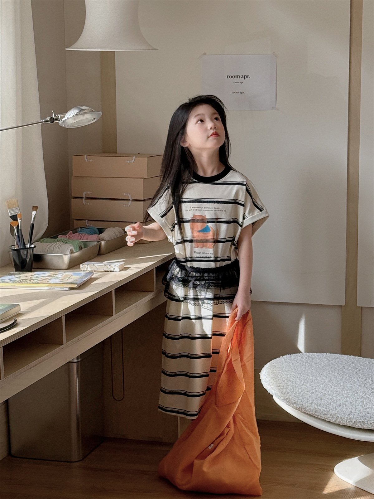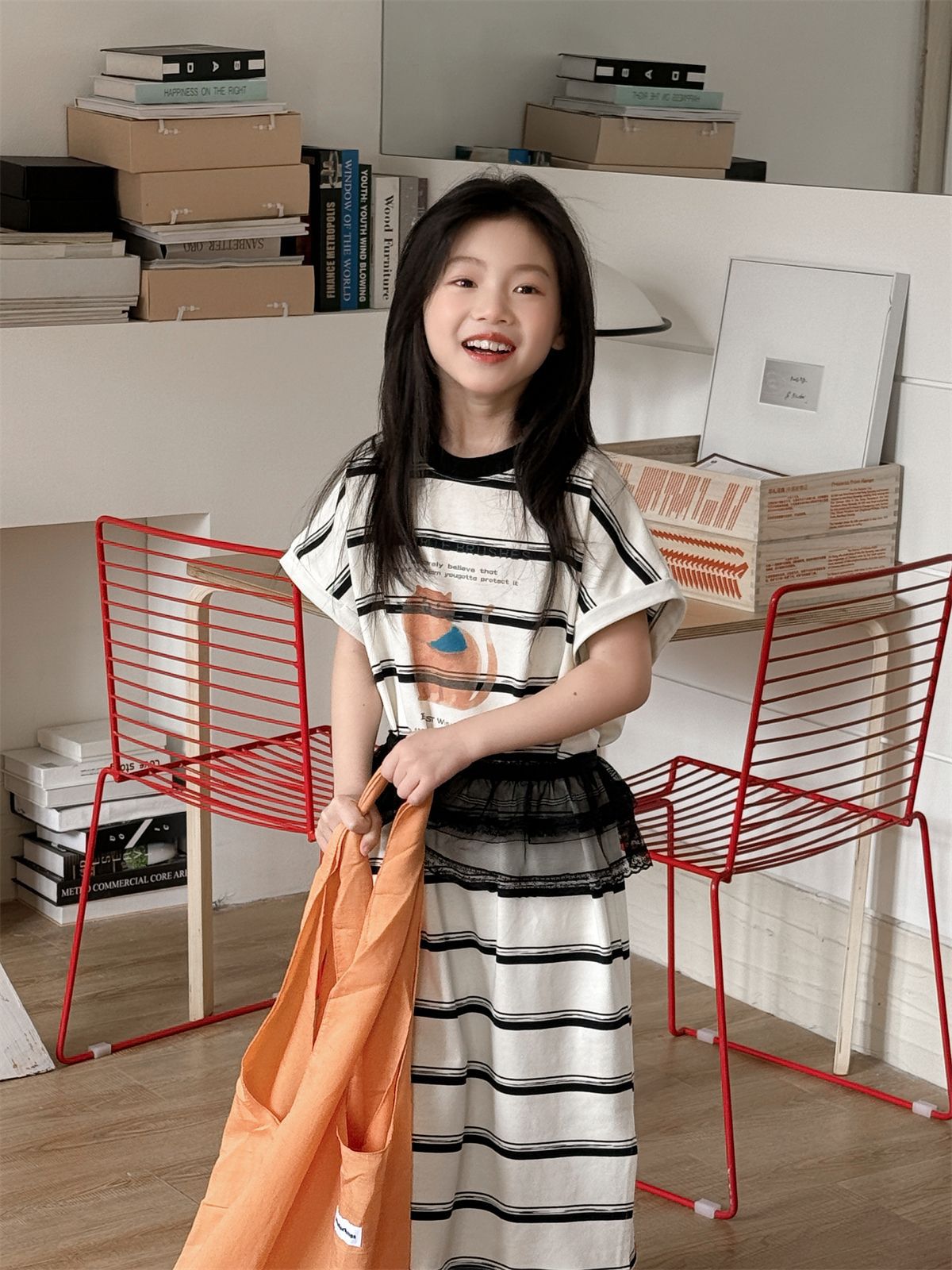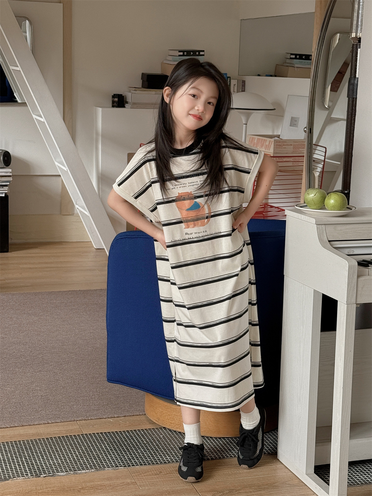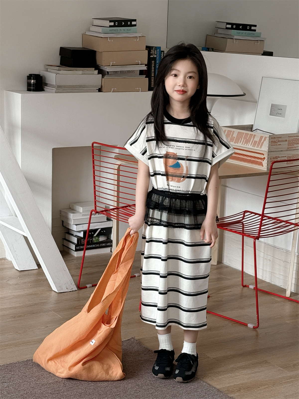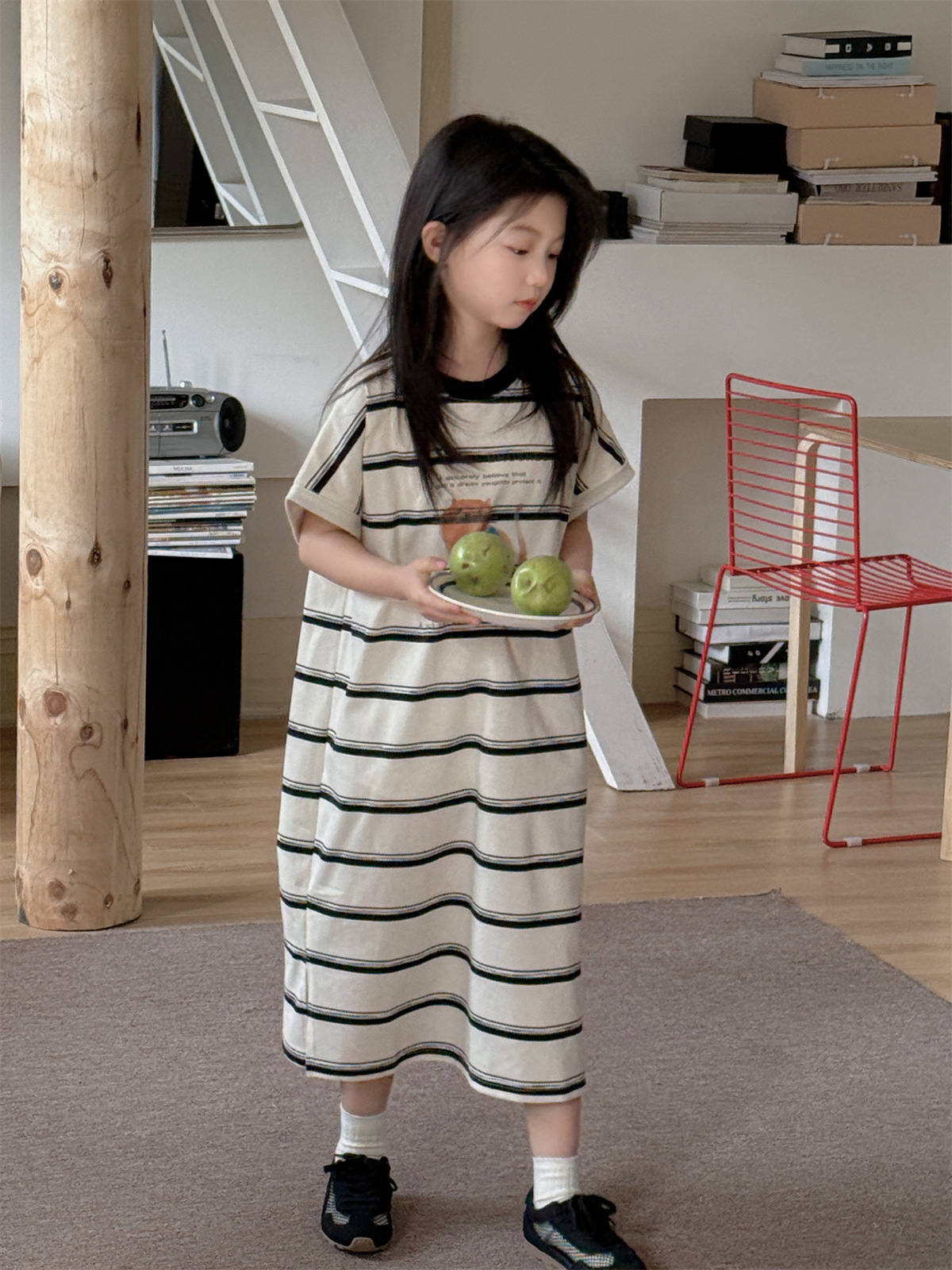 꽃과 찾는 어린이 착용 소녀 티셔츠 스커트 2025 여름 새로운 어린이 서양식 줄무늬 짧은 소매 긴 T 올 매치 유행 어린이스토어 가기