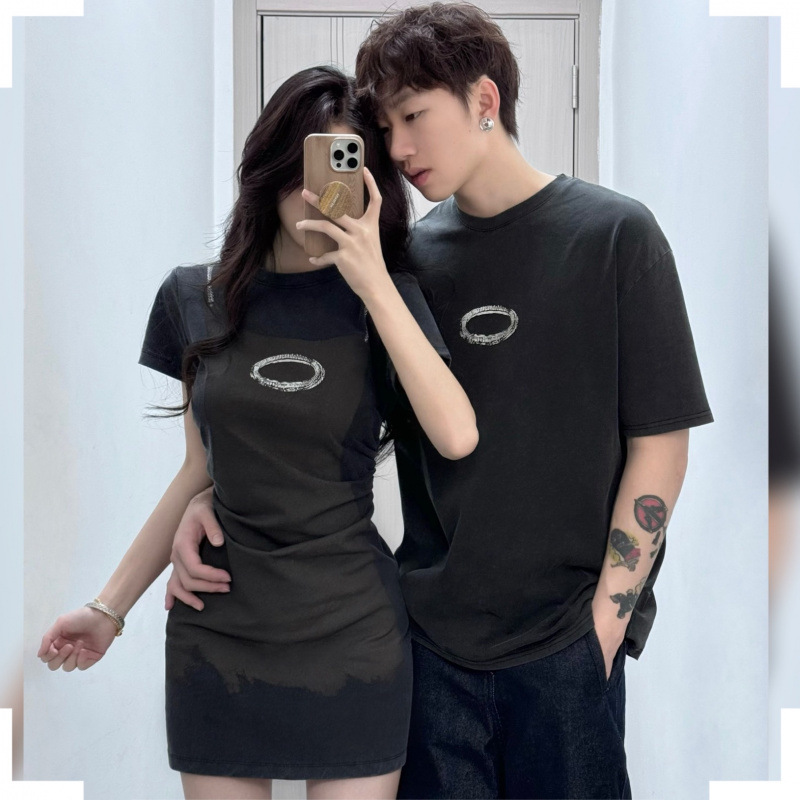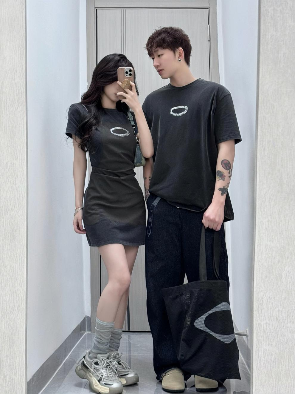 2025 가짜 투피스 슬링 프린트 티셔츠 원피스 여성용 틈새 반팔 원피스 유행 커플 원피스스토어 가기