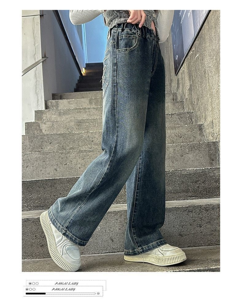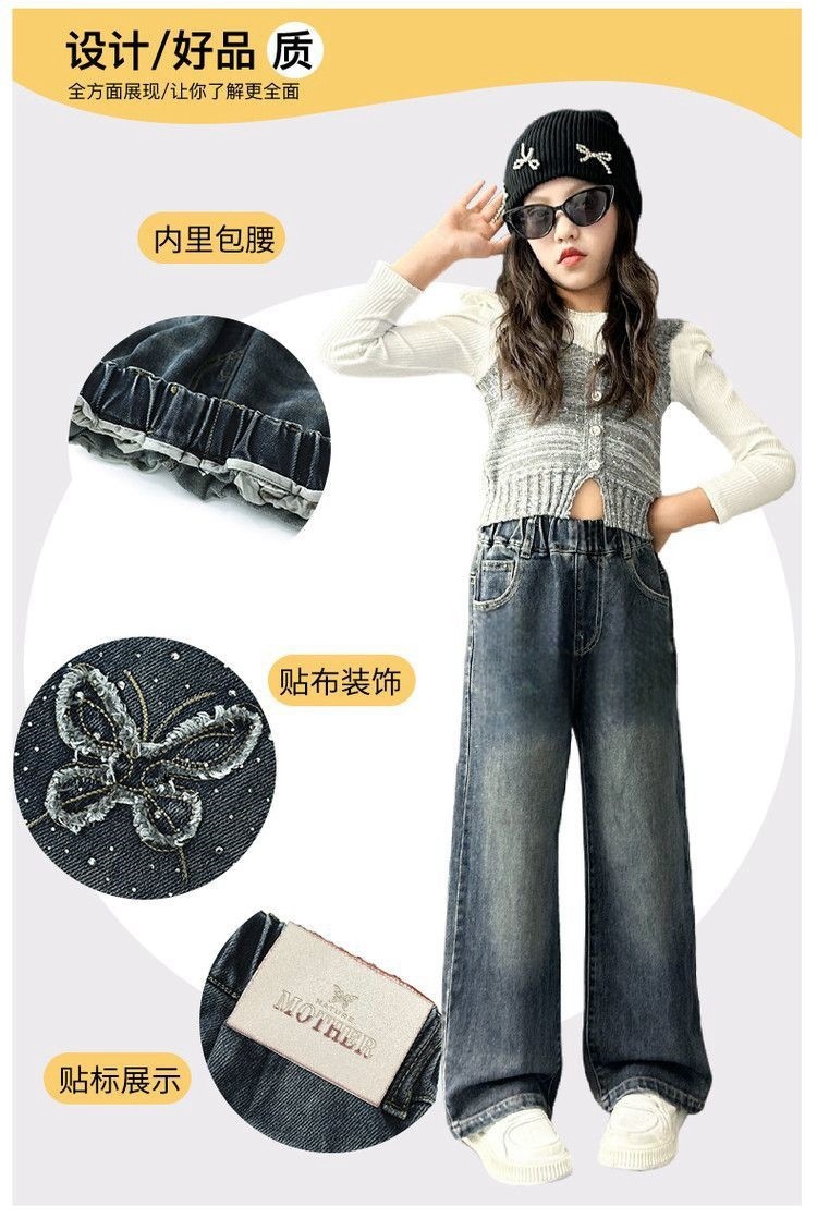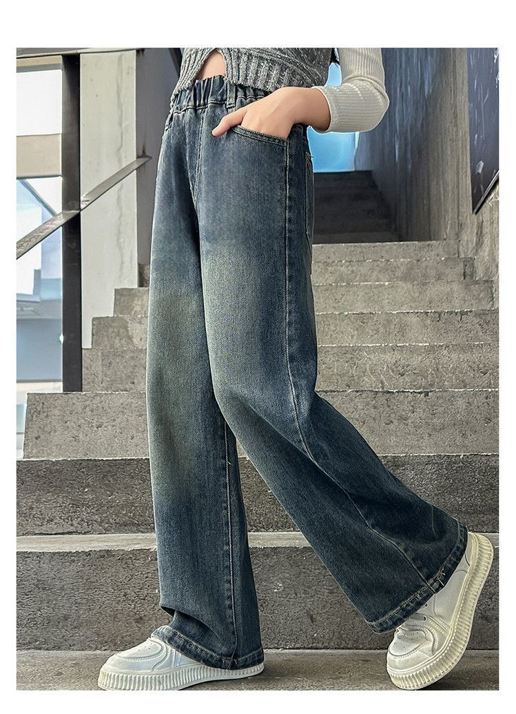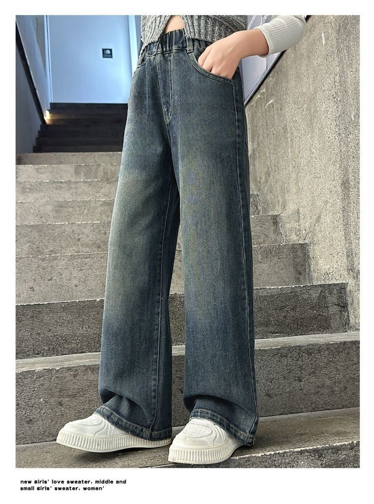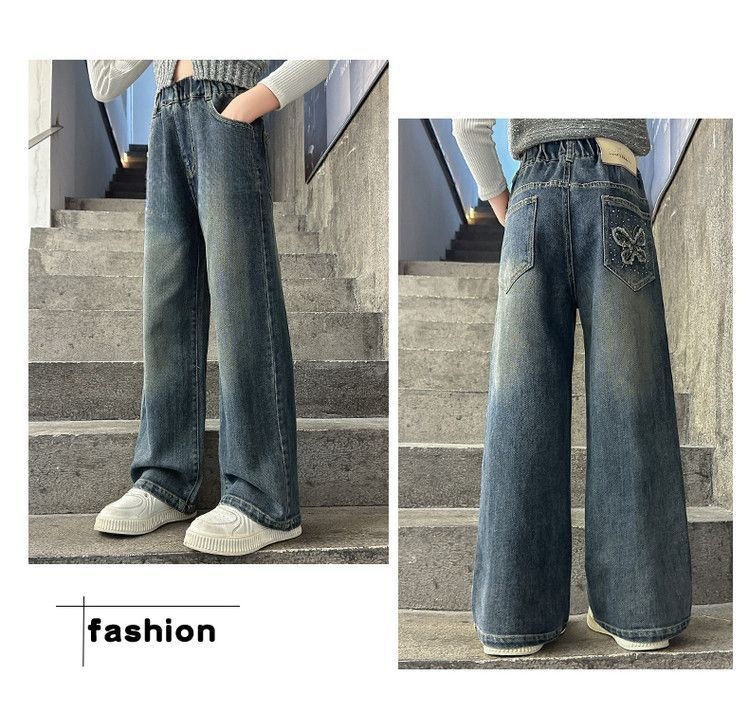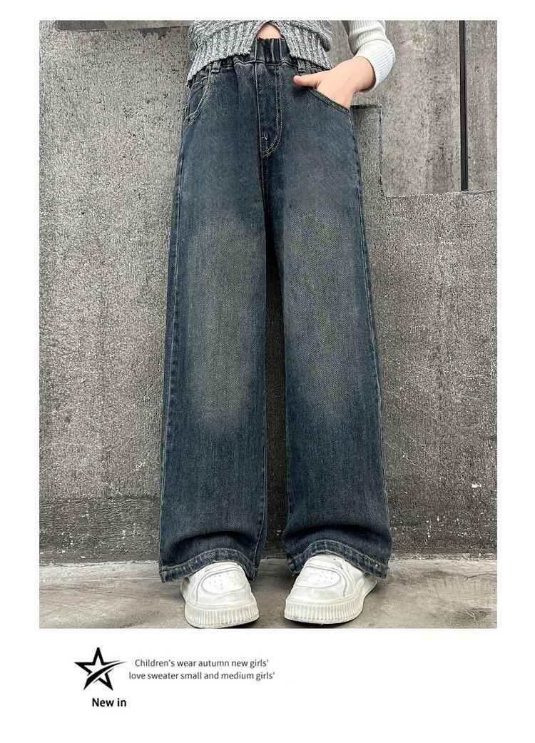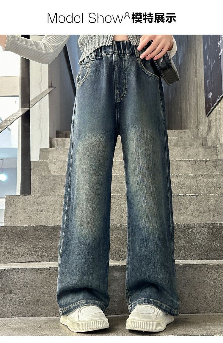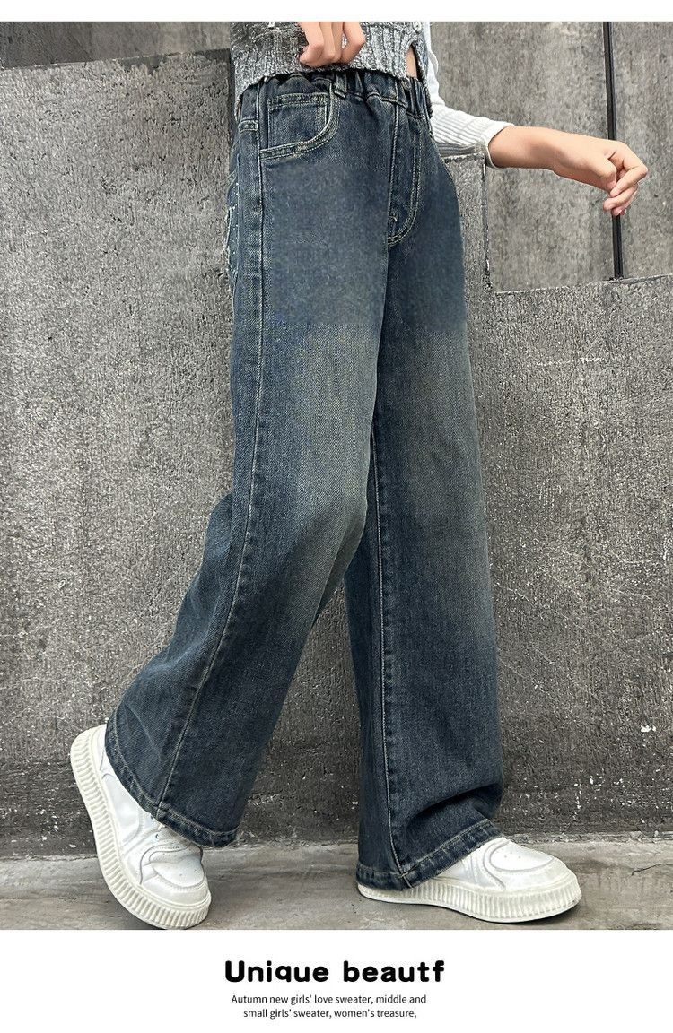 소녀 청바지 봄과 가을 2025 새로운 한국 스타일 서양식 어린이 바지 여성 빅 어린이 봄 스트레이트-다리 와이드-다리 바지