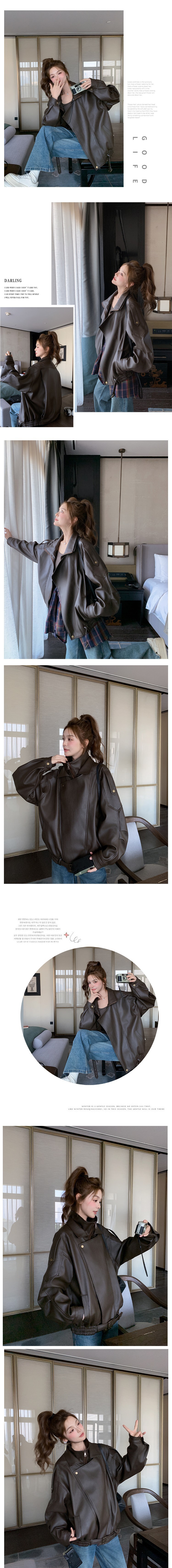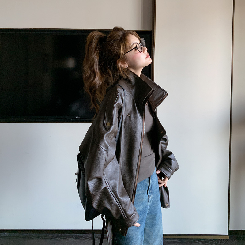 여성을위한 갈색 가죽 자켓 2025 봄 새로운 미국 복고풍 스트리트 오토바이 자켓 스판덱스스토어 가기