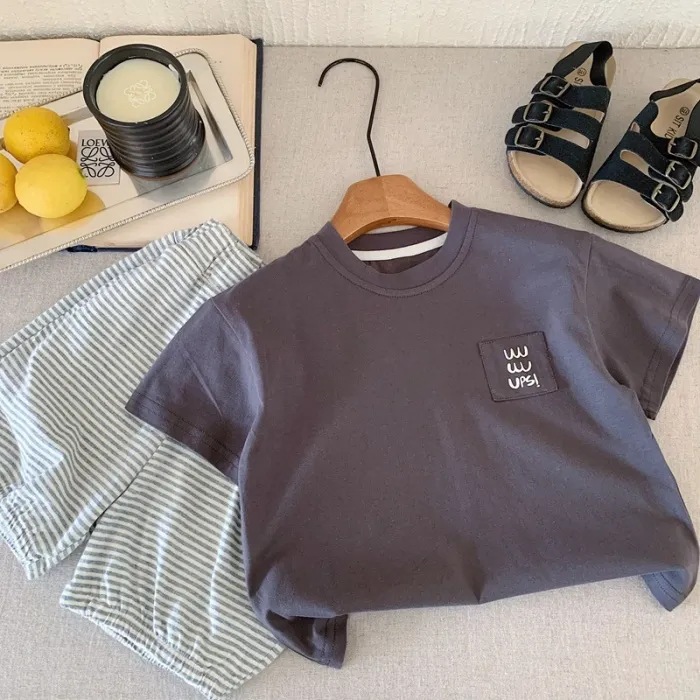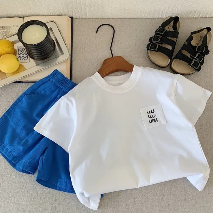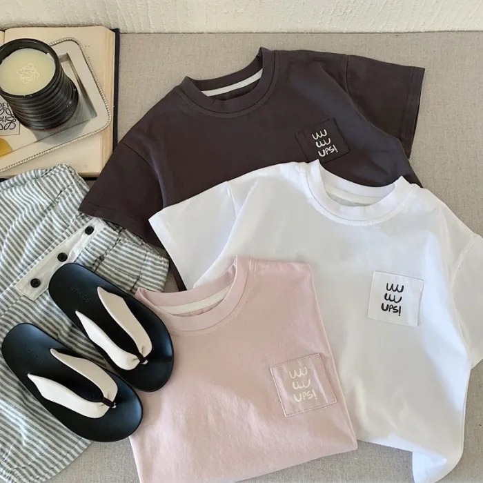 여름 새 어린이 반팔 티셔츠 소년 소녀 솔리드 컬러 크루 넥 탑 베이비 스타일 올매치 캐주얼 반소매 셔츠스토어 가기