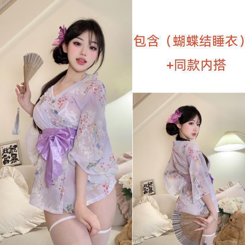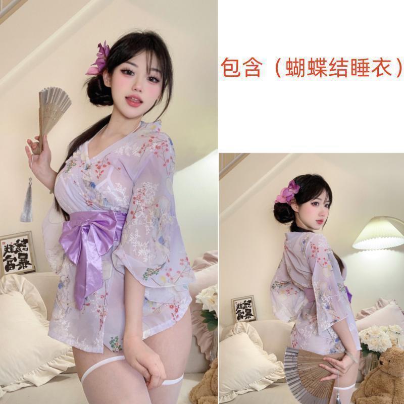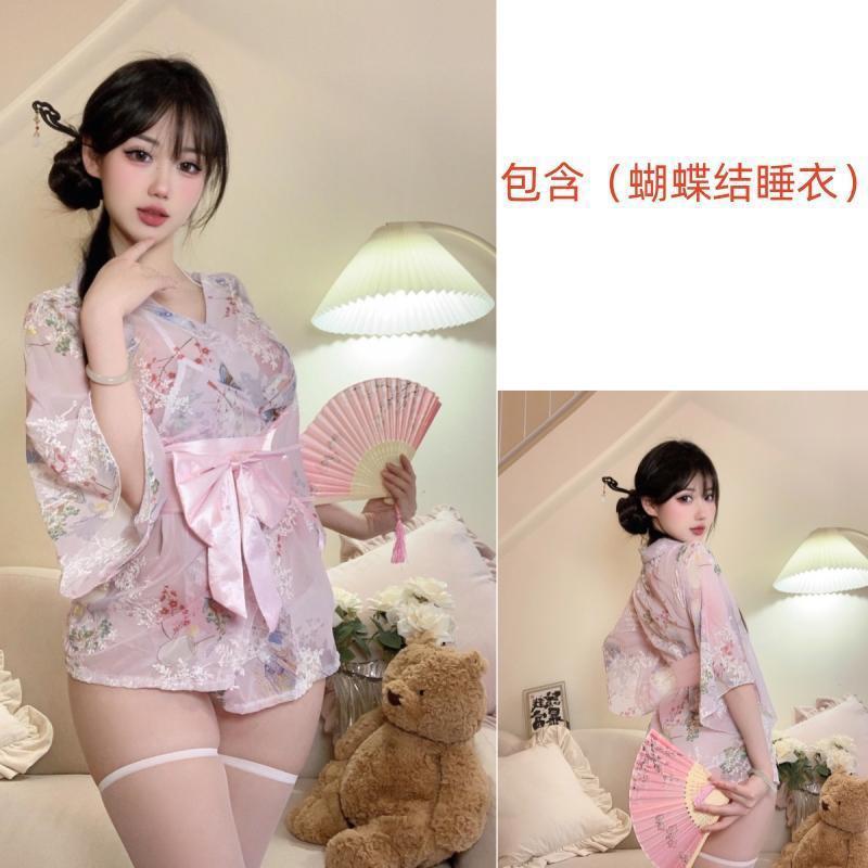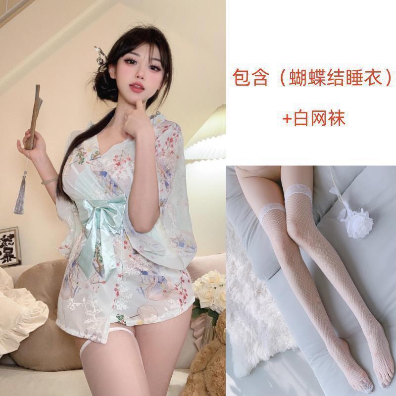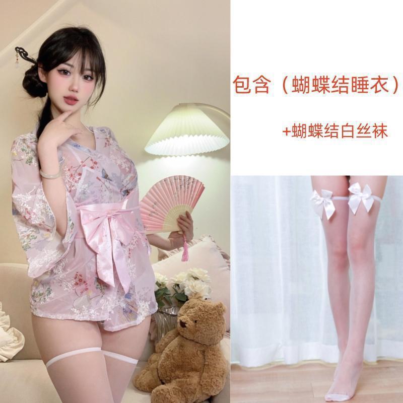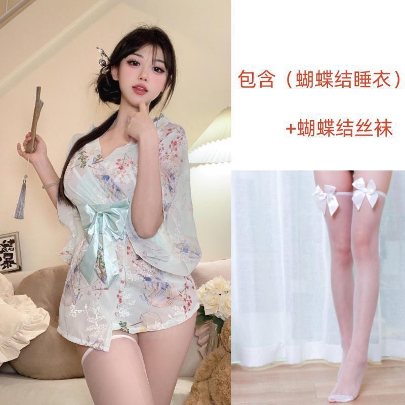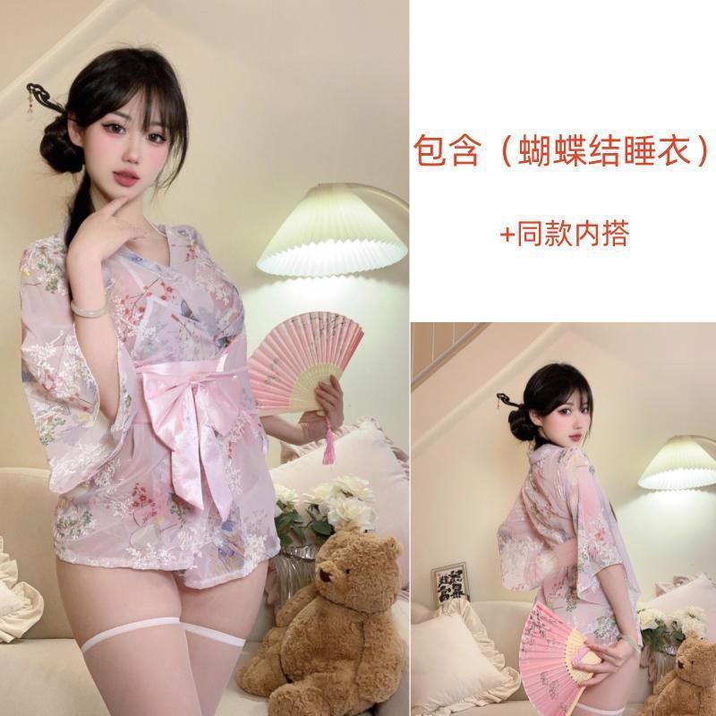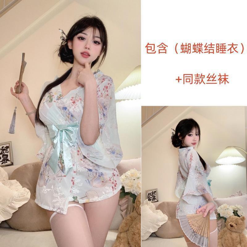 달콤한 활 인쇄 기모노 일본 유니폼 데이트 배틀 로브 메쉬 나이트 가운 스커트 목욕 가운 나이트웨어 홈 의류 여름