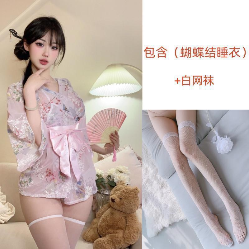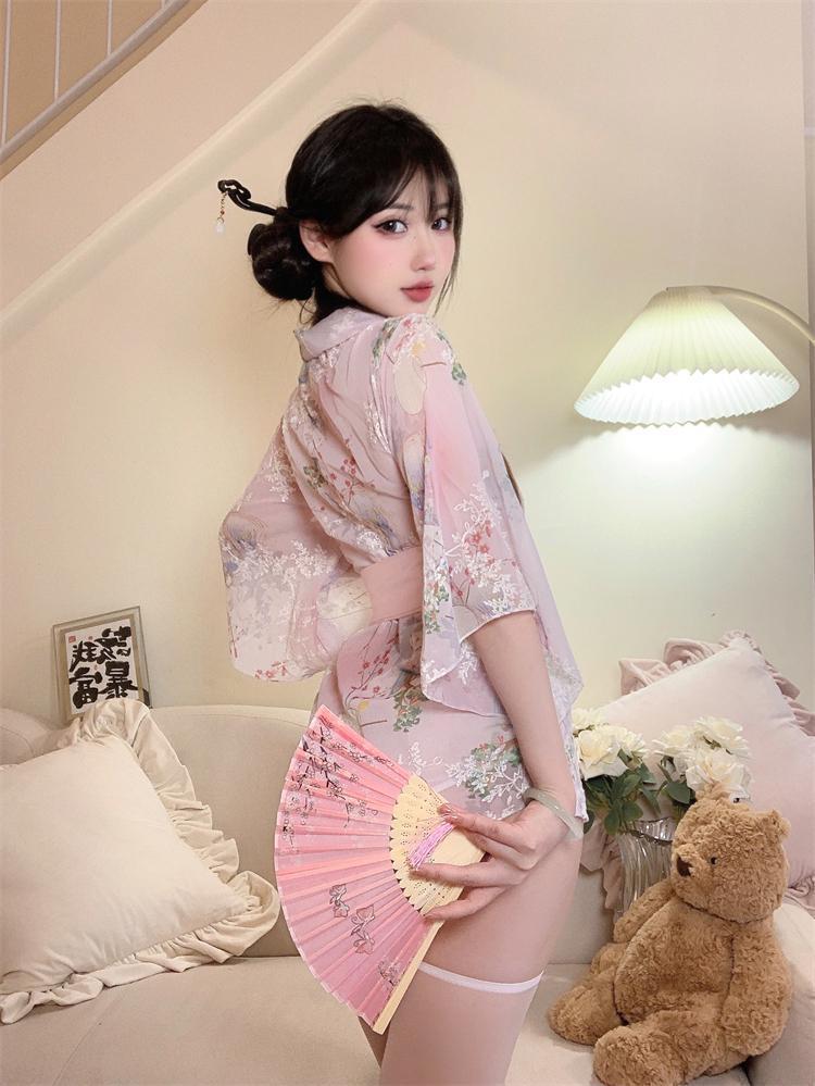 • 핑크색 꽃무늬 기모노 + 흰색 망사스타킹