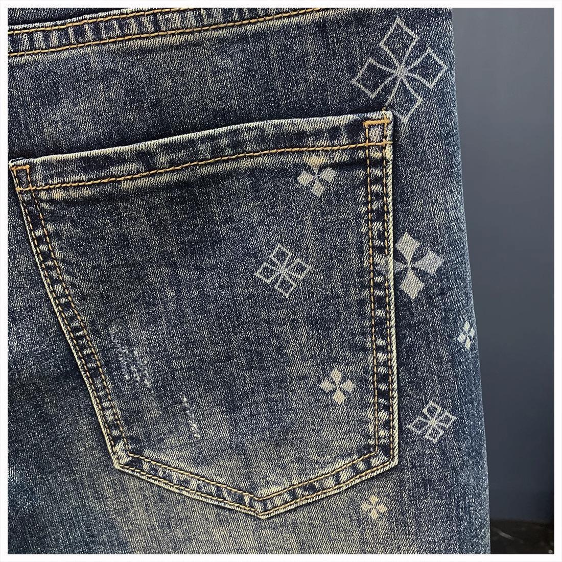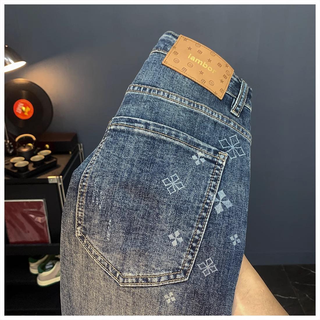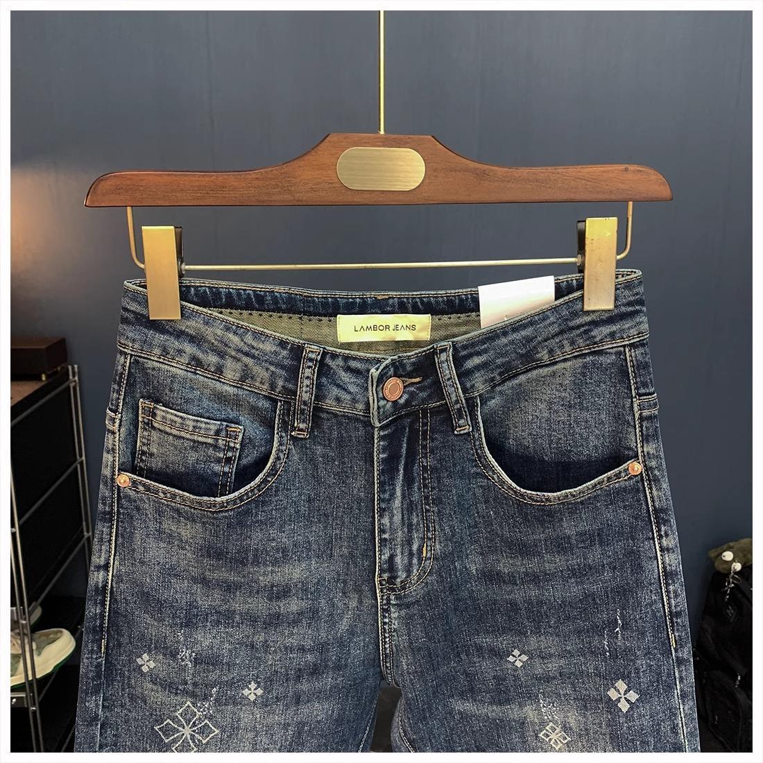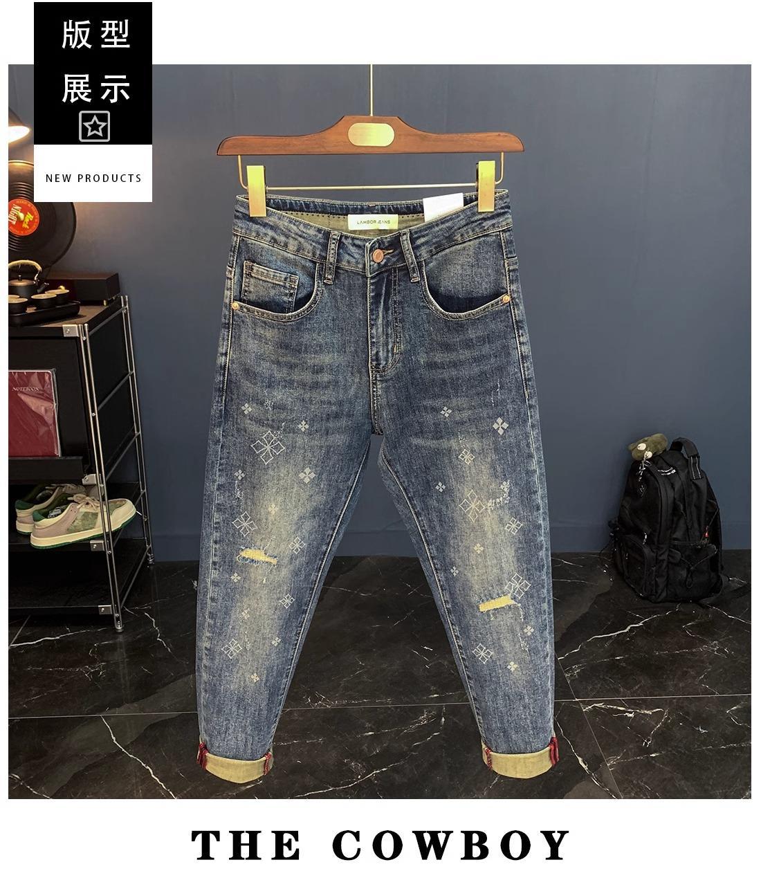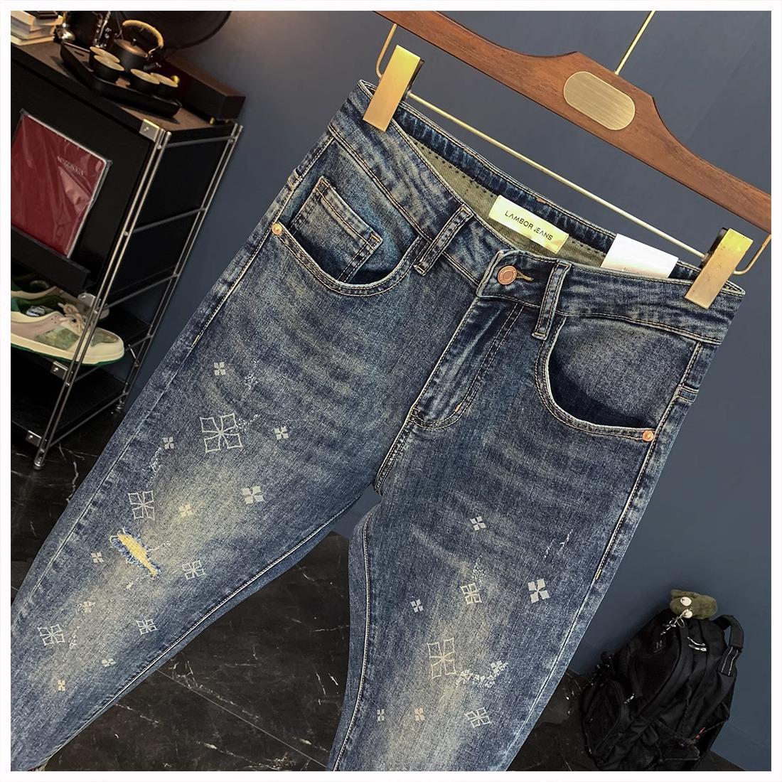 2025 신상 남성 청바지 봄 여름 슬림핏 팬츠 하이엔드 스트레치 블루 프린트 찢어진 9부 팬츠스토어 가기