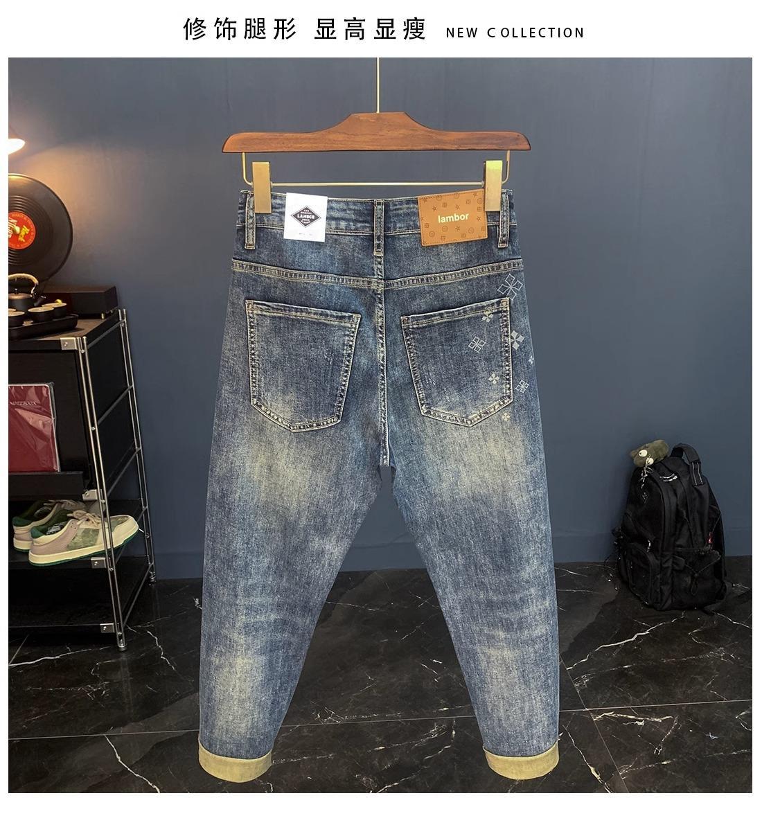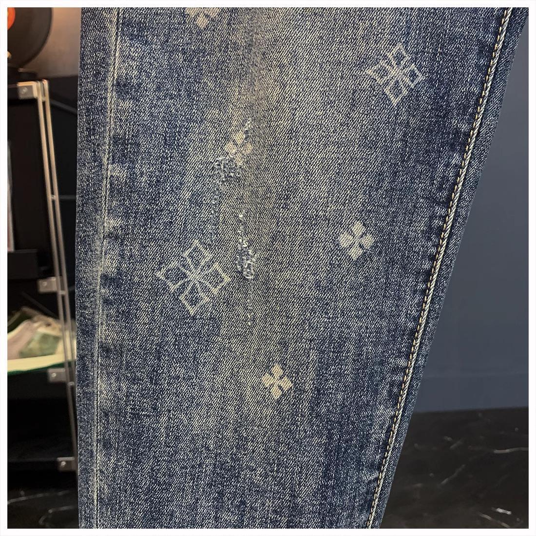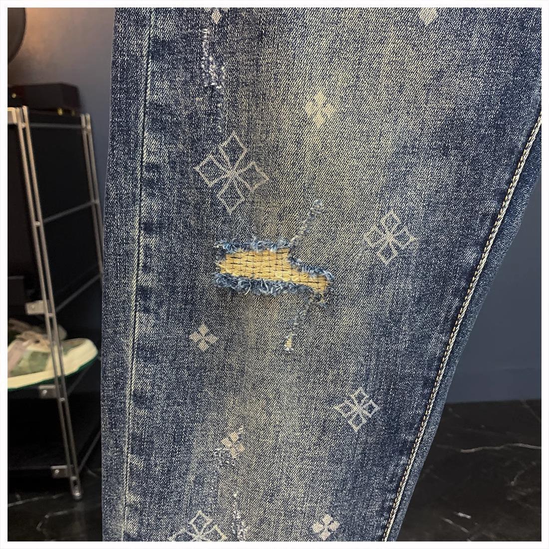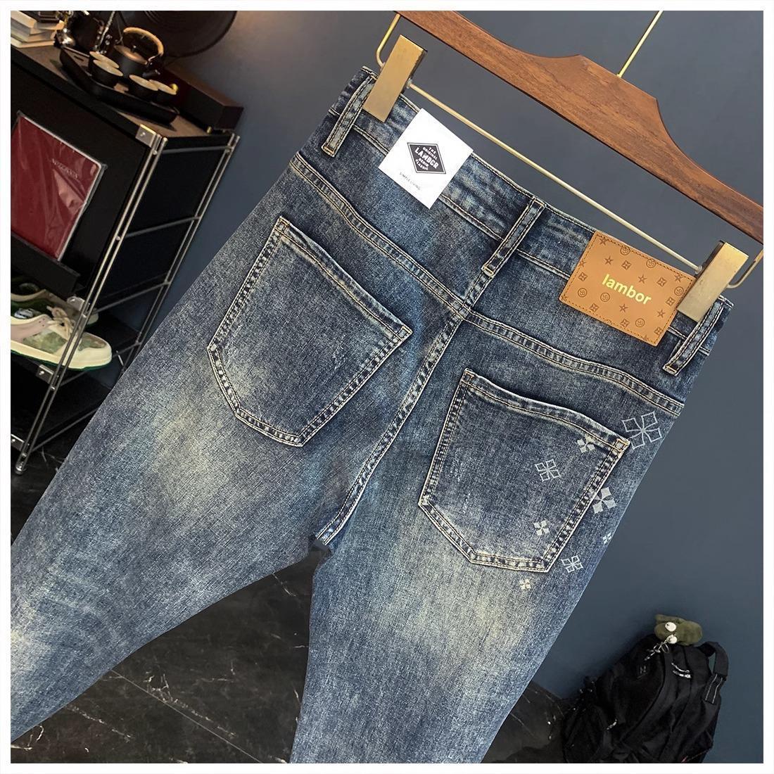 2025 신상 남성 청바지 봄 여름 슬림핏 팬츠 하이엔드 스트레치 블루 프린트 찢어진 9부 팬츠스토어 가기
