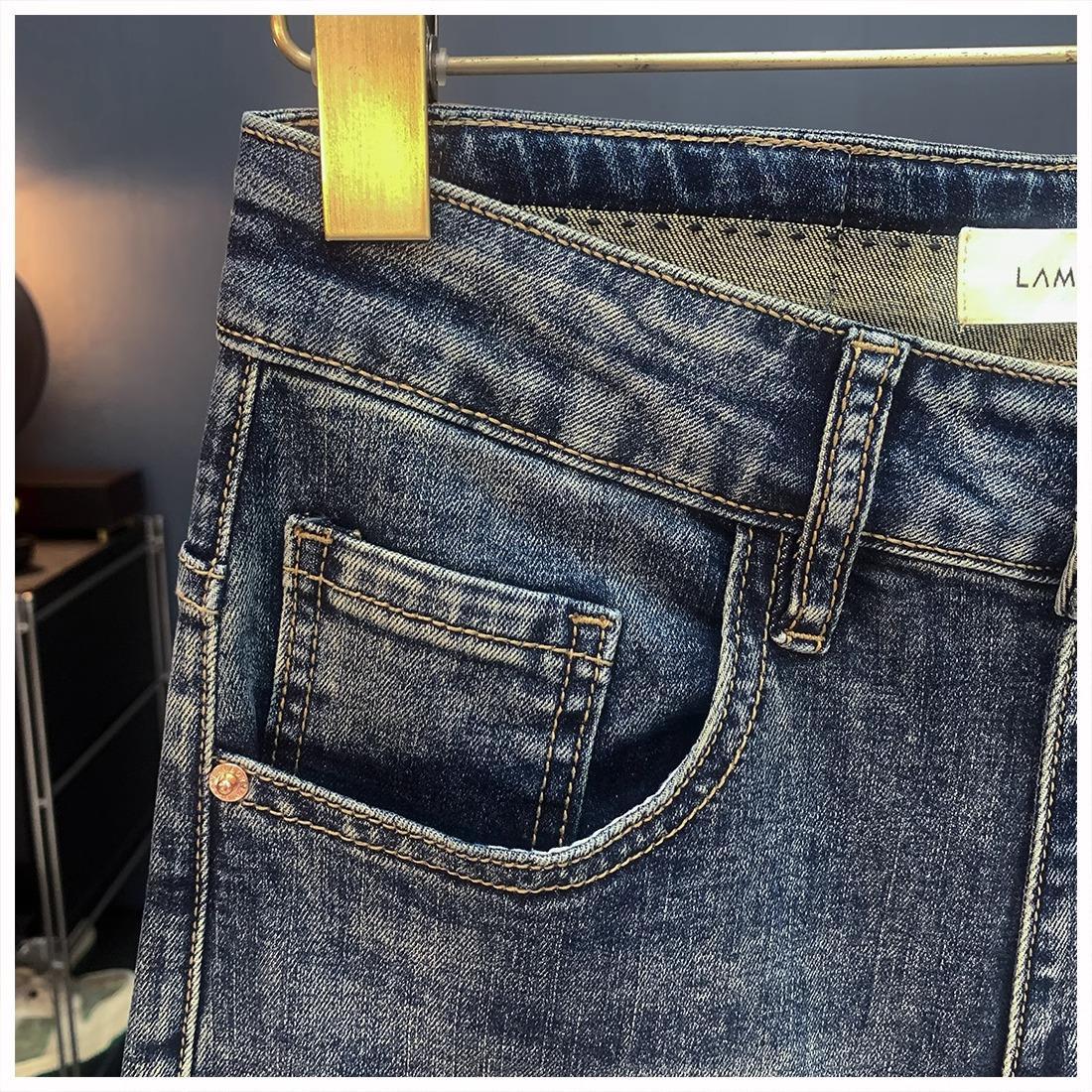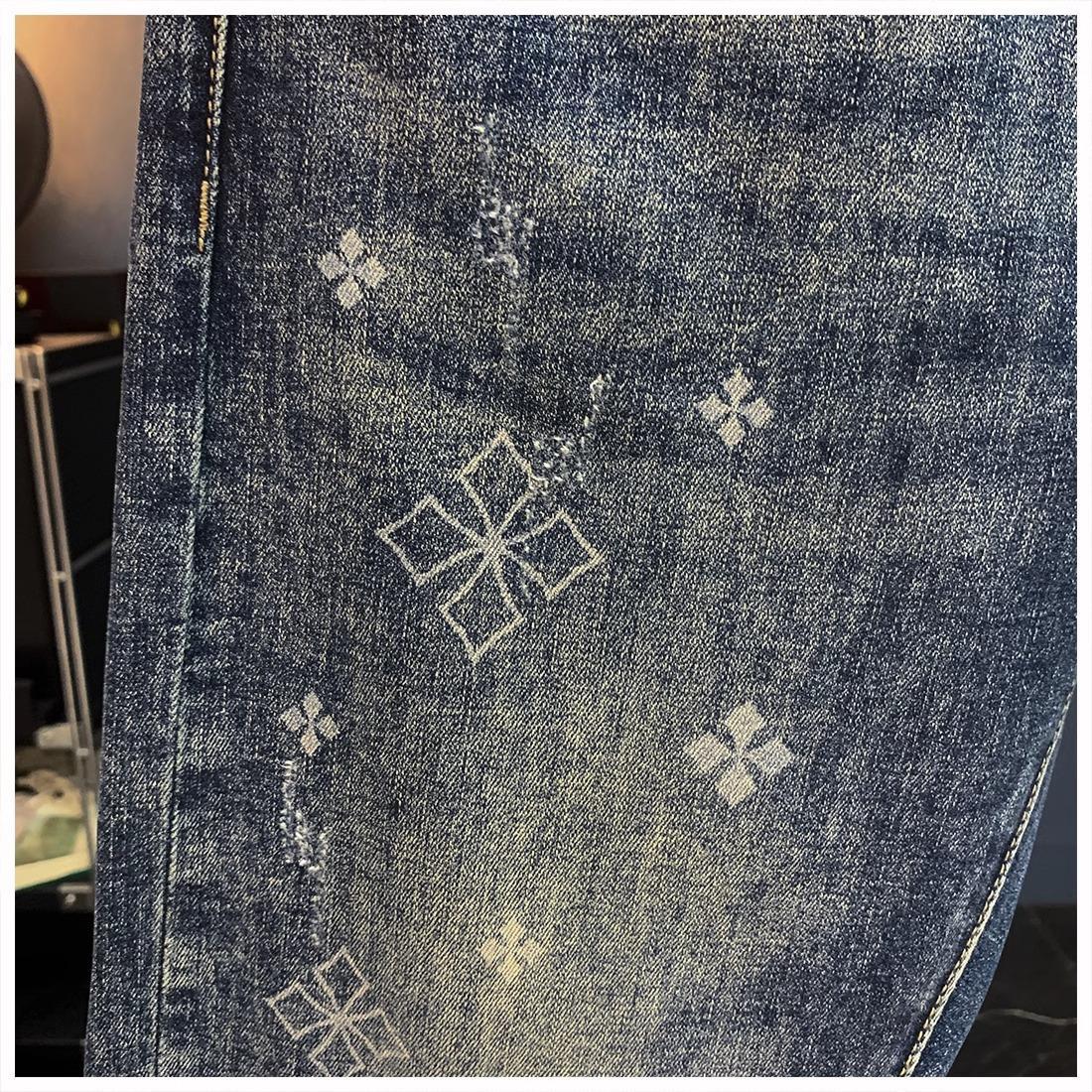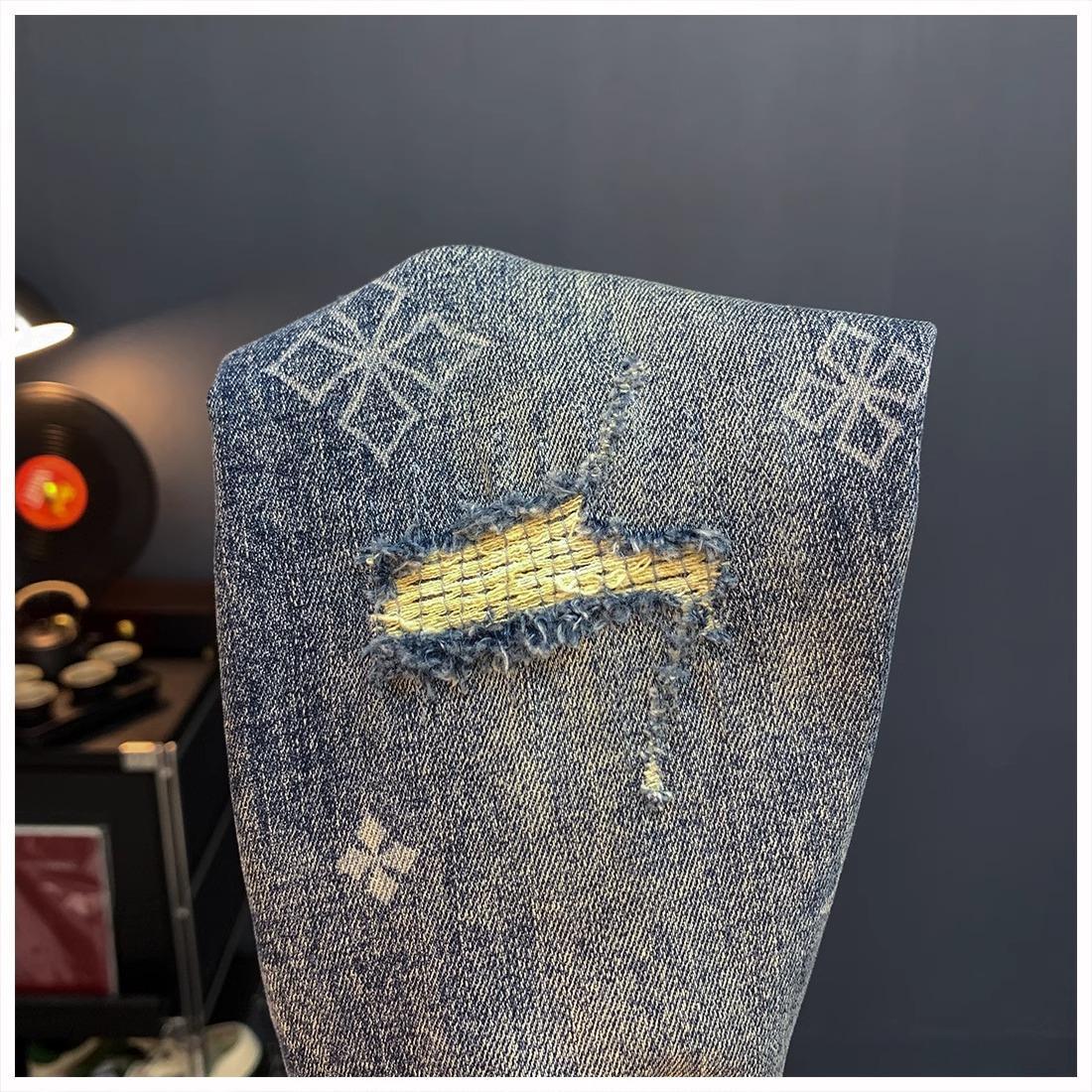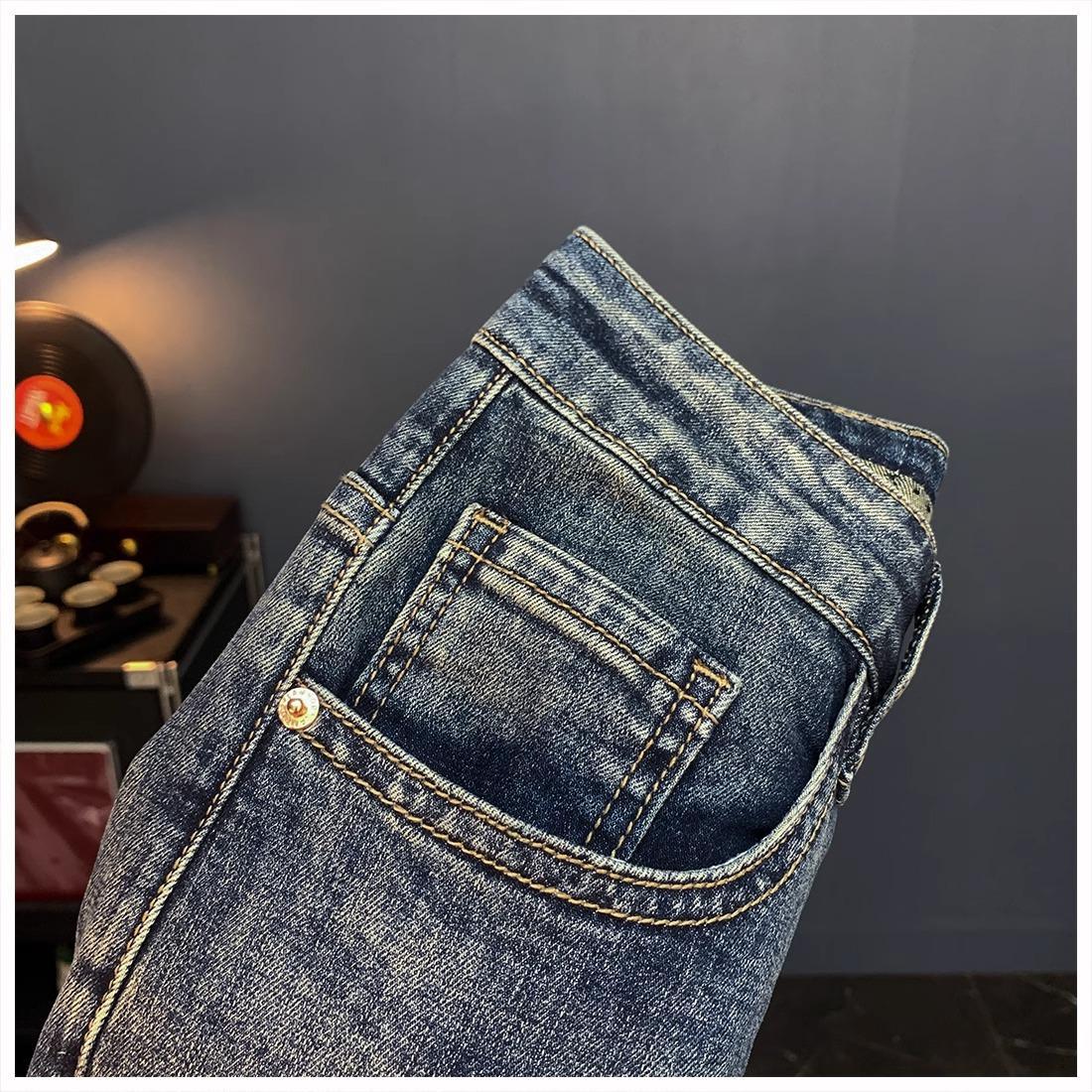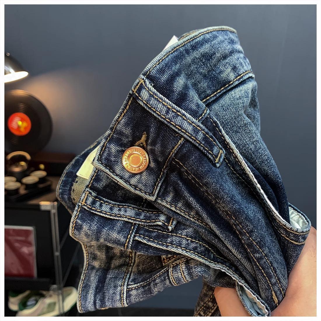 2025 신상 남성 청바지 봄 여름 슬림핏 팬츠 하이엔드 스트레치 블루 프린트 찢어진 9부 팬츠스토어 가기