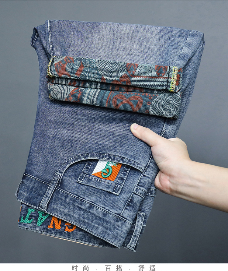 남자 5 점 바지 남자 데님 반바지 남자 스트레치 느슨한 스트레이트 바지 자수 인쇄 중간 포인트 바지 남성 패션스토어 가기