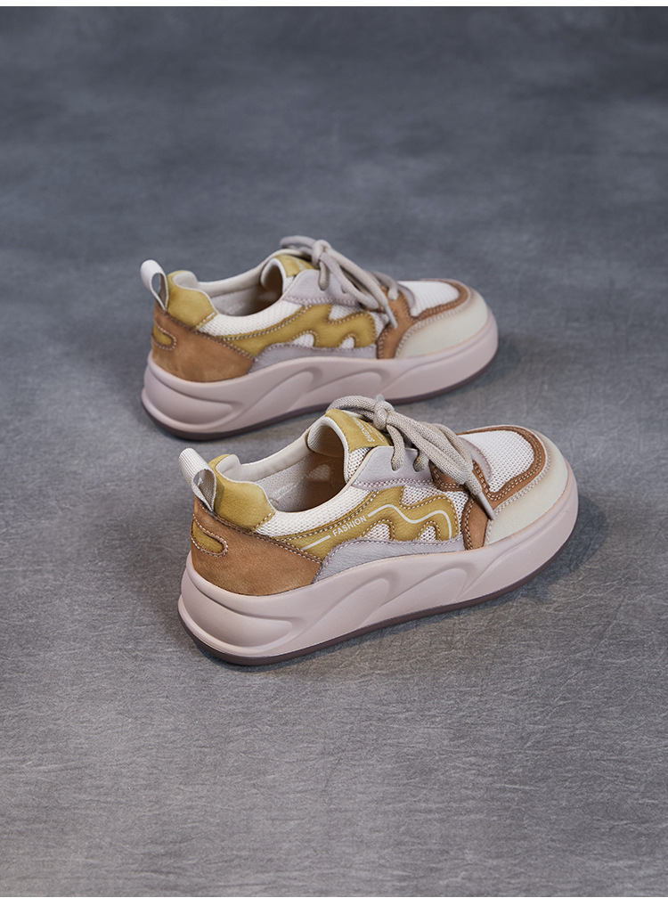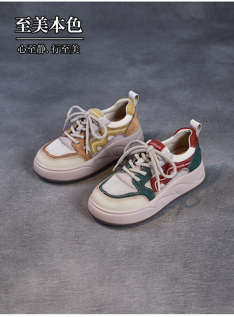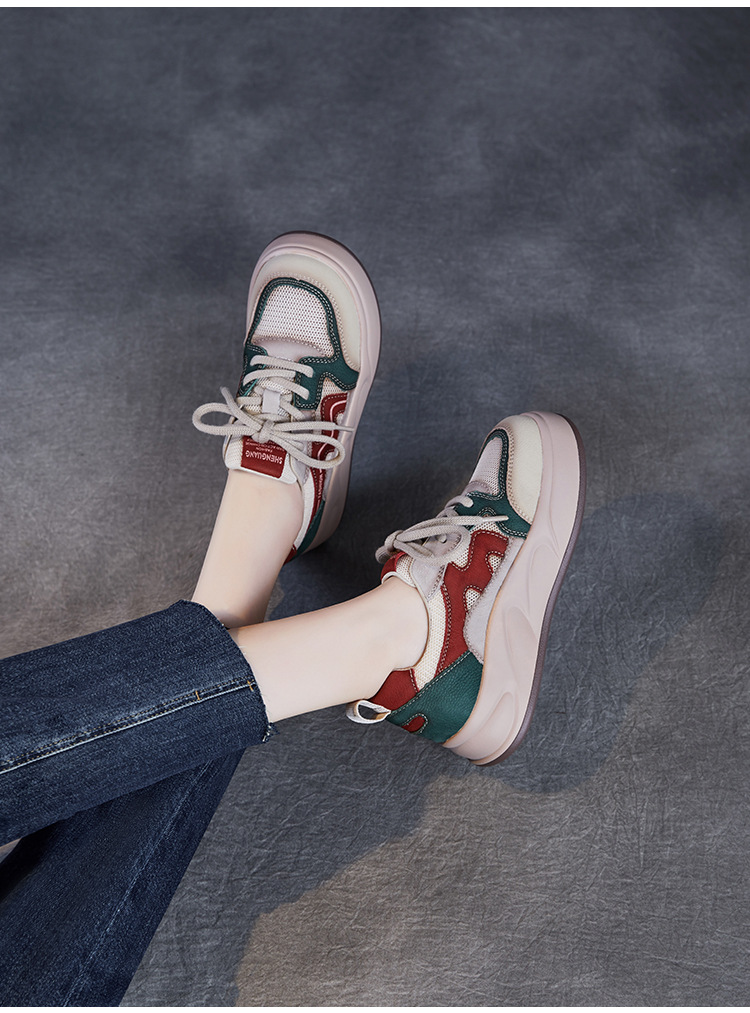 정품 가죽 빈티지 캐주얼 운동화 여성 2025 년 봄과 여름 대비 컬러 두꺼운 밑창 캐주얼 편안한 메쉬 통기성 토레 신발