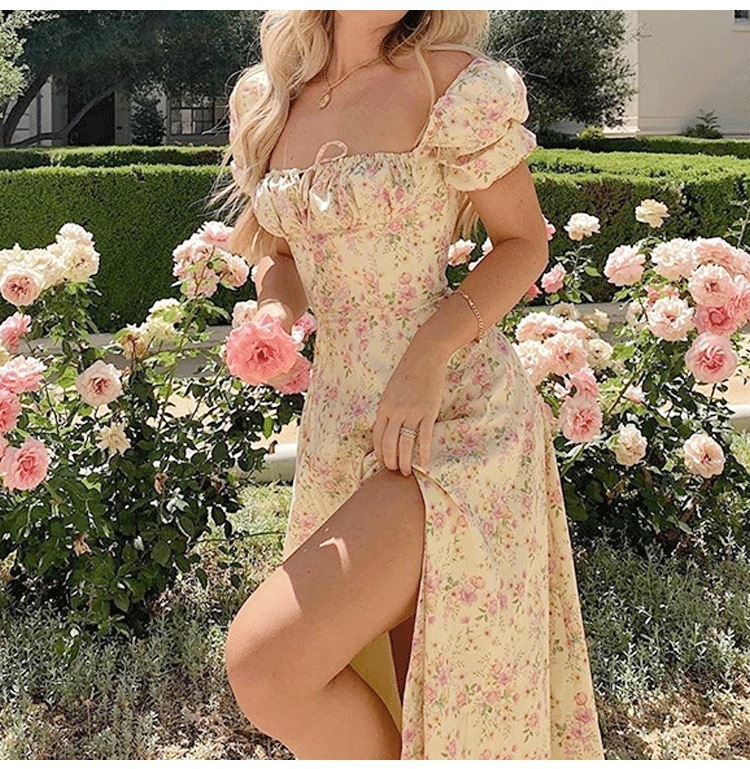 유럽과 미국의 목가적 인 공주 스타일 홀리데이 스퀘어 칼라 한 캐릭터 레이스 업 할로우 꽃 반팔 원피스 여름을위한 긴 원피스 분할스토어 가기