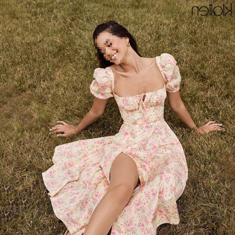 유럽과 미국의 목가적 인 공주 스타일 홀리데이 스퀘어 칼라 한 캐릭터 레이스 업 할로우 꽃 반팔 원피스 여름을위한 긴 원피스 분할
