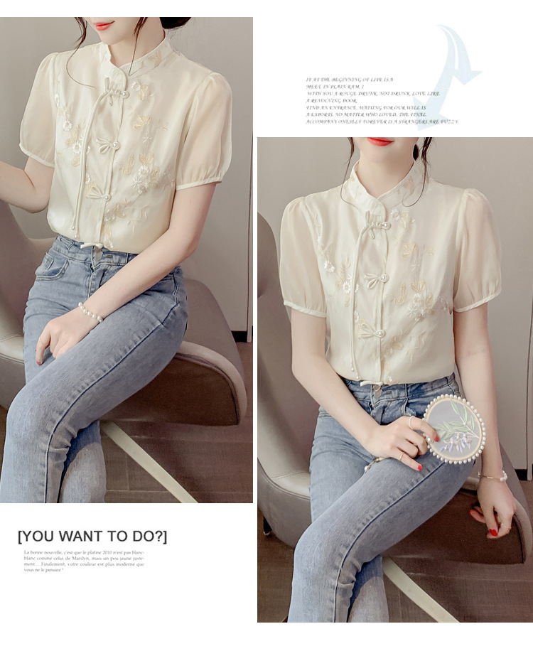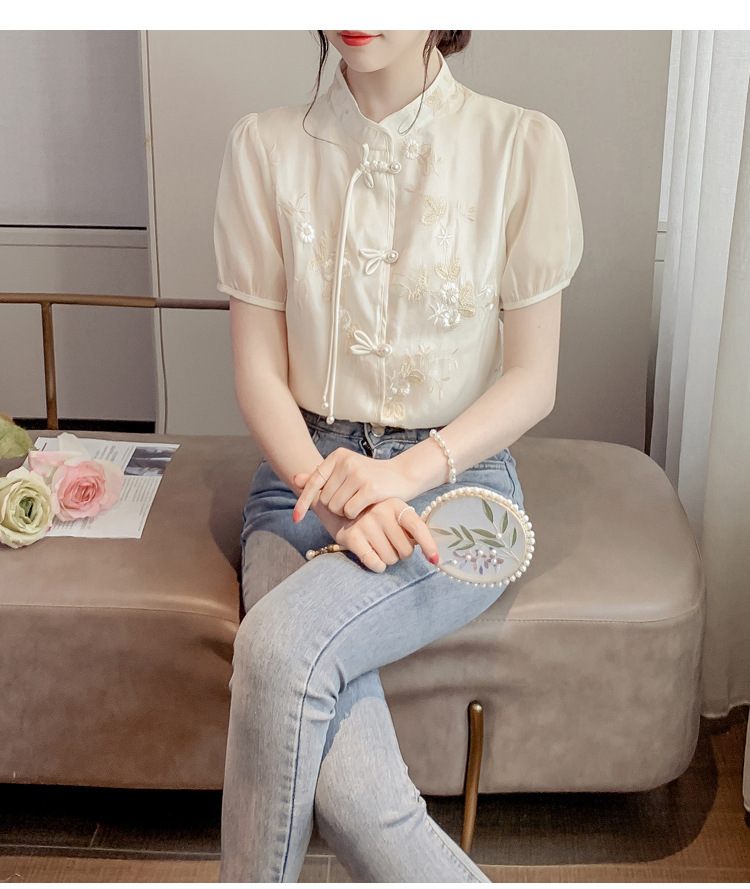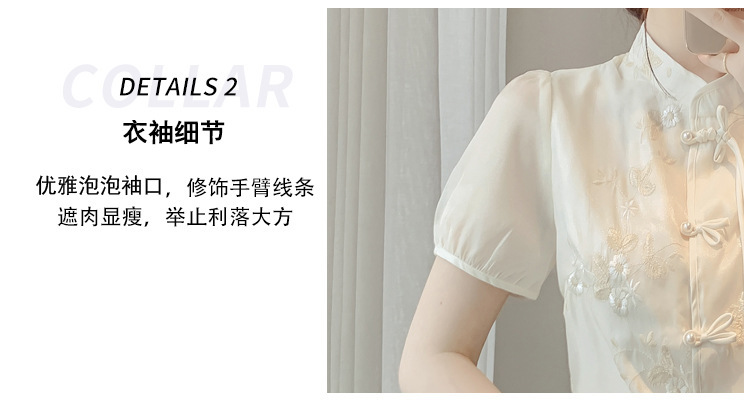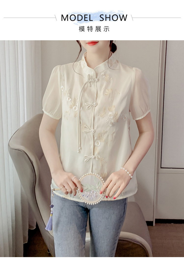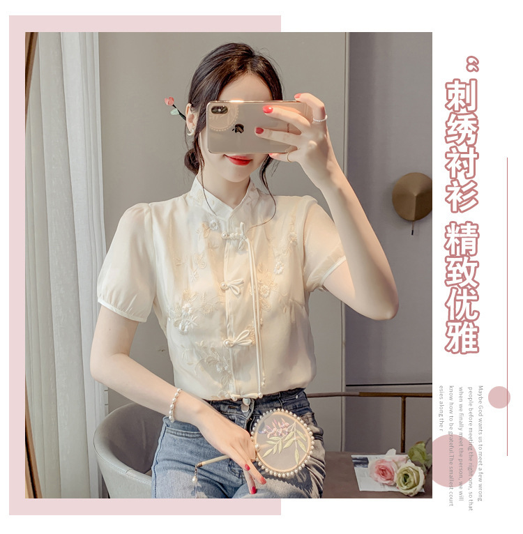 새로운 중국 스타일 국가 스타일 자수 반팔 셔츠 여성 여름 2025 새로운 디자인 레트로 청삼, 세로 칼라와 버클 탑스토어 가기