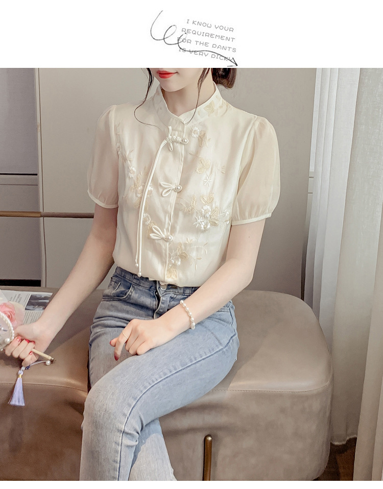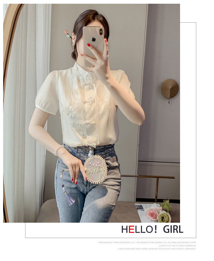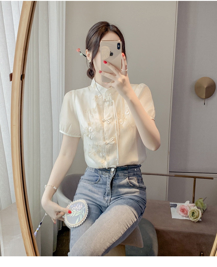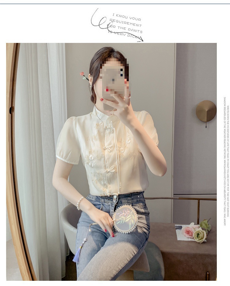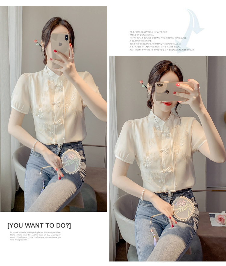 새로운 중국 스타일 국가 스타일 자수 반팔 셔츠 여성 여름 2025 새로운 디자인 레트로 청삼, 세로 칼라와 버클 탑스토어 가기