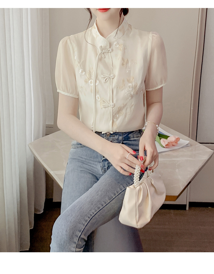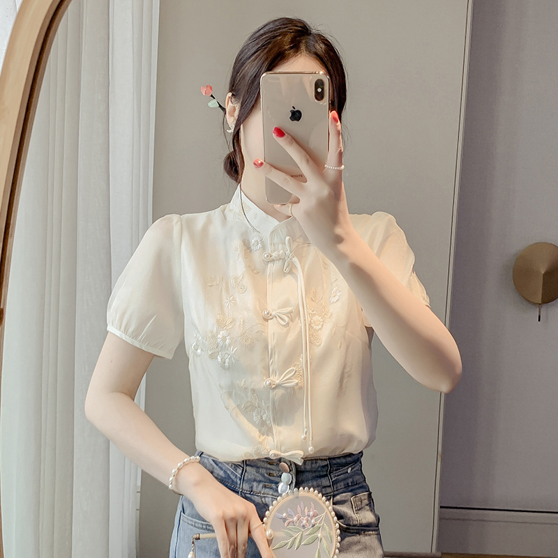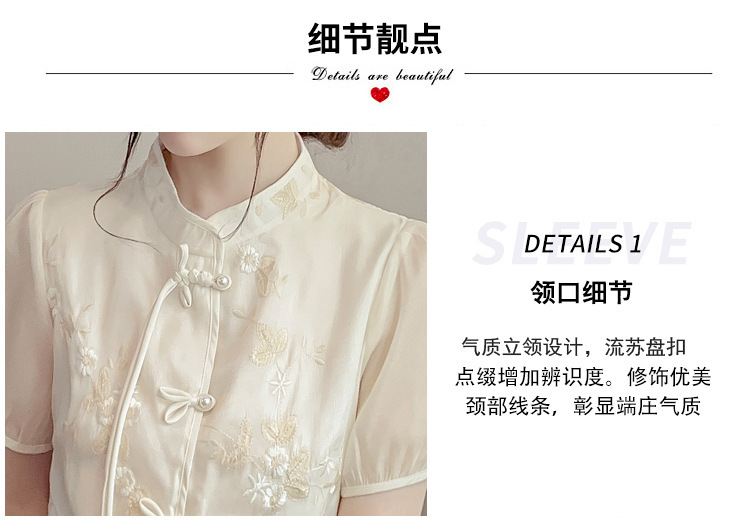새로운 중국 스타일 국가 스타일 자수 반팔 셔츠 여성 여름 2025 새로운 디자인 레트로 청삼, 세로 칼라와 버클 탑