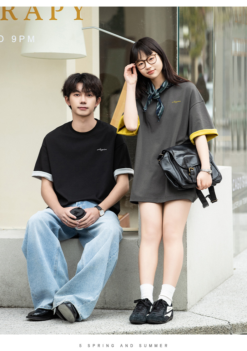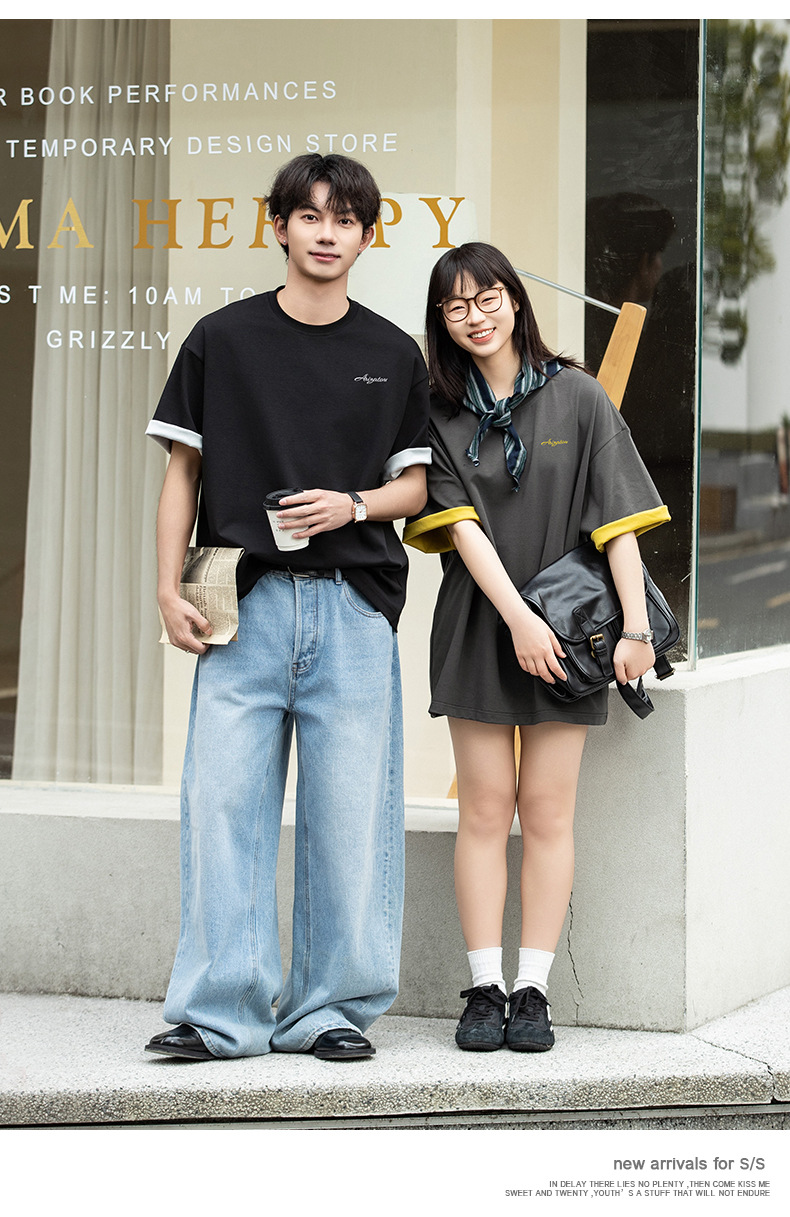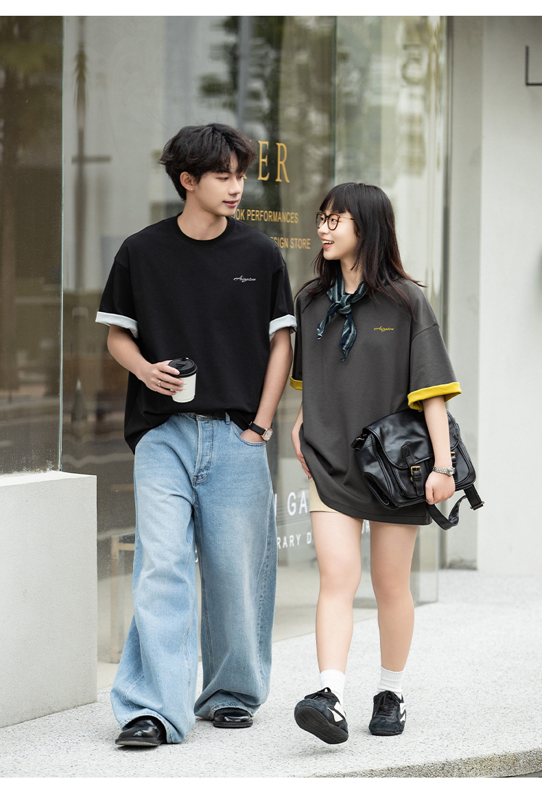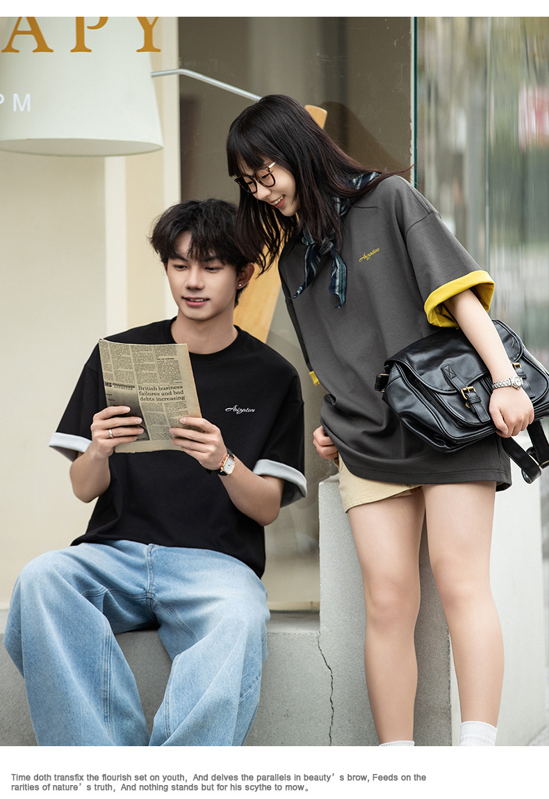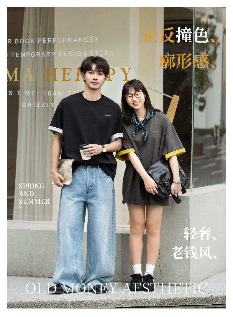 가벼운 럭셔리 올드 머니 대조 문자 자수 반팔 티셔츠 남성 여름 커플 루즈 트렌디 브랜드 캐주얼 반팔 티셔츠 q스토어 가기