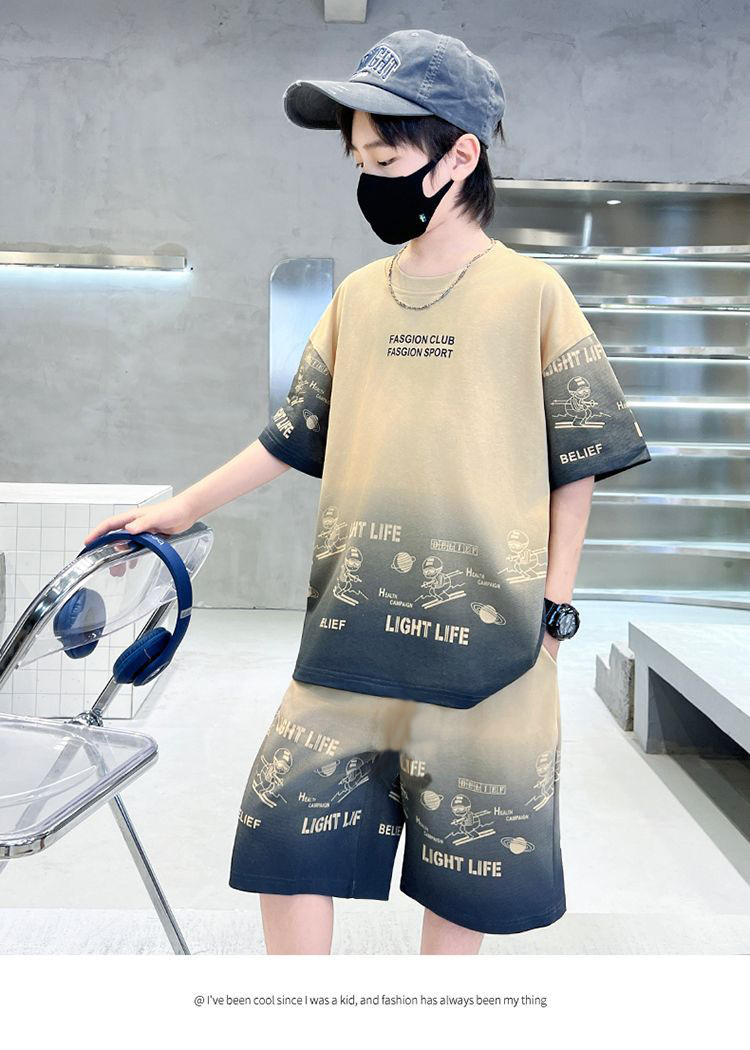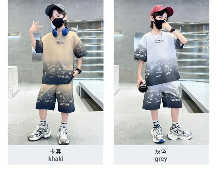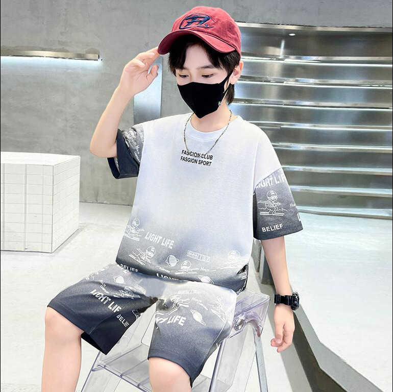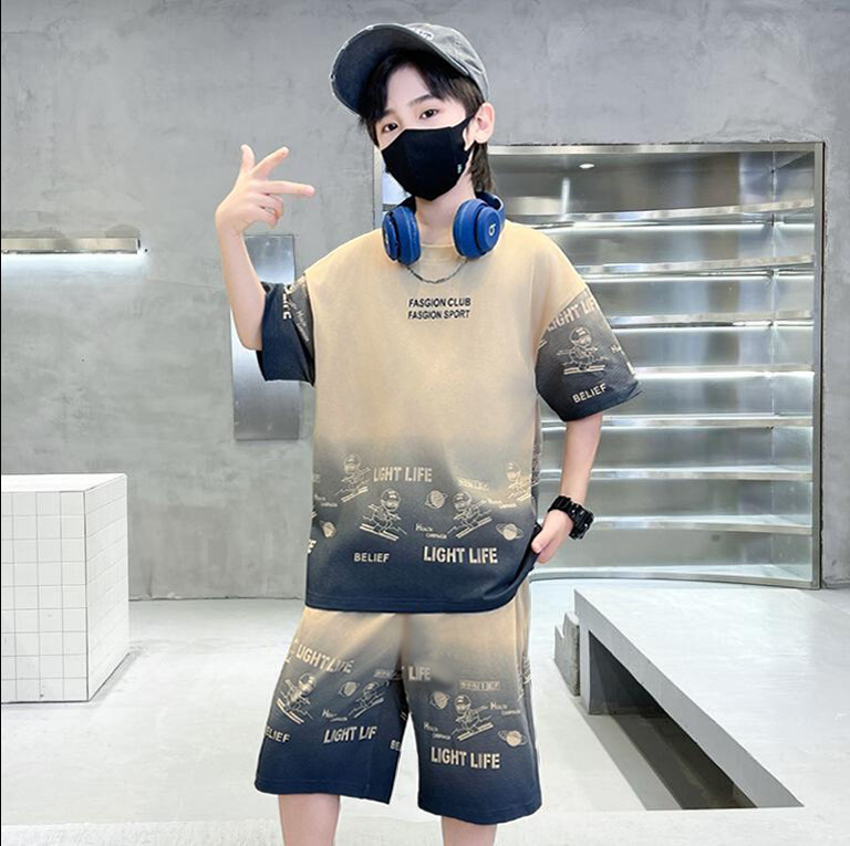 여름 새로운 어린이 반팔 반바지 세트 작은 소년 그라디언트 컬러 스포츠 캐주얼 외모 느슨한 투피스 세트