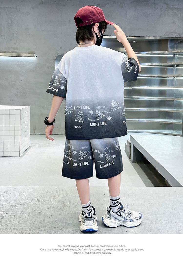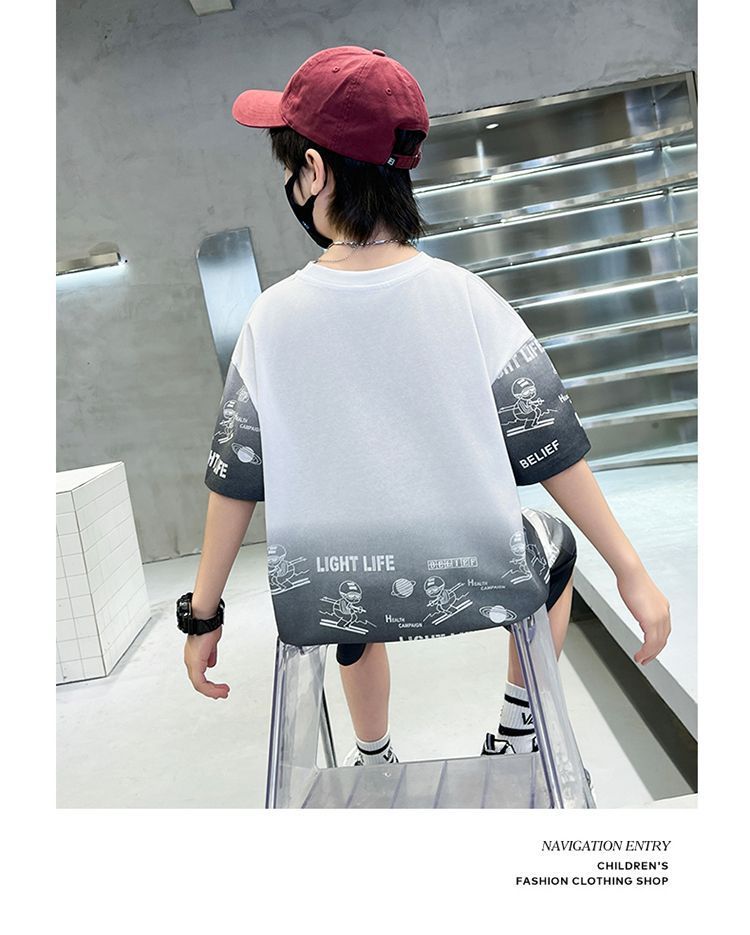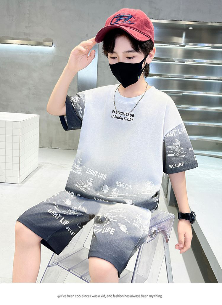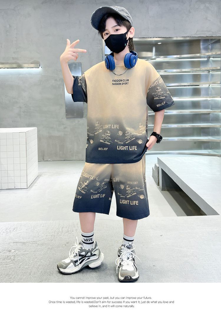 여름 새로운 어린이 반팔 반바지 세트 작은 소년 그라디언트 컬러 스포츠 캐주얼 외모 느슨한 투피스 세트스토어 가기