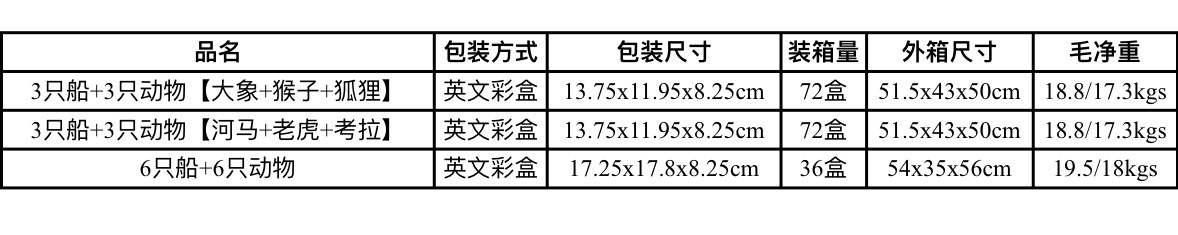 箱规:6小船+6手偶:54*43*50cm(36装)重量:17.2kg