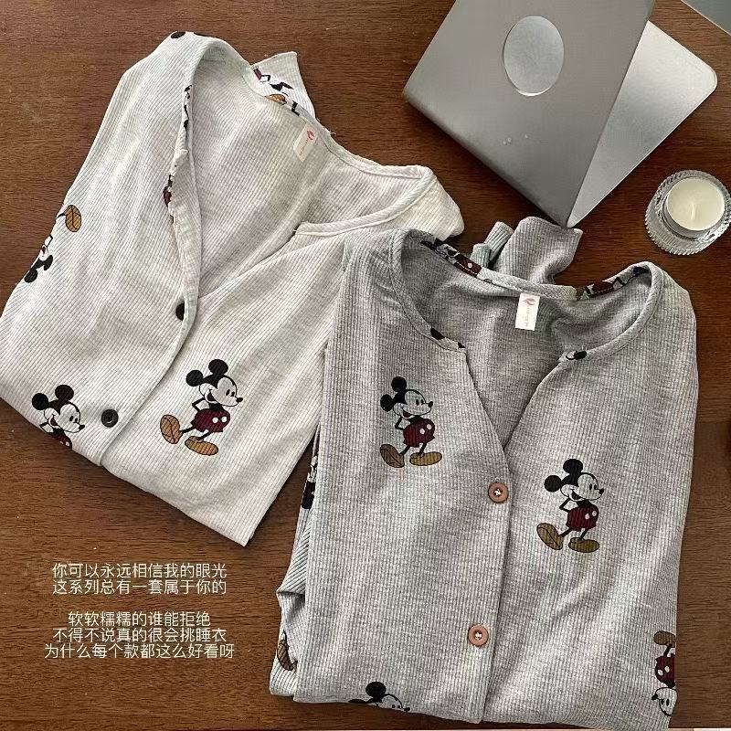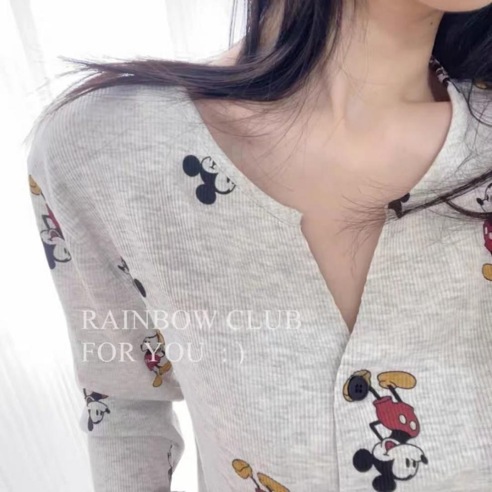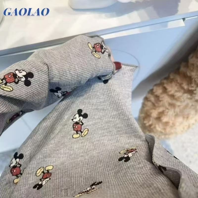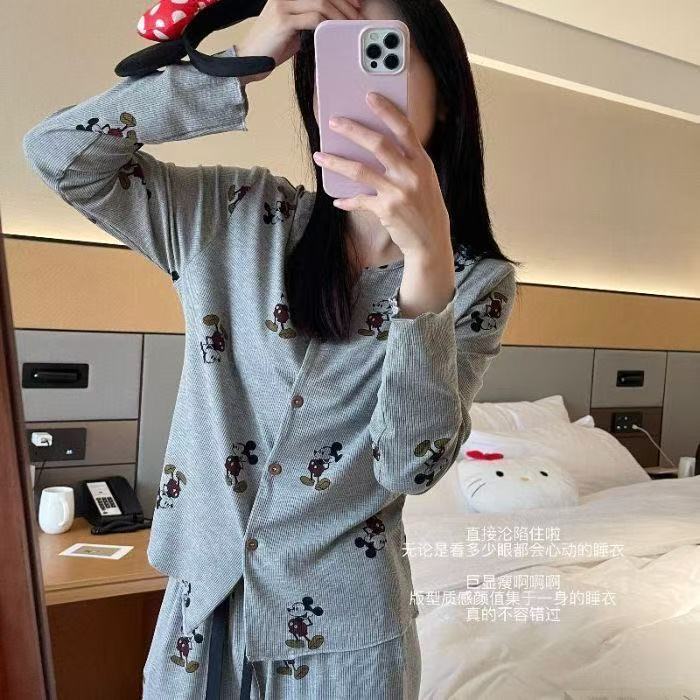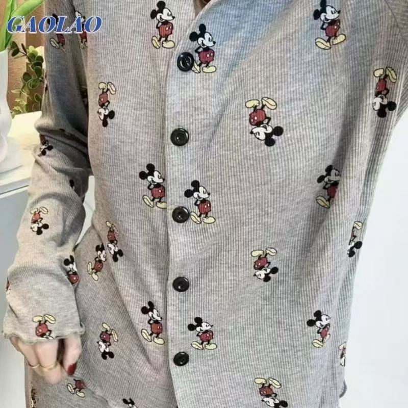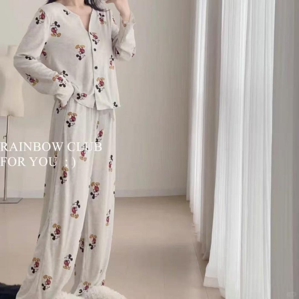 부드러운 왁스 피부 친화적 인 미키 파자마 여성 아이스 실크 봄과 여름 새로운 2025 만화 긴 소매 바지 홈 옷 두 조각 세트스토어 가기