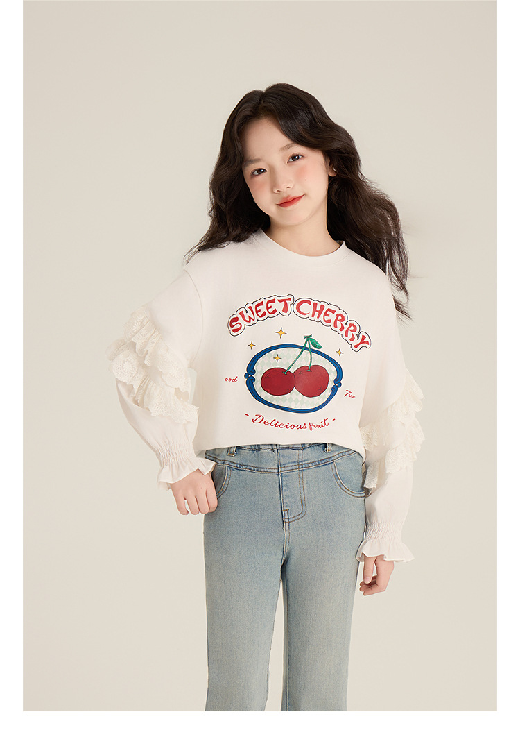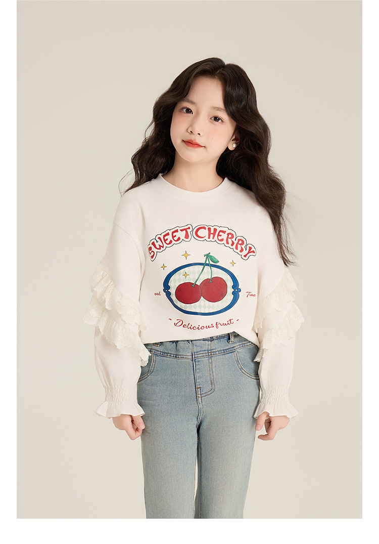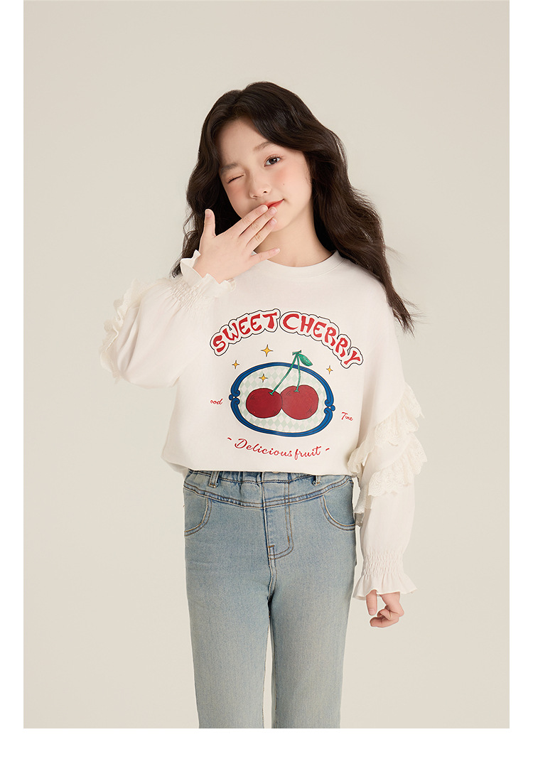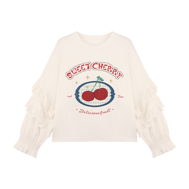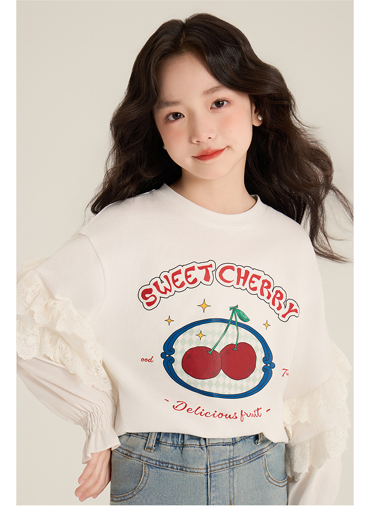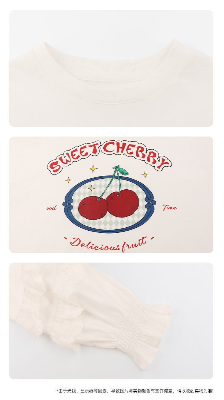 Amybaby 소녀 최고 봄 2025 새로운 디자인 미국 복고풍 작은 체리 인쇄 긴 소매 T스토어 가기