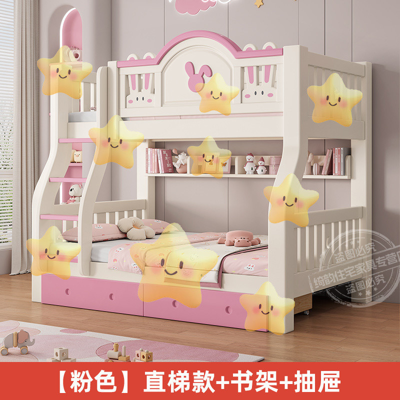 • (핑크색 침대에는 매트리스가 포함되어 있습니다.) 직선형 사다리 스타일 + 책장 + 서랍 + 위층 배송