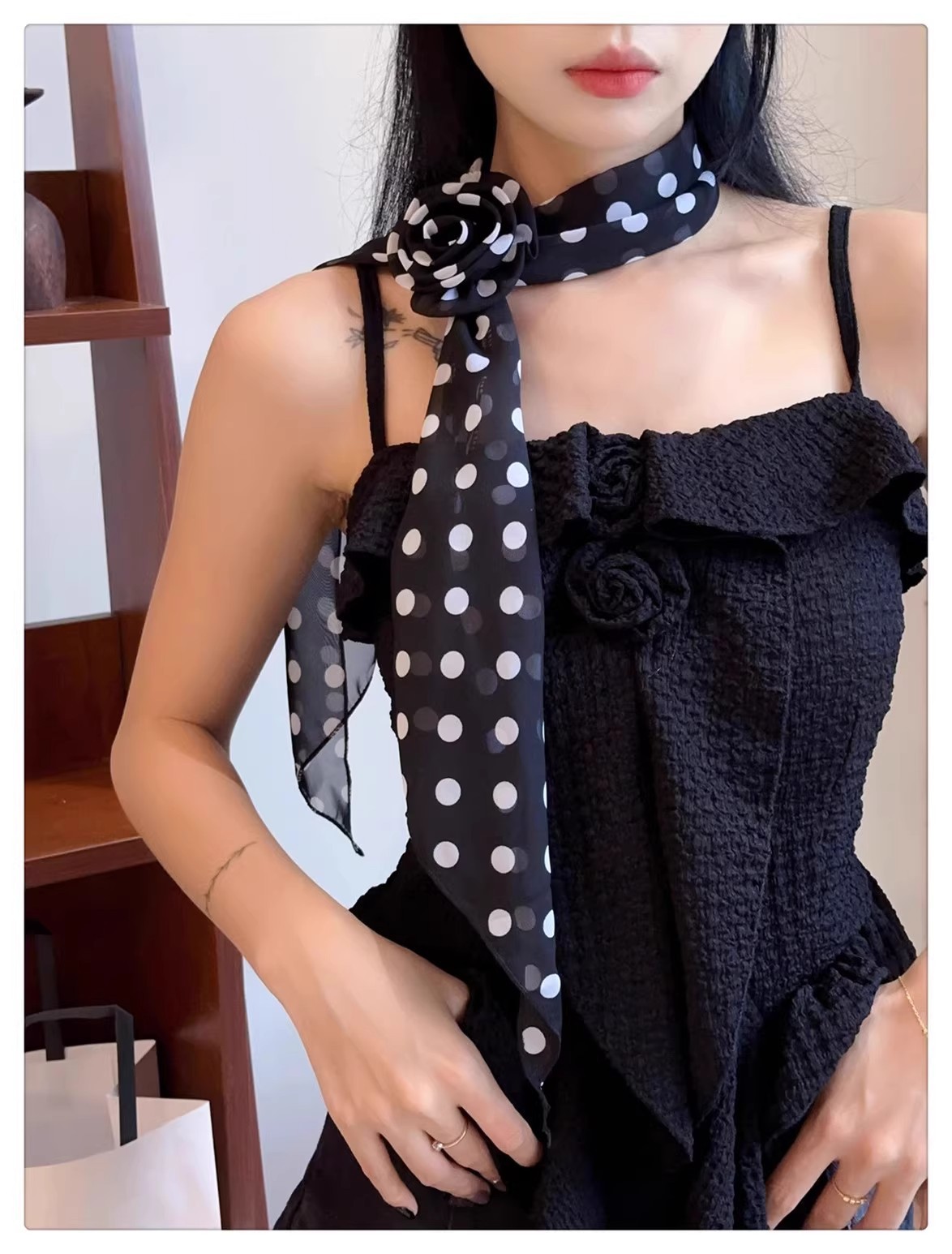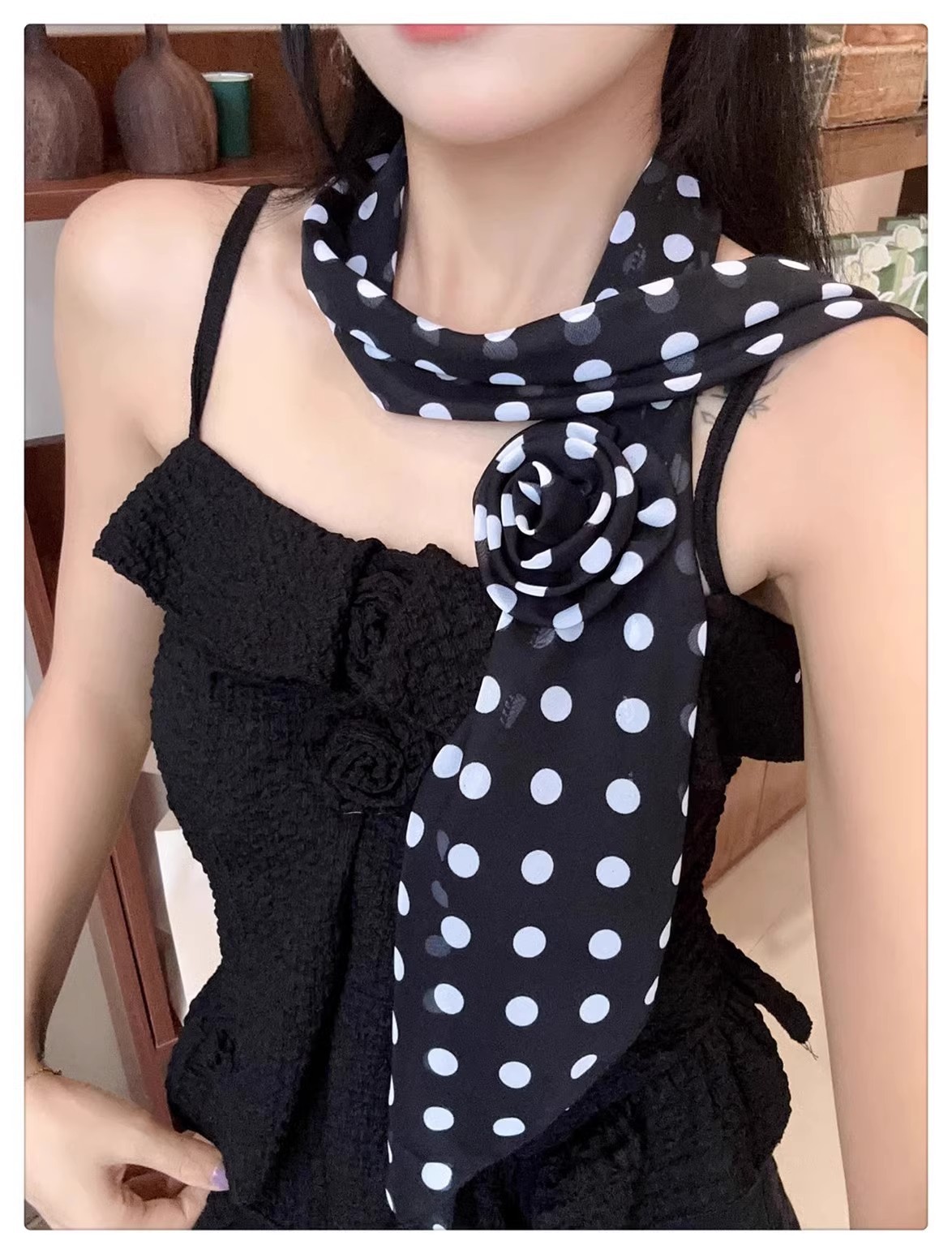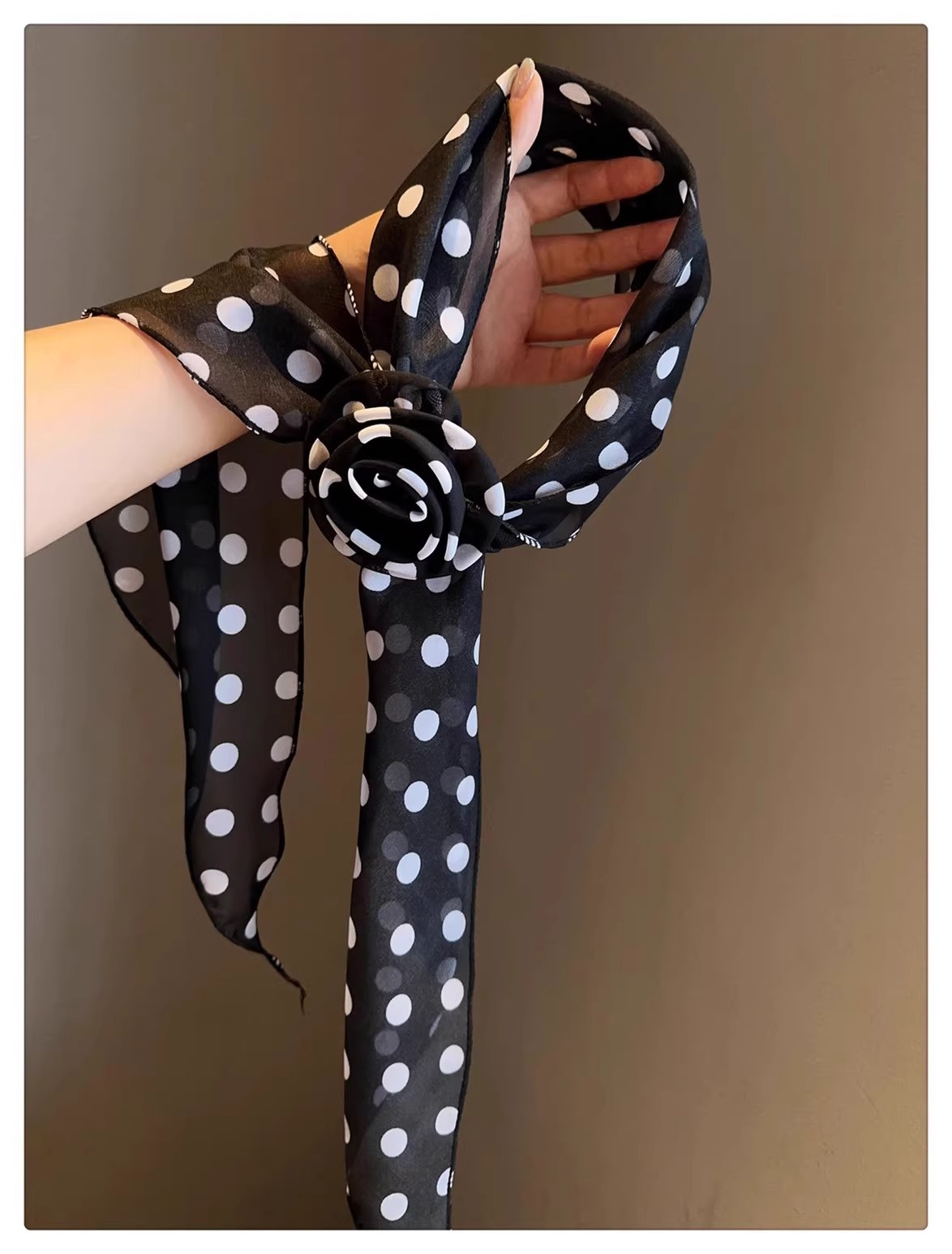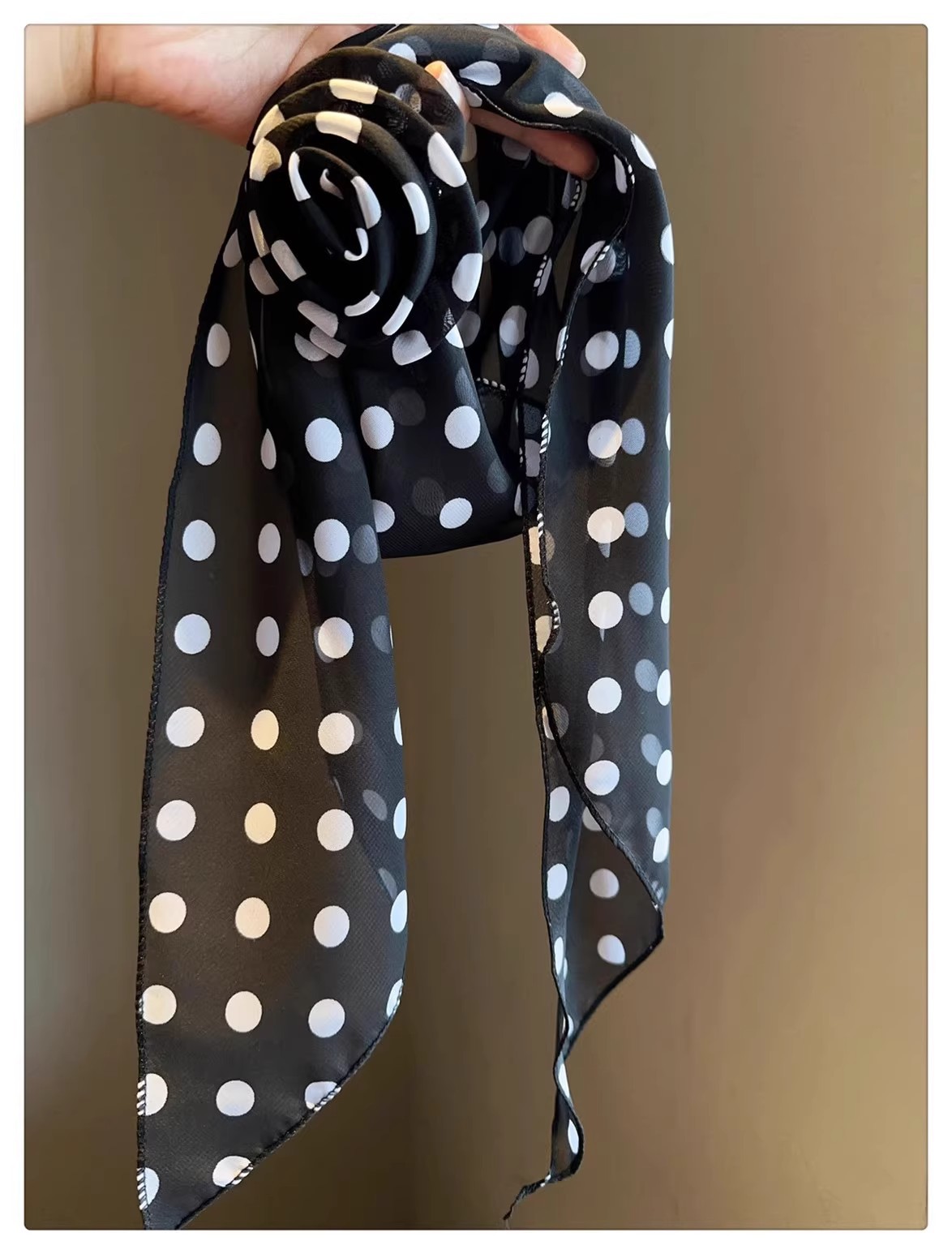 빈티지 간단한 장미 긴 스카프 여자 밀레니엄 스파이스 걸스 블랙 웨이브 도트 리본 봄과 여름을위한 모든 경기 장식 스카프