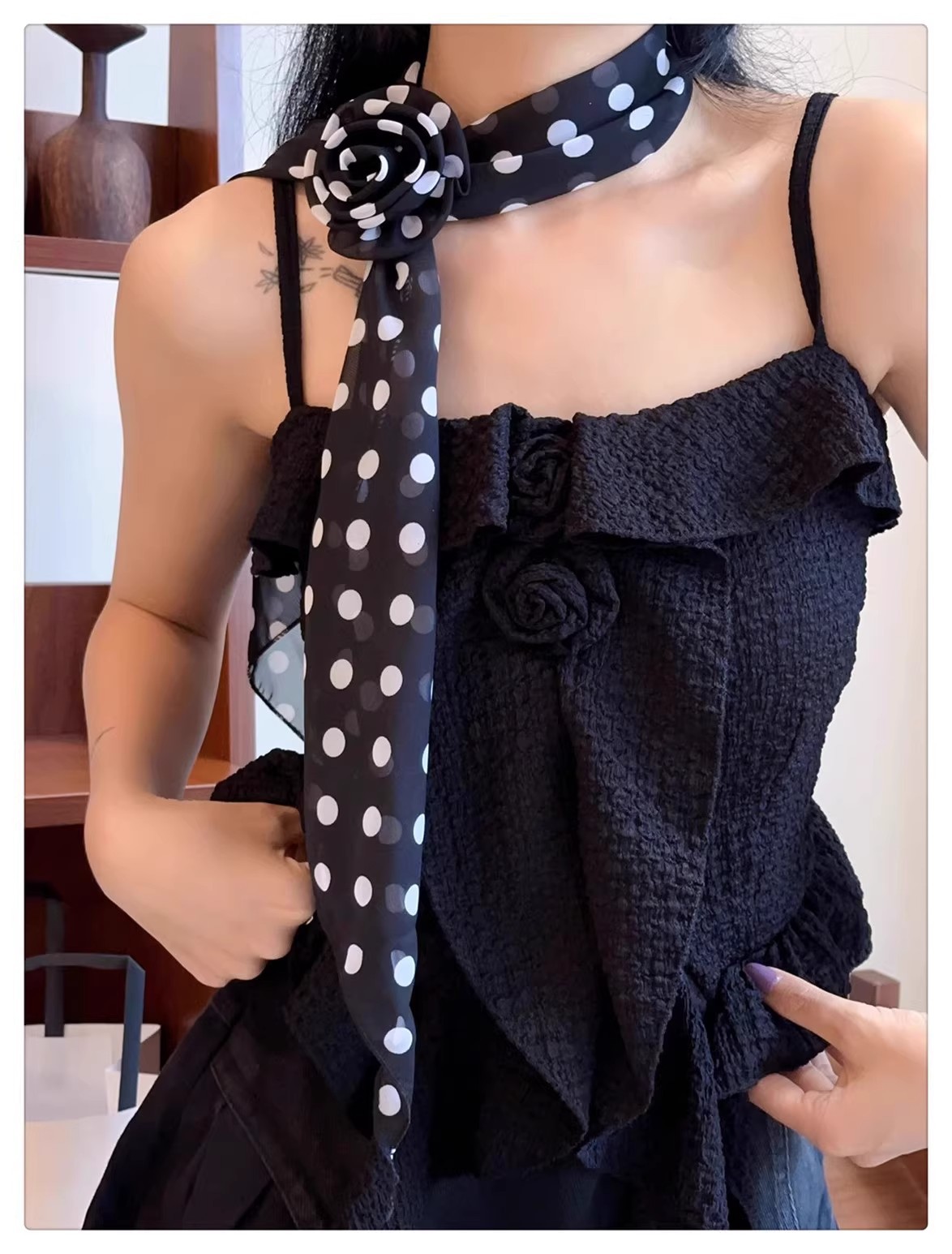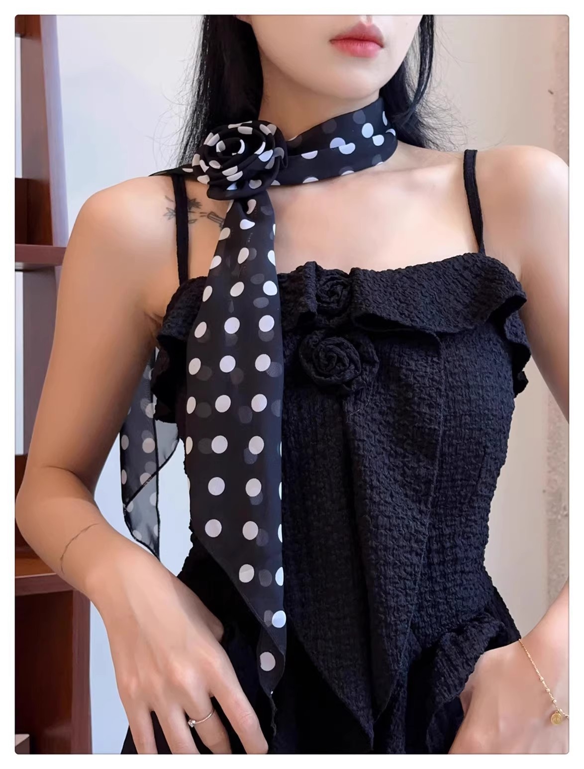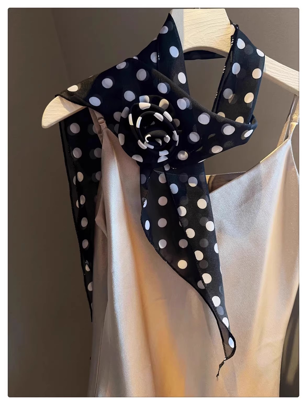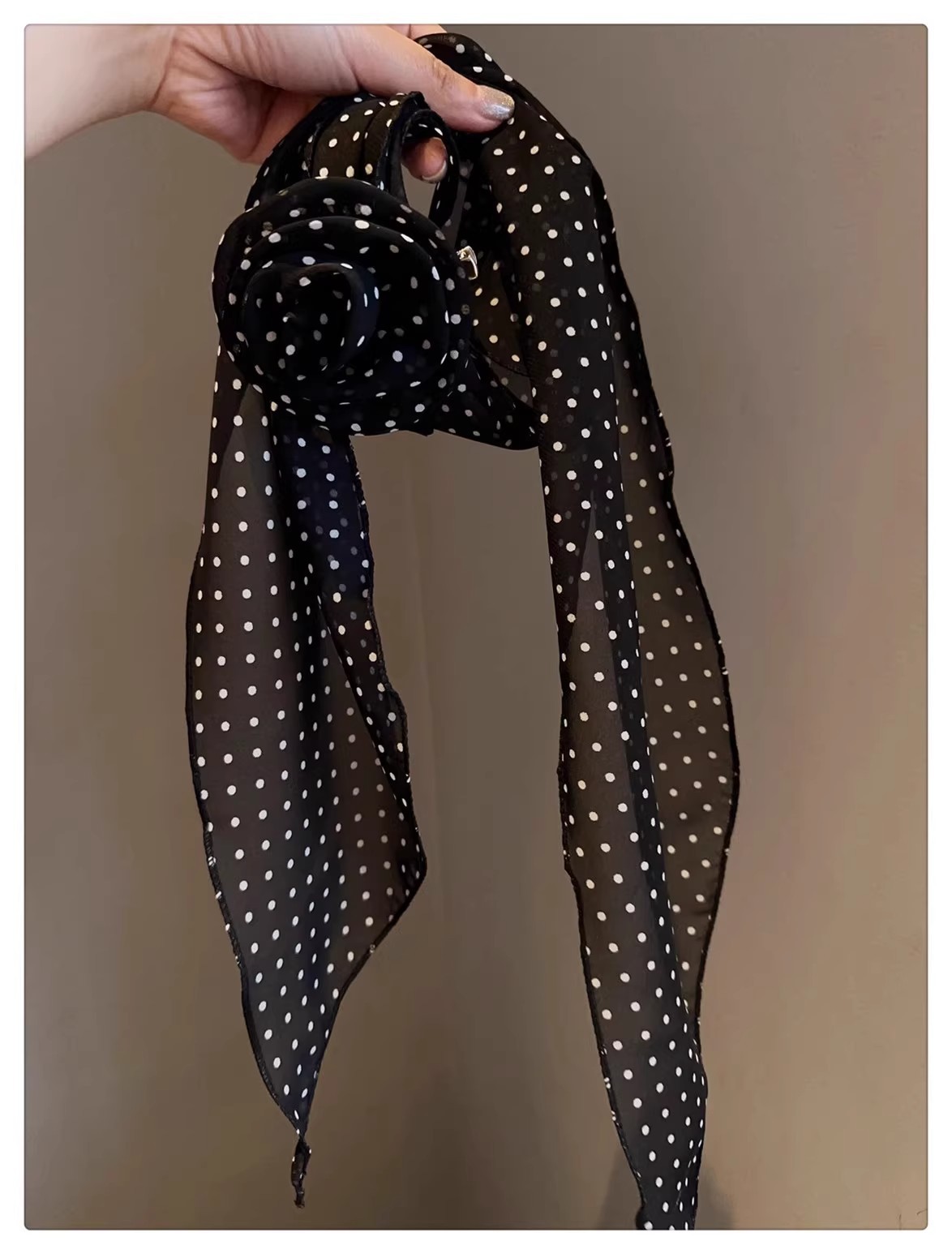 빈티지 간단한 장미 긴 스카프 여자 밀레니엄 스파이스 걸스 블랙 웨이브 도트 리본 봄과 여름을위한 모든 경기 장식 스카프