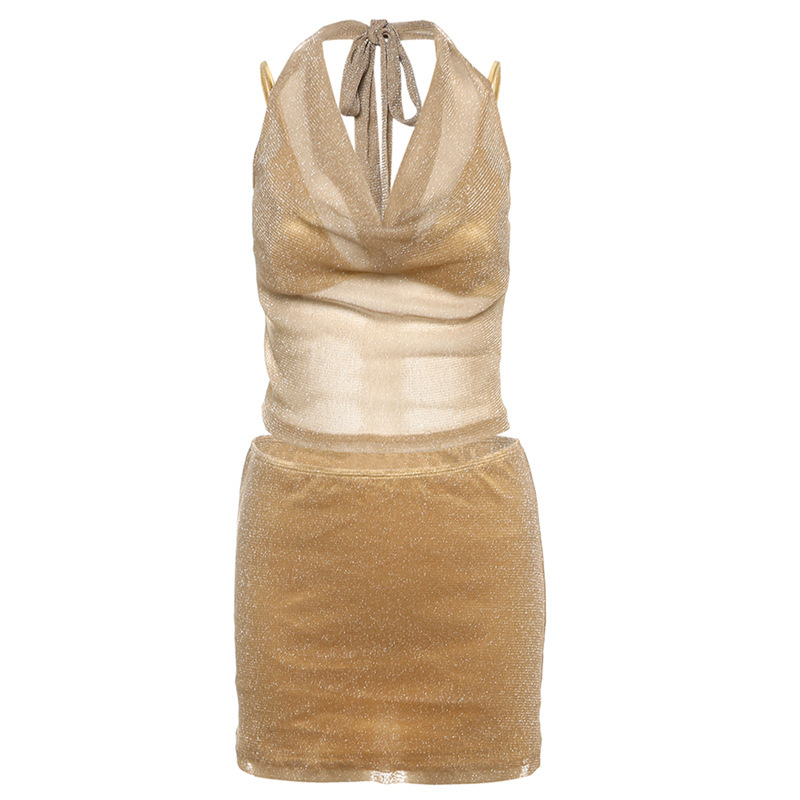 유럽과 미국 스타일 2025 봄과 여름 새로운 여성의 섹시한 인테리어 솔리드 컬러 밝은 실크 넥 탑 힙 스커트 3 피스 세트스토어 가기