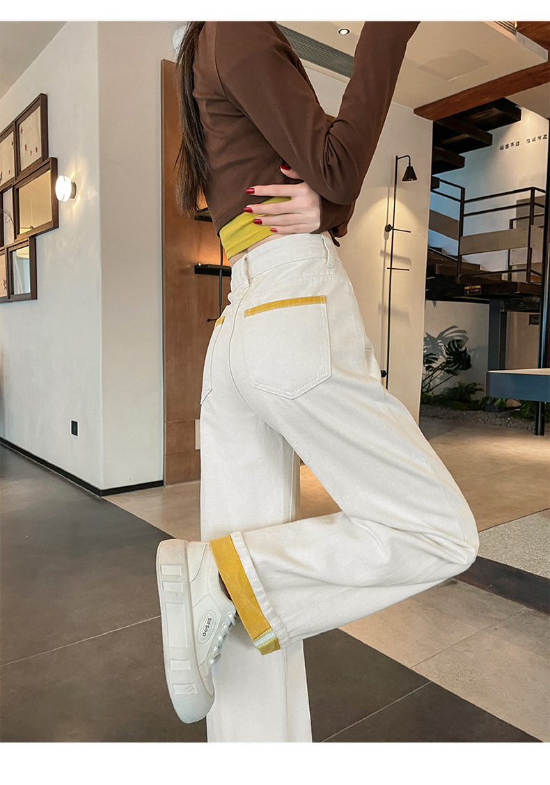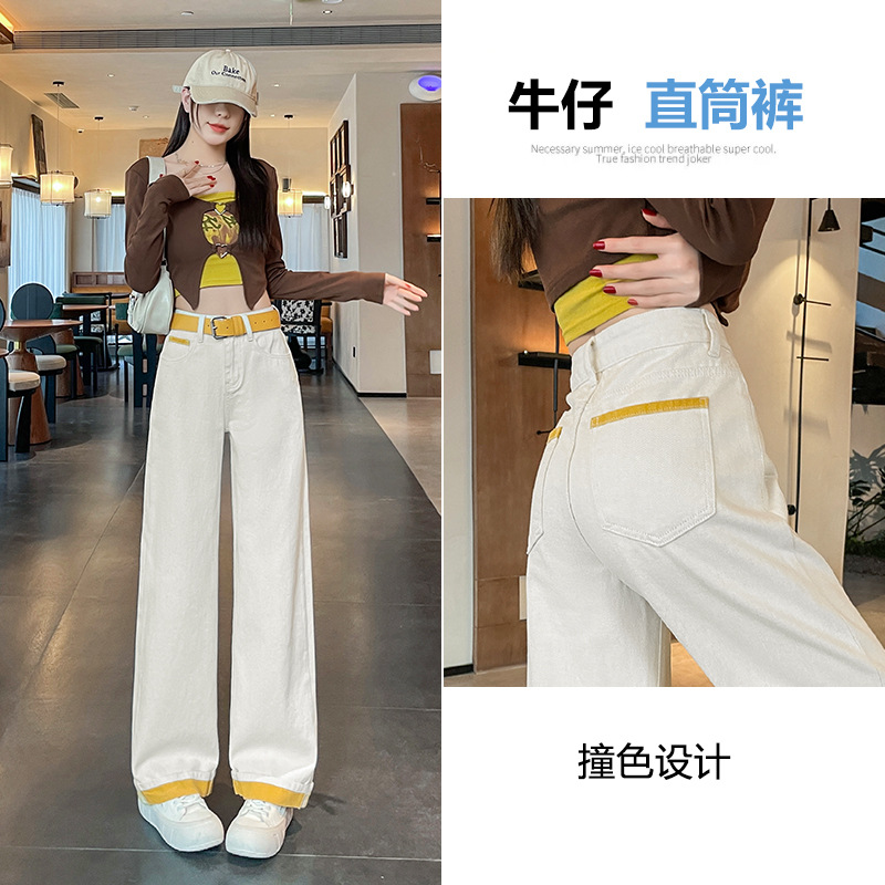 2025년 봄 여름 여성용 화이트 대비 컬러 와이드 레그 청바지 새로운 핫 스타일 하이 웨이스트 루즈 컬링 스트레이트 팬츠