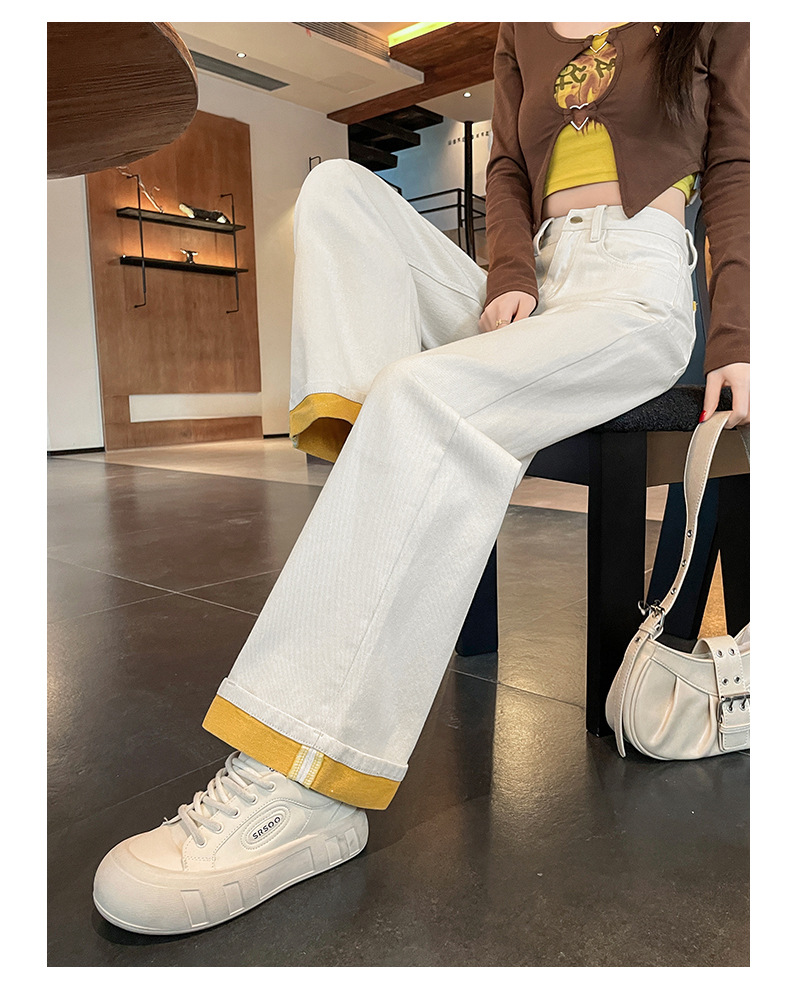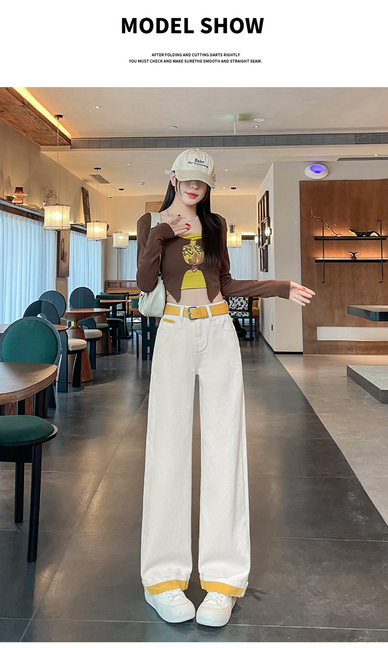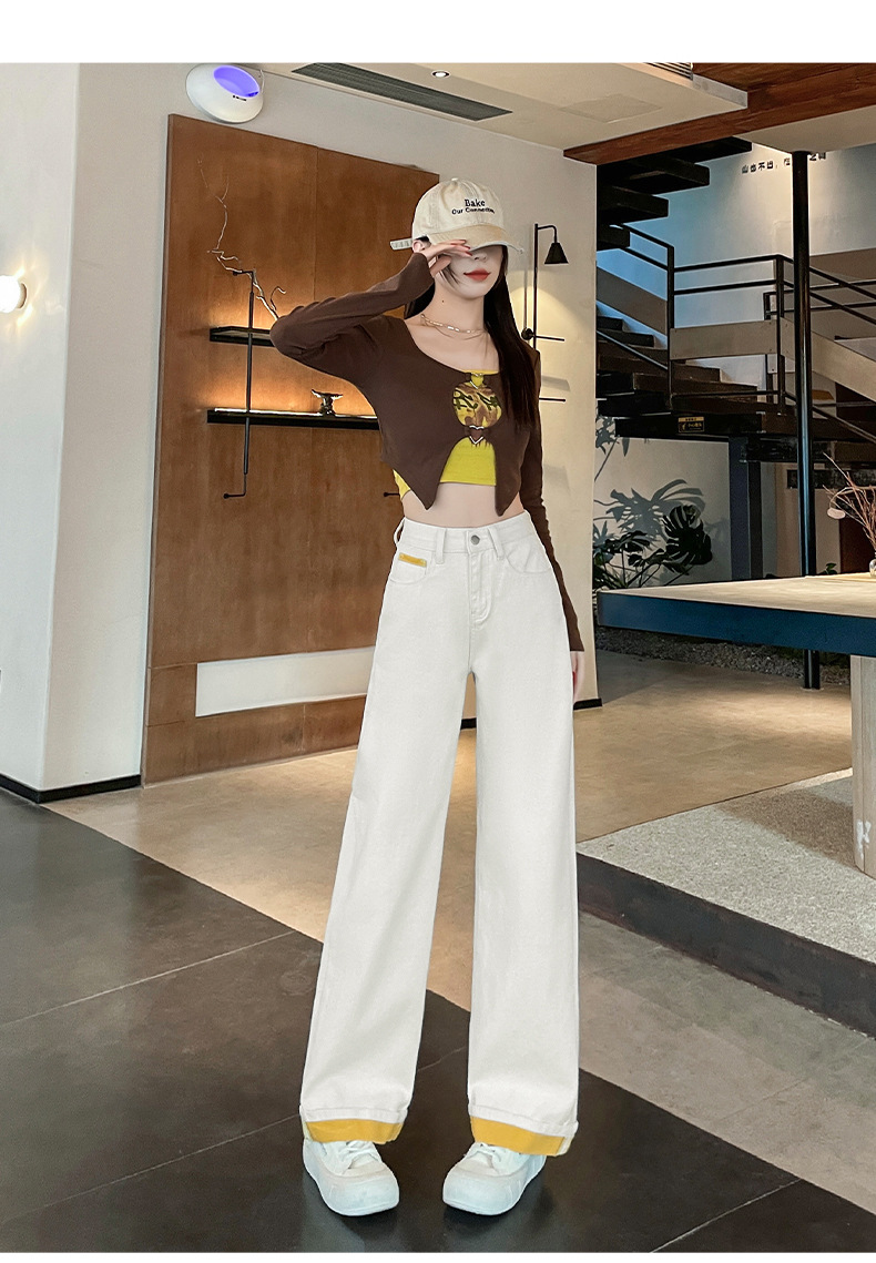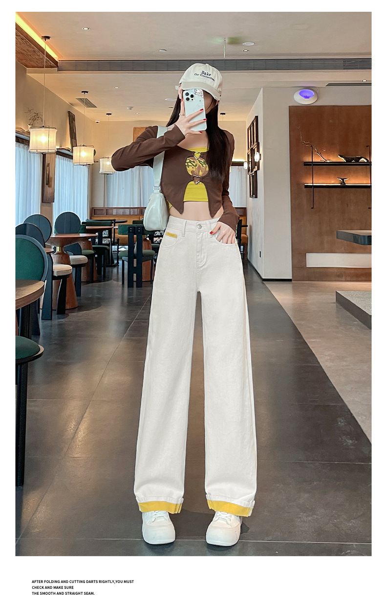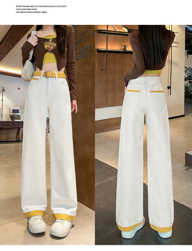 2025년 봄 여름 여성용 화이트 대비 컬러 와이드 레그 청바지 새로운 핫 스타일 하이 웨이스트 루즈 컬링 스트레이트 팬츠스토어 가기